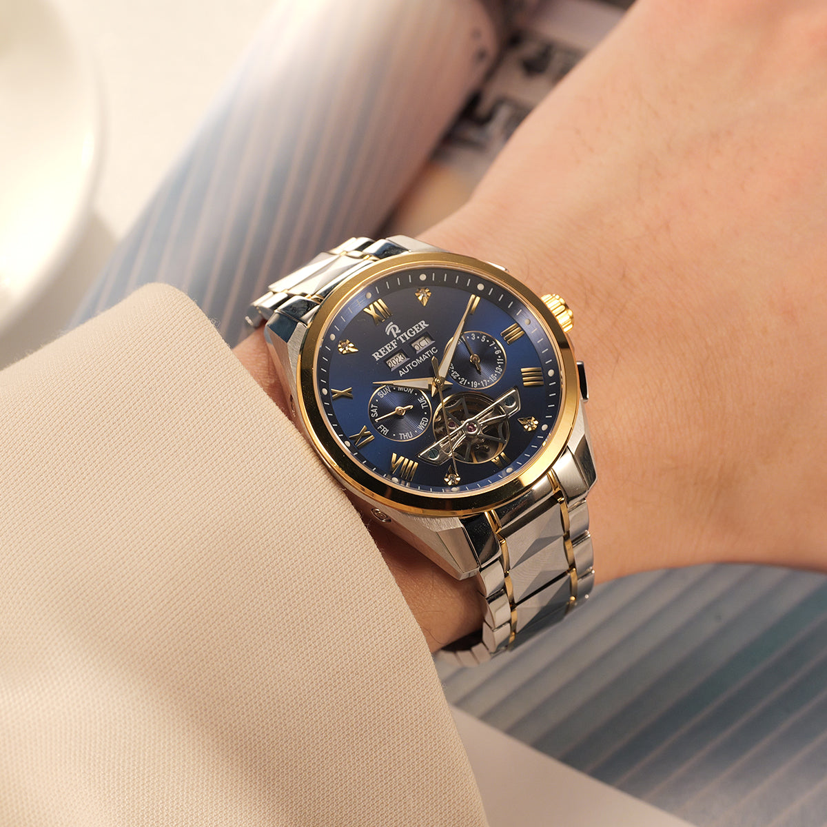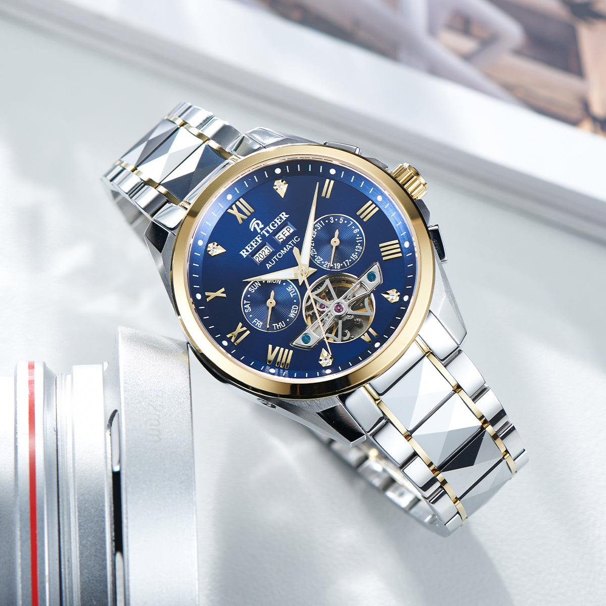 Dial Design: Blue Dial, Watch face is designed with year, month, date, day, luminous hands display & tourbillon style dial.