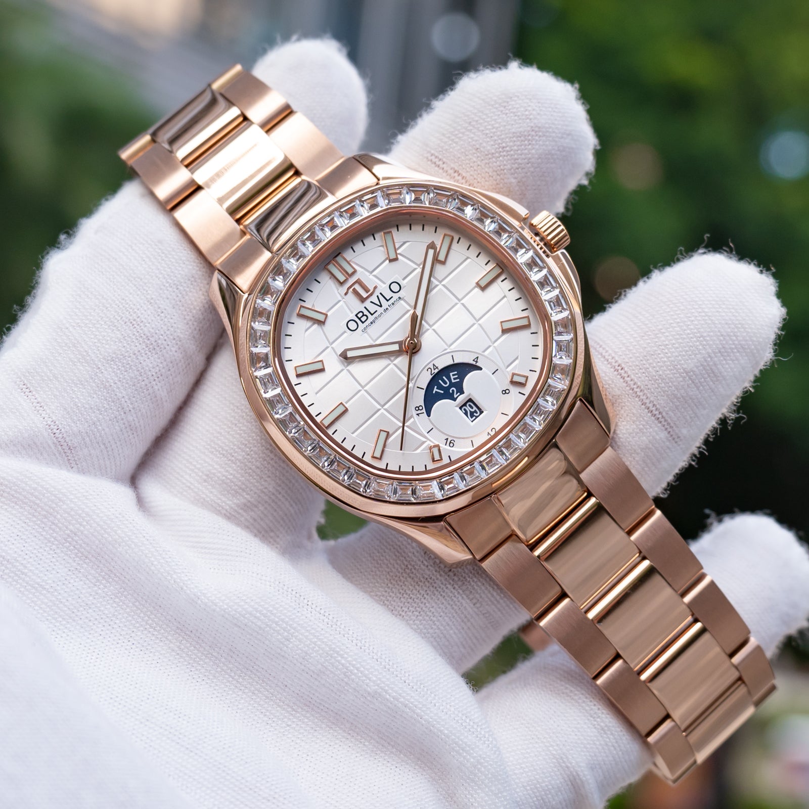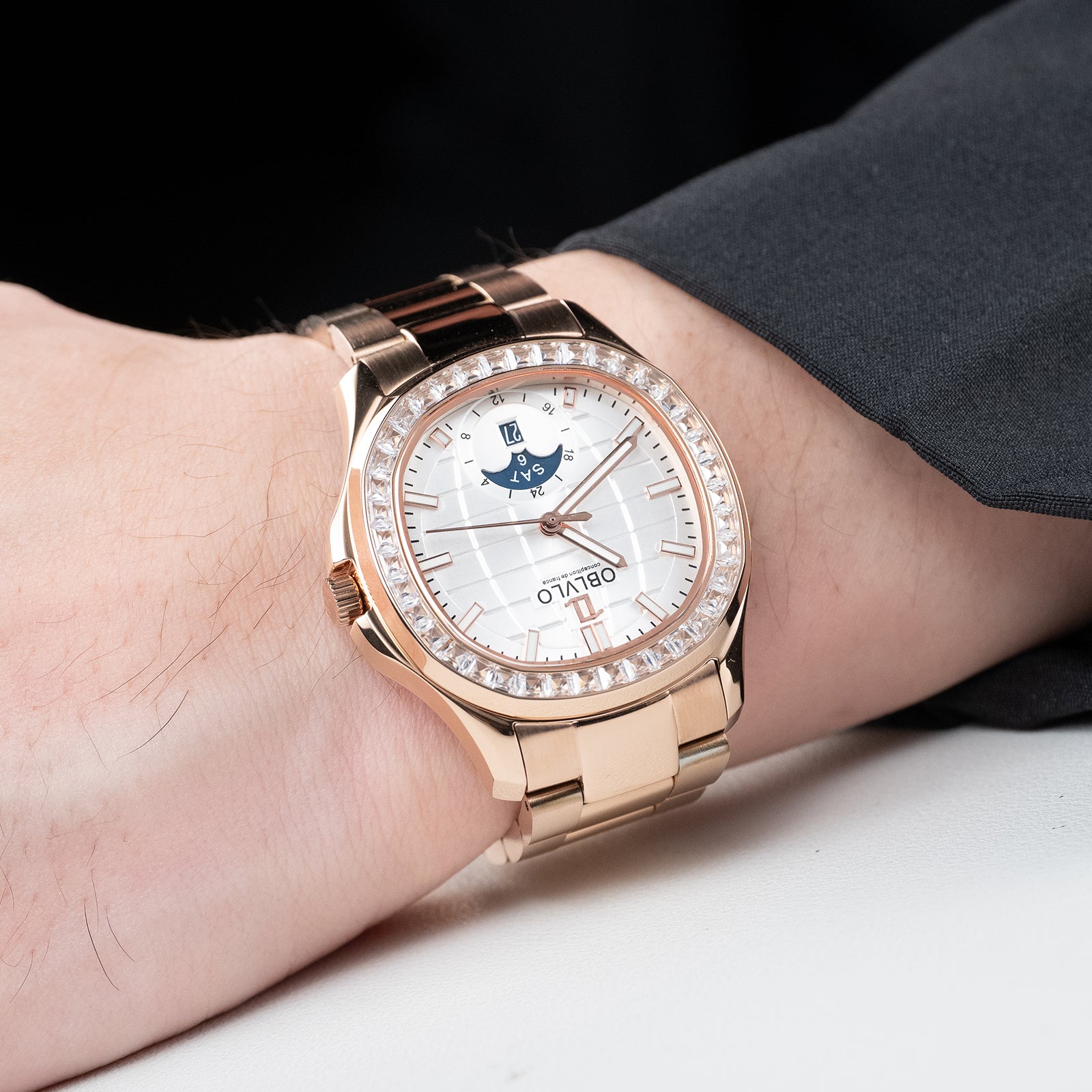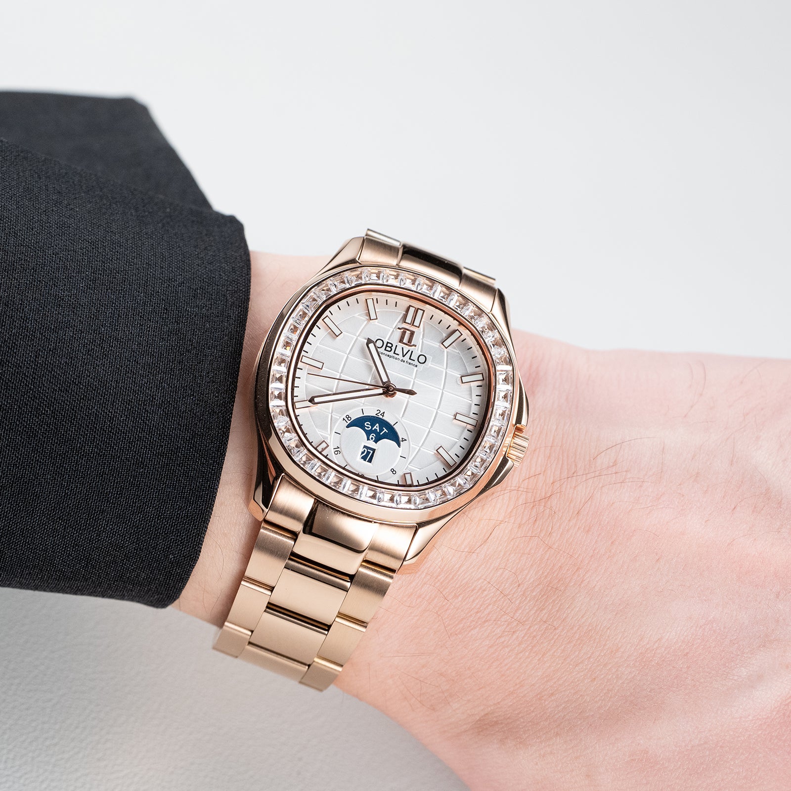 OBLVLO FM-SL-DD-D Rose Gold 39mm Square & White Dial Automatic Moonphase Business Wrist Watches