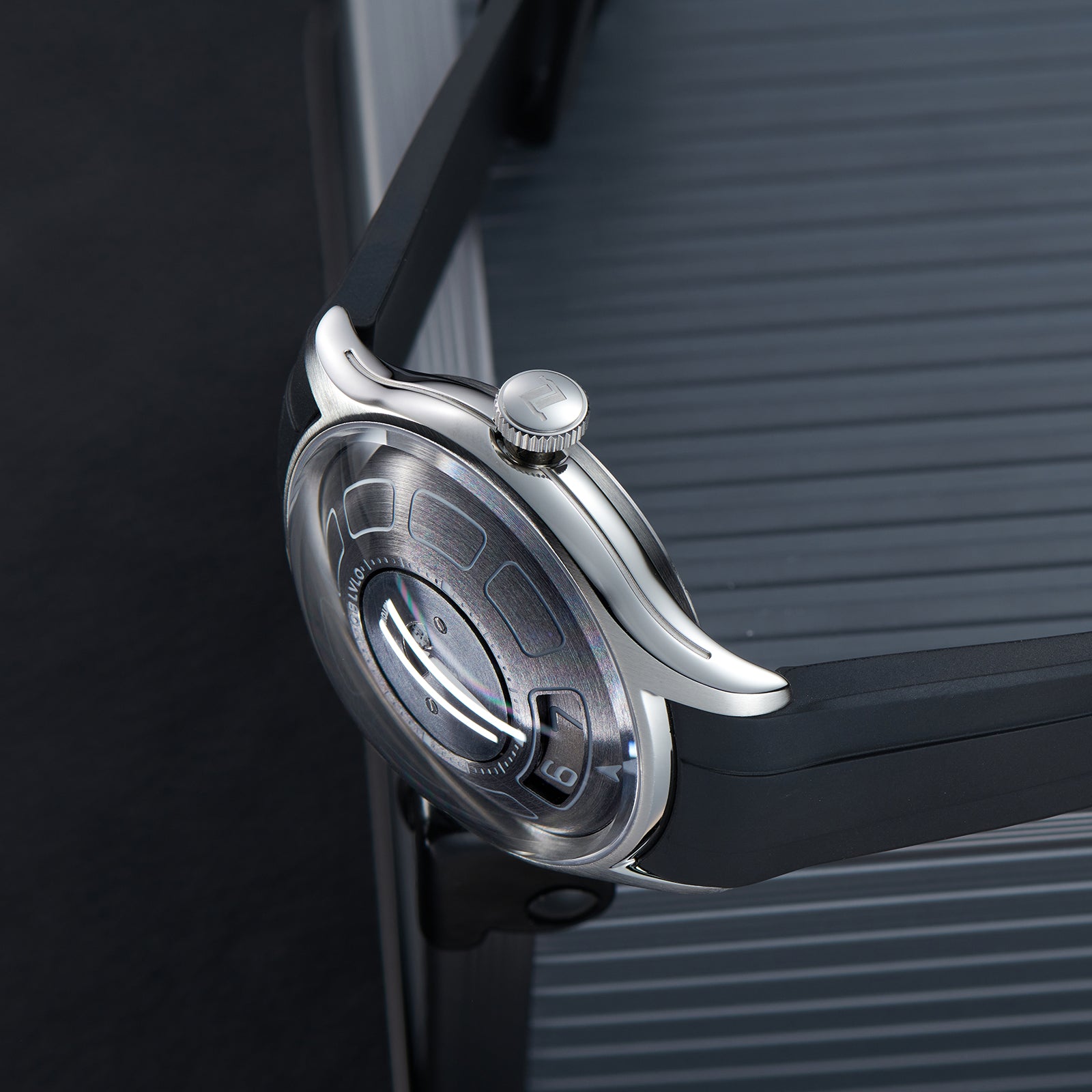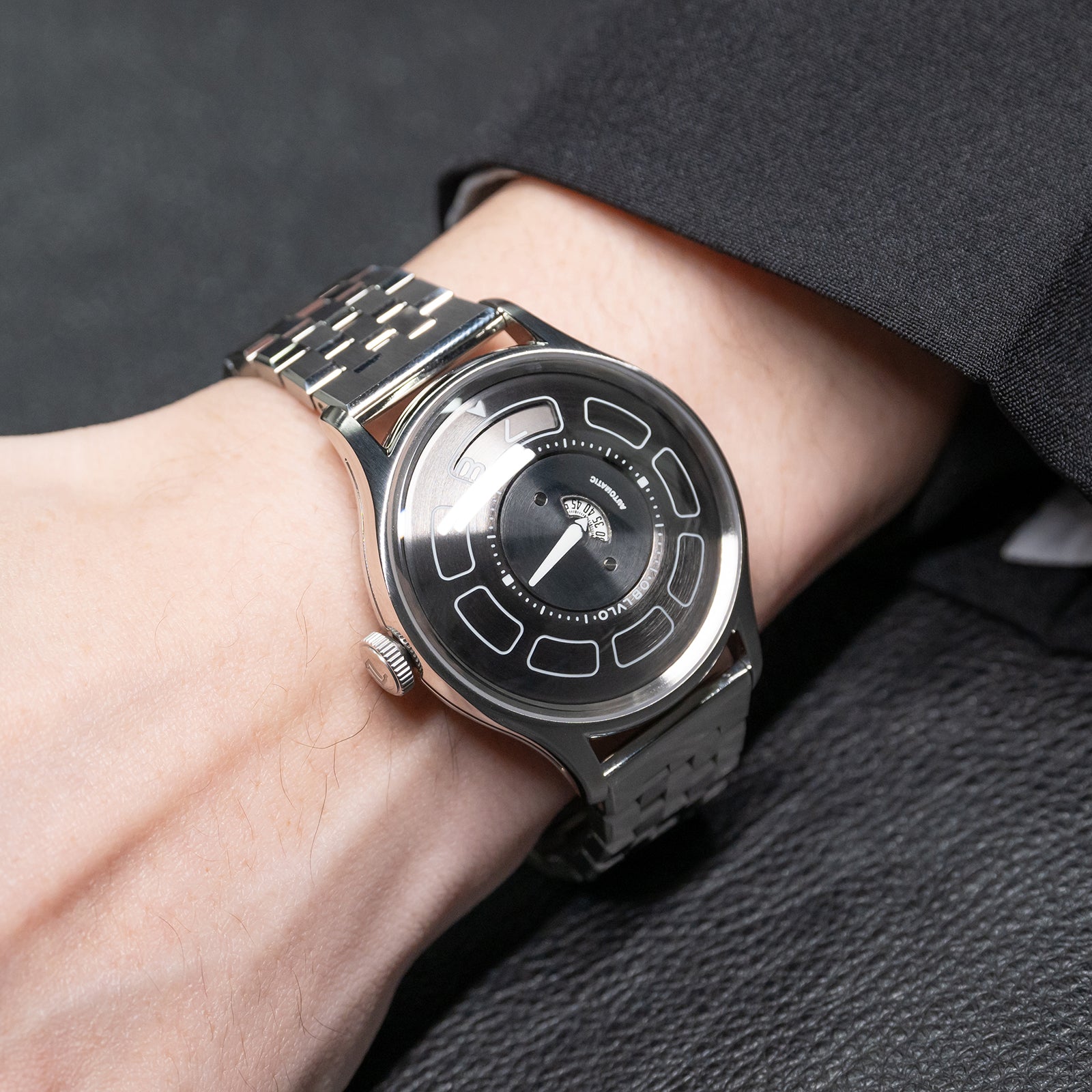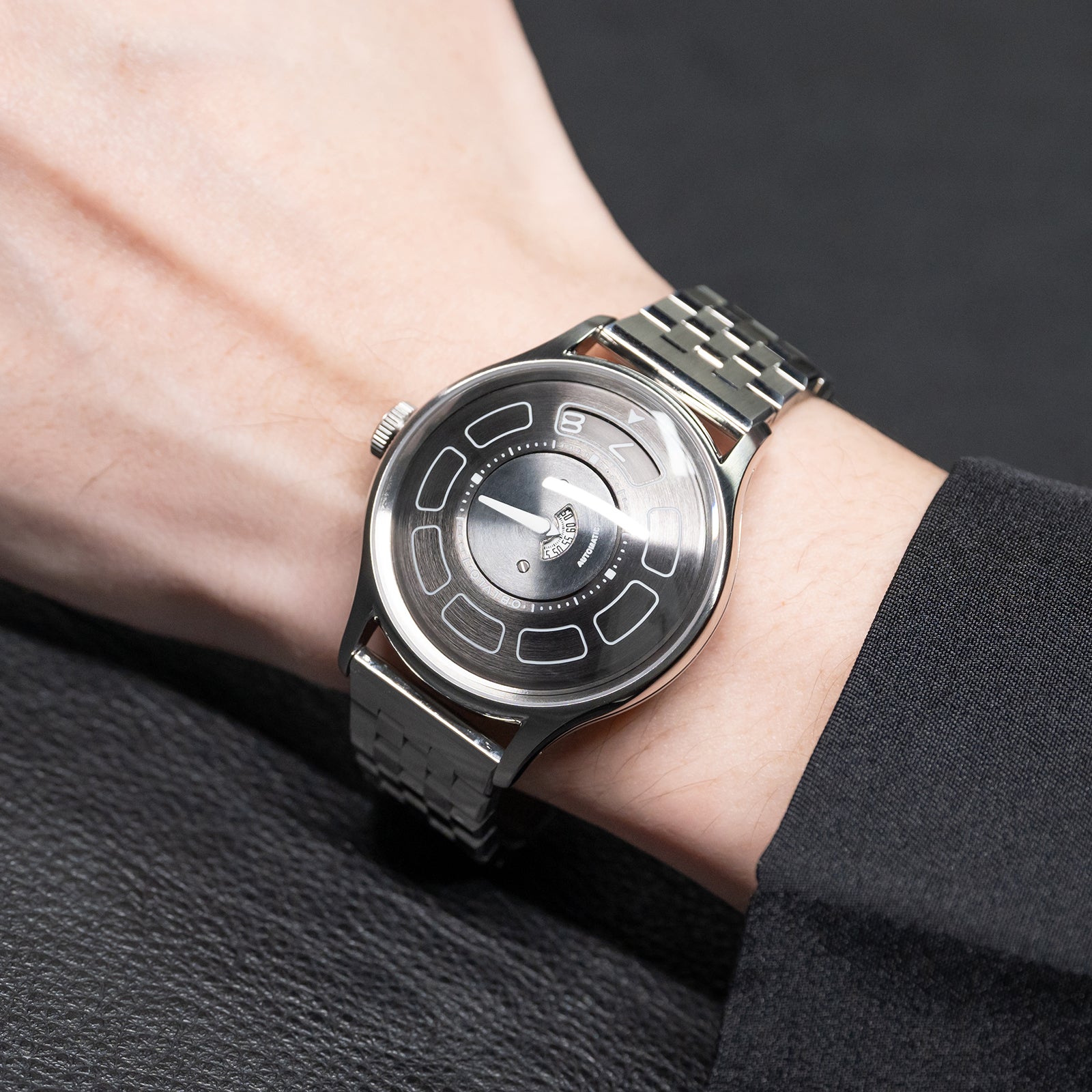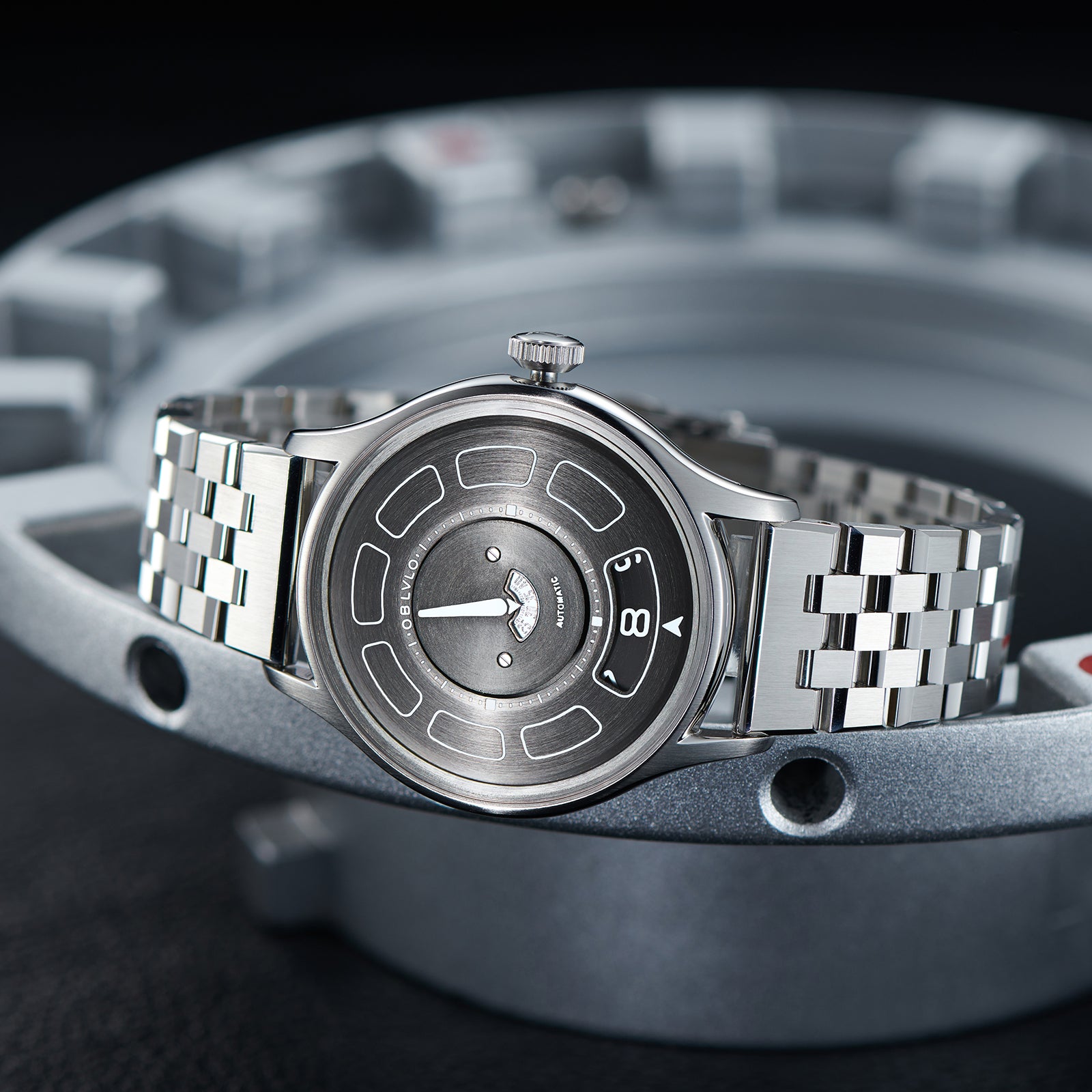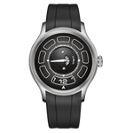 Dial Design: Black Mechanical Rotating Indices And Hands Dial, Unique UFO-inspired dial layout with innovative time display system and modern geometric elements. Sleek design with contrasting white markers creates a bold, contemporary look.