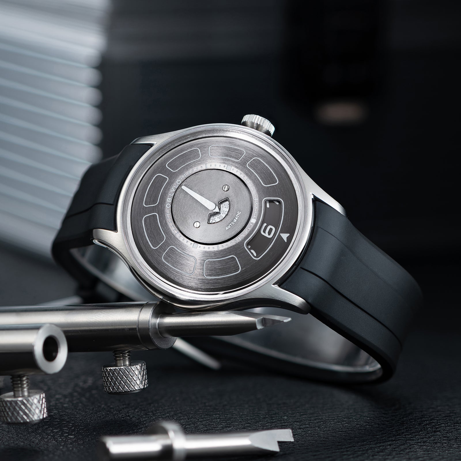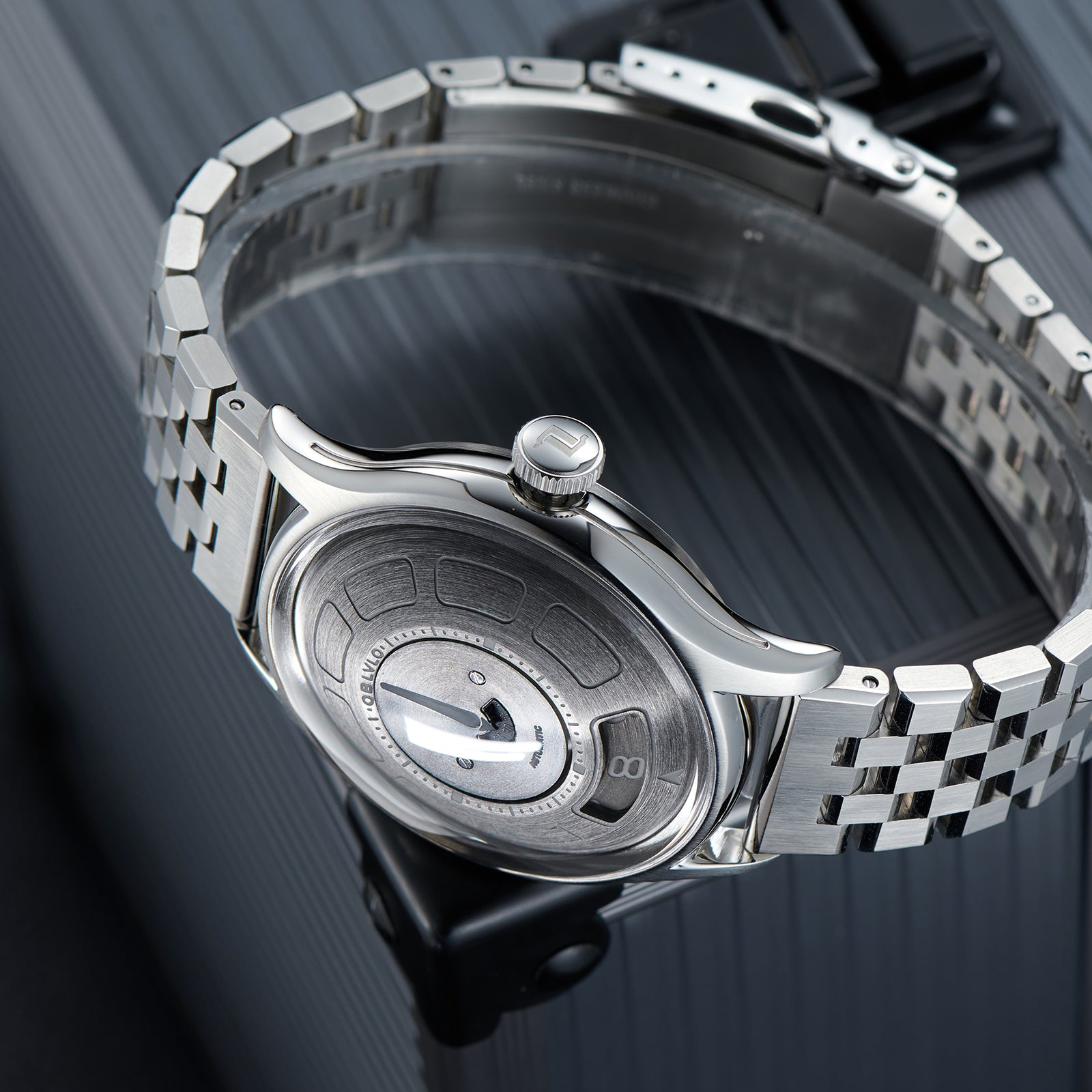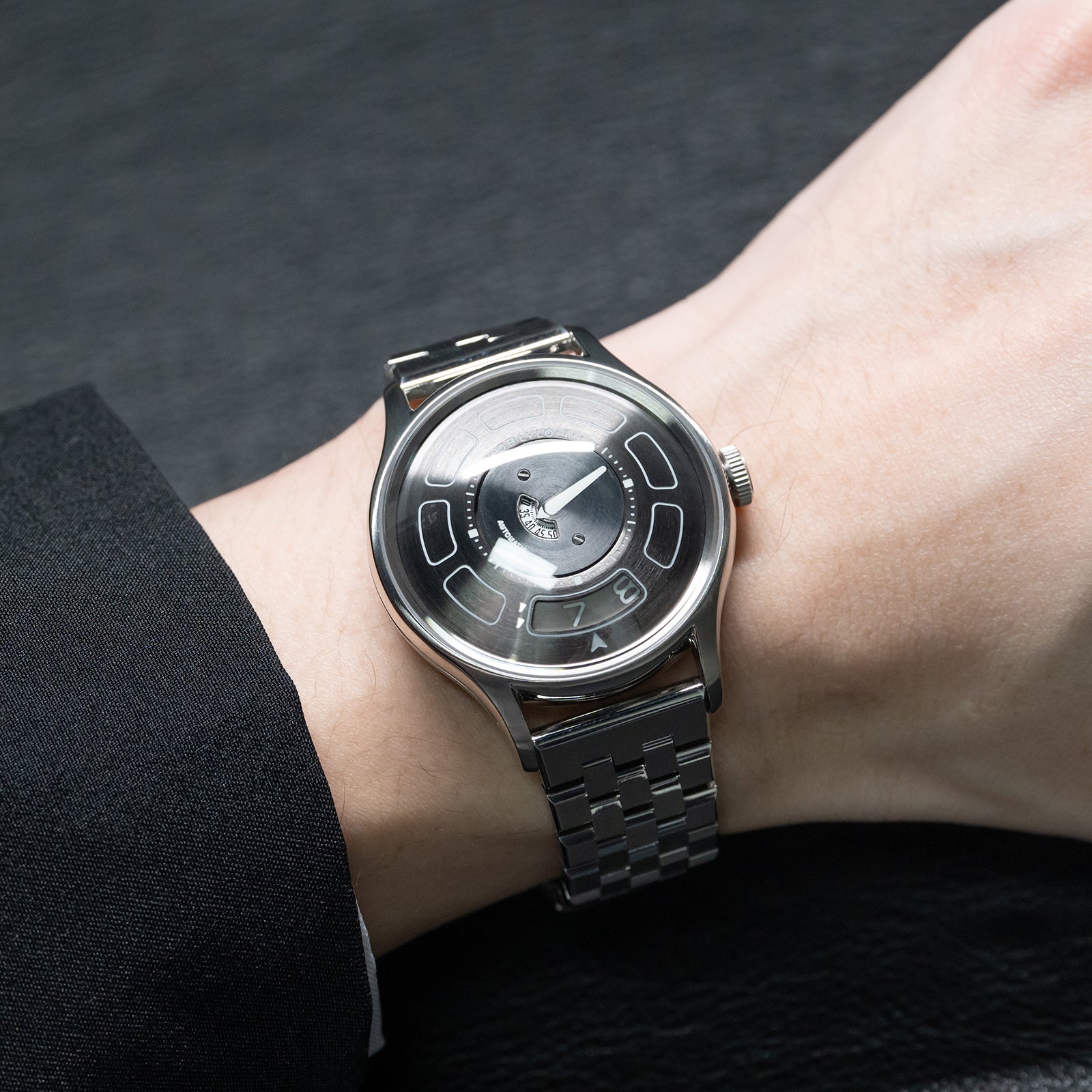 Dial Design: Black Mechanical Rotating Indices And Hands Dial, Unique UFO-inspired dial layout with innovative time display system and modern geometric elements. Sleek design with contrasting white markers creates a bold, contemporary look.