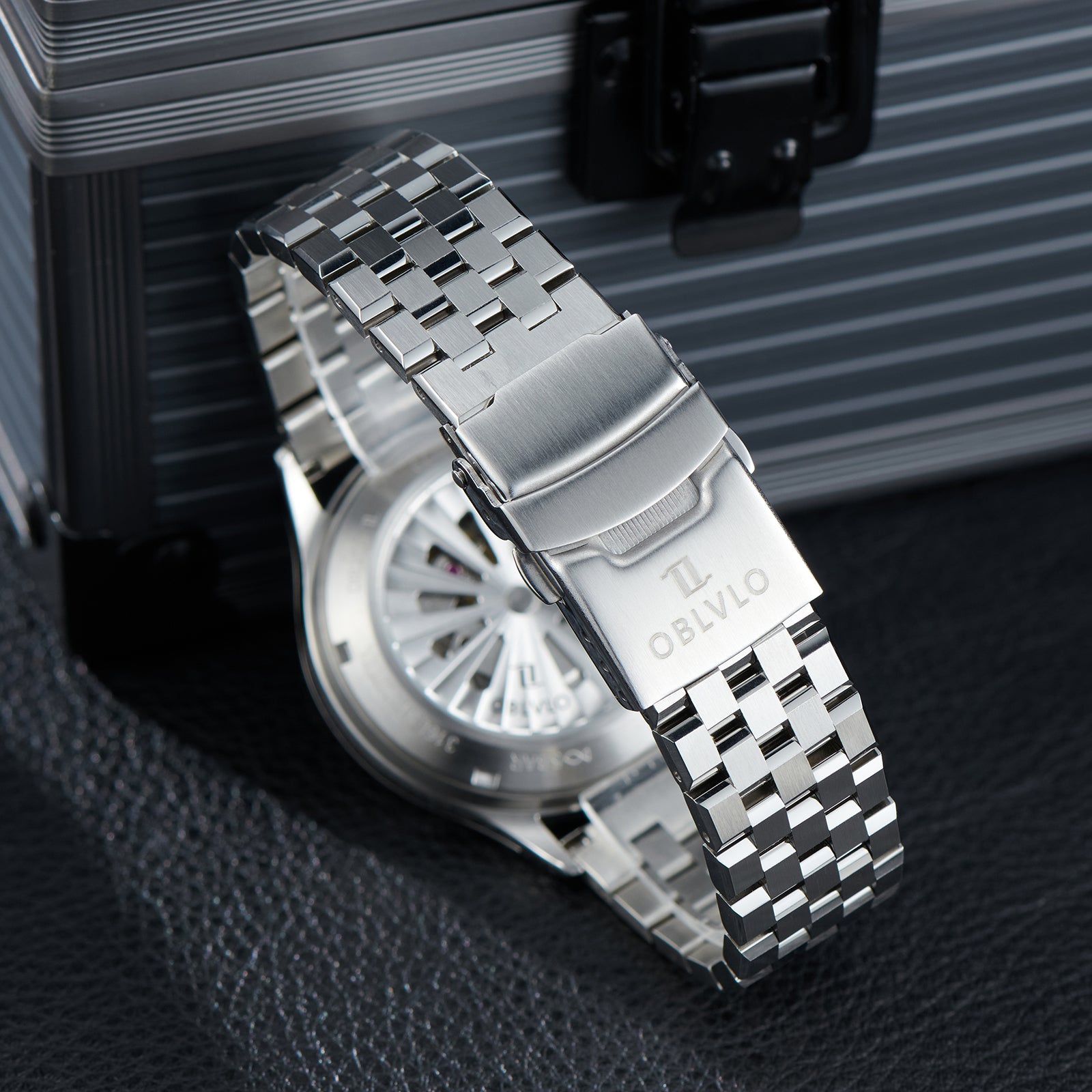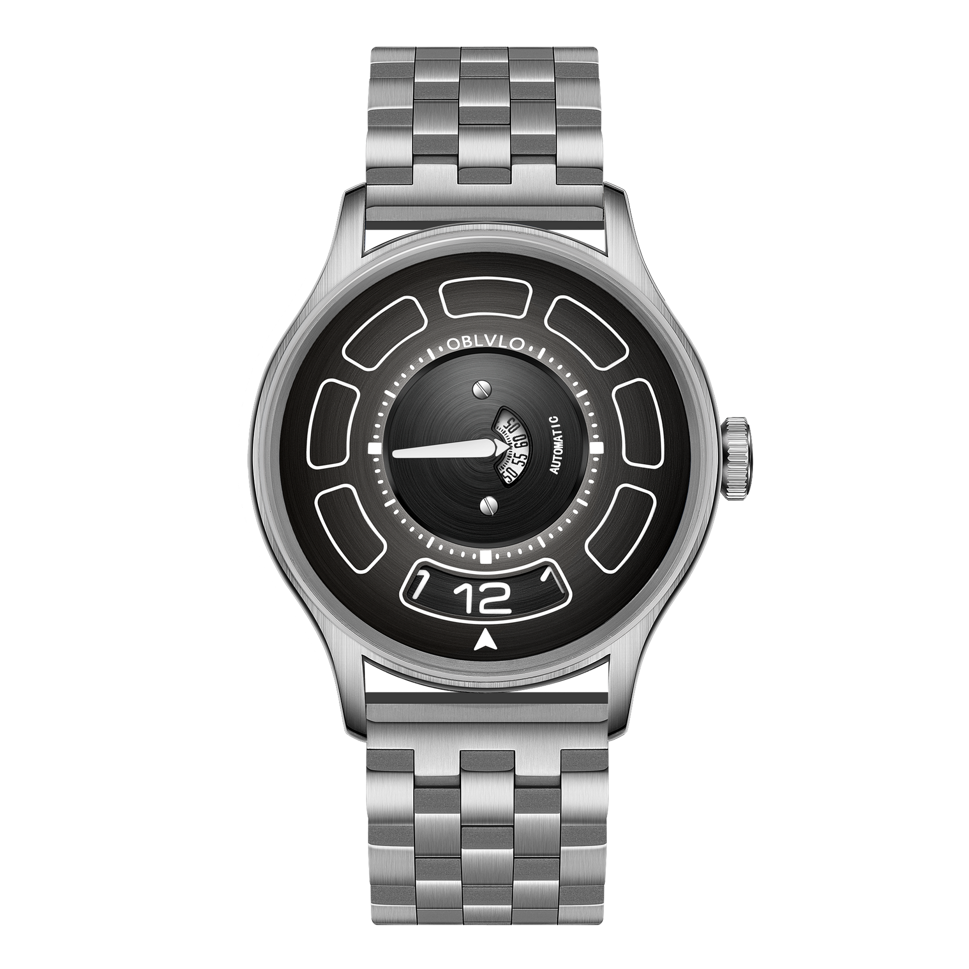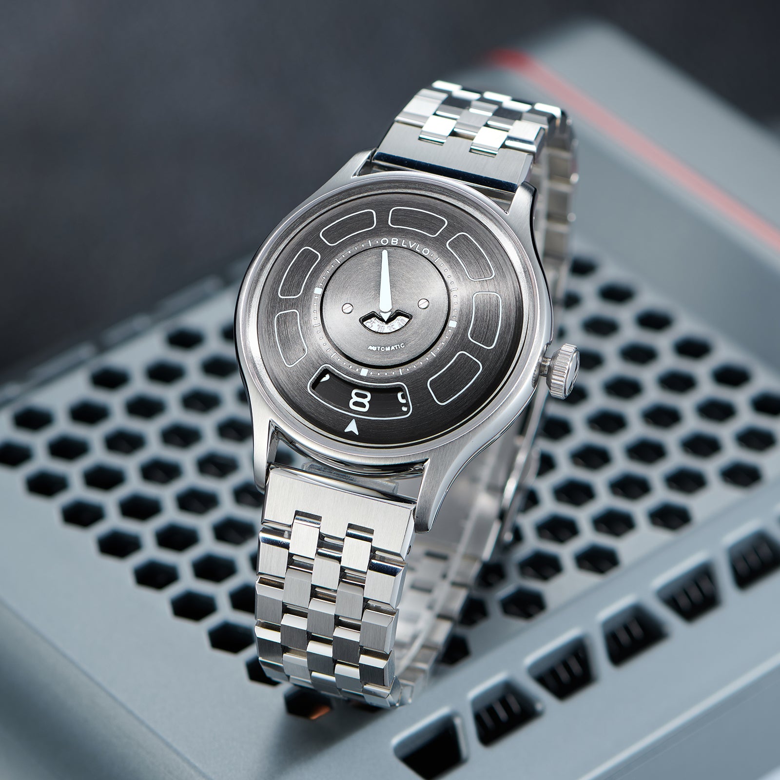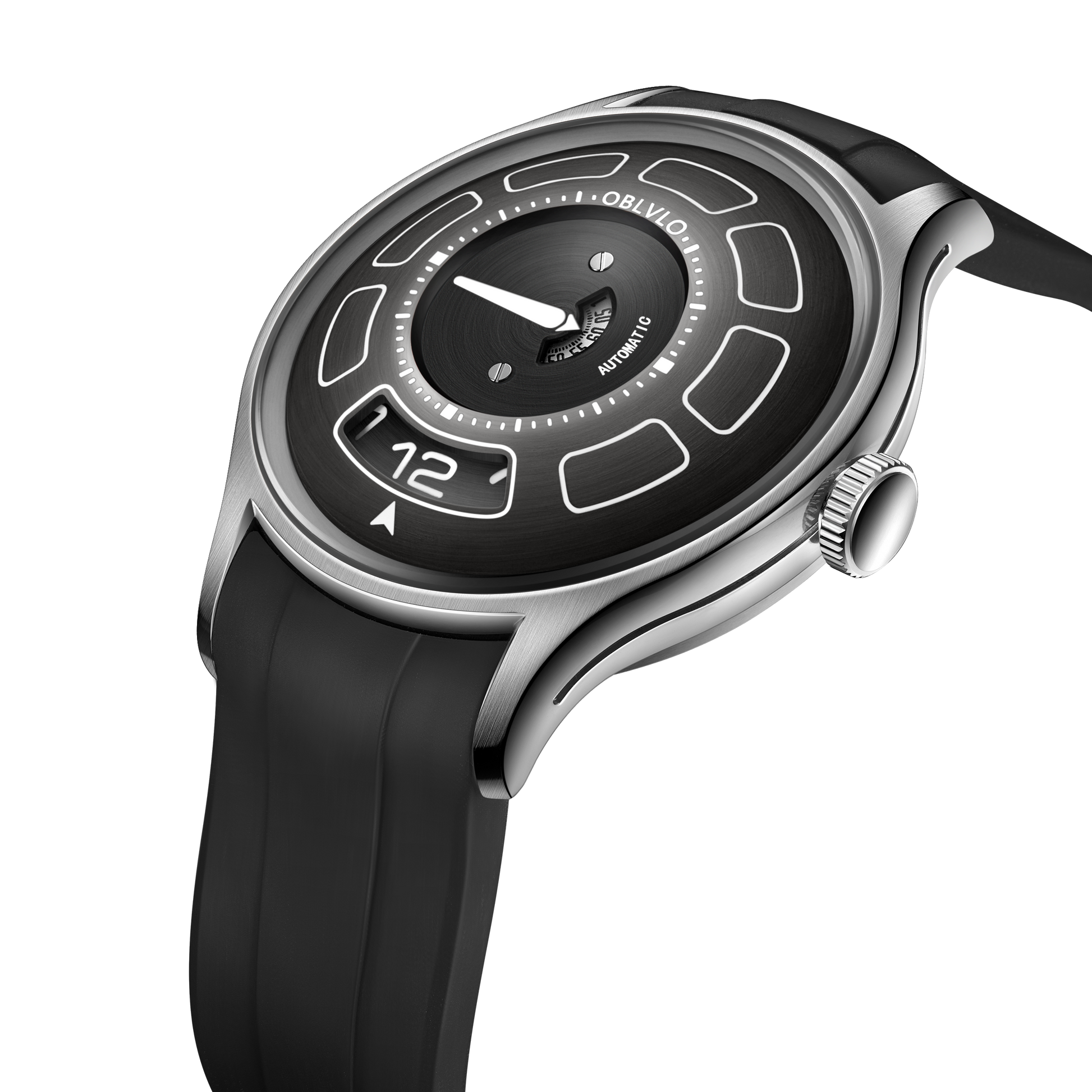 Dial Design: Black Mechanical Rotating Indices And Hands Dial, Unique UFO-inspired dial layout with innovative time display system and modern geometric elements. Sleek design with contrasting white markers creates a bold, contemporary look.
