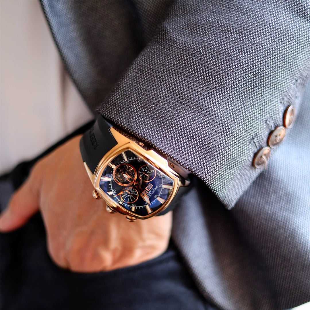 Crafted with a tonneau-shaped case made of 316 stainless steel plated with lustrous rose gold, this watch makes a bold statement on the wrist. The striking blue and rose gold skeleton dial, paired with luminescent-coated hands, adds a touch of sophistication to the overall design. The ST2503 automatic movement ensures accurate timekeeping, while the generous case diameter of 45mm and case thickness of 15mm give the watch a substantial presence.
