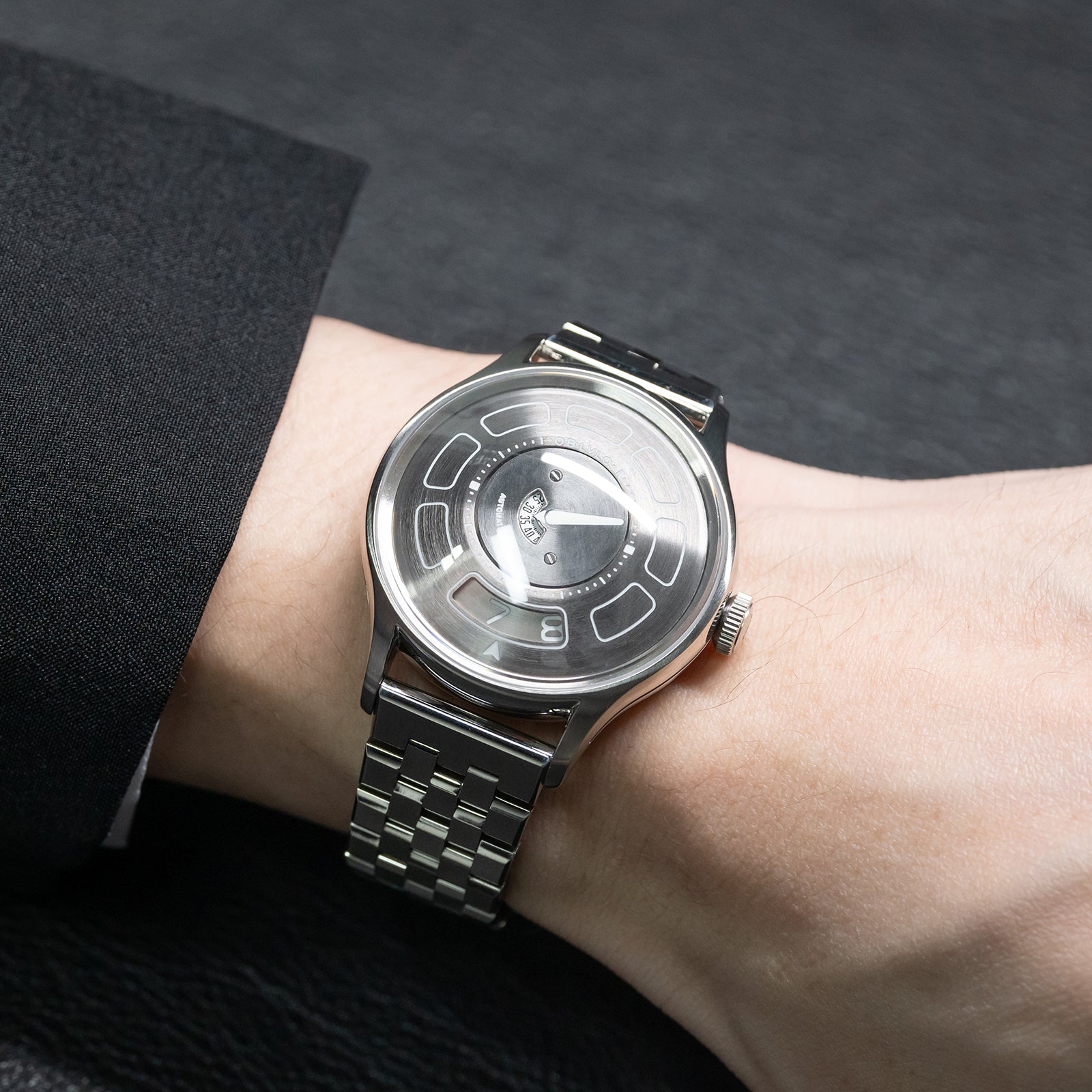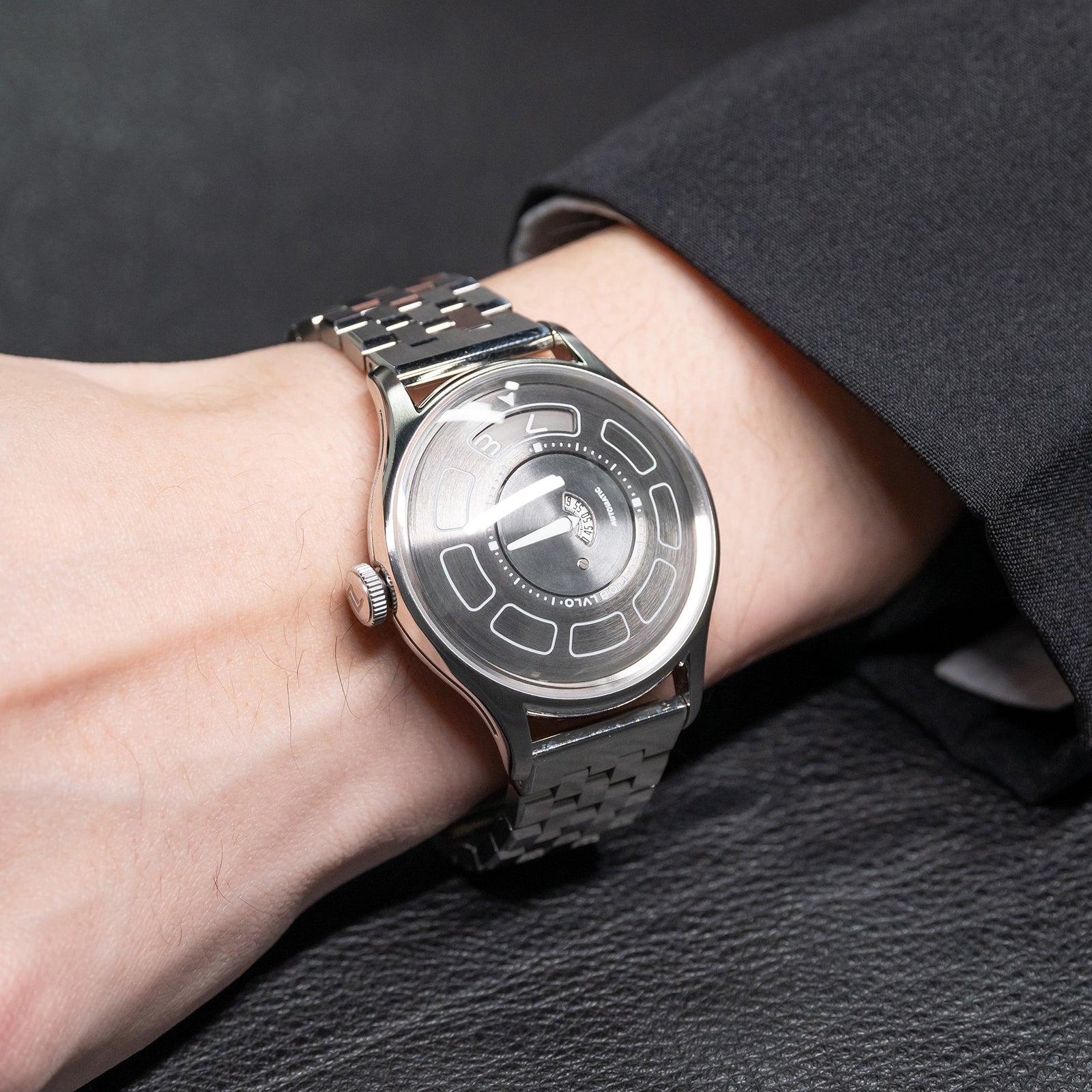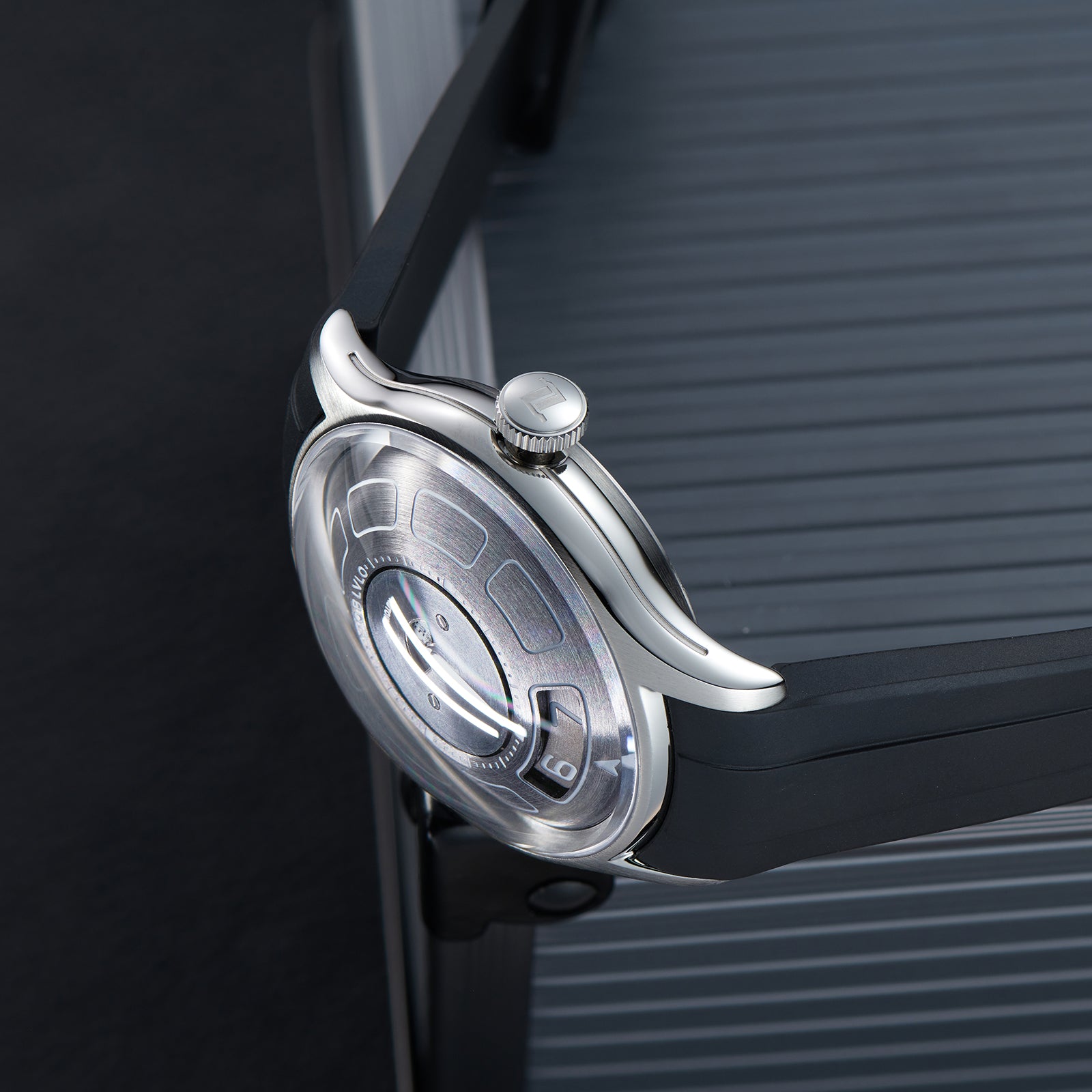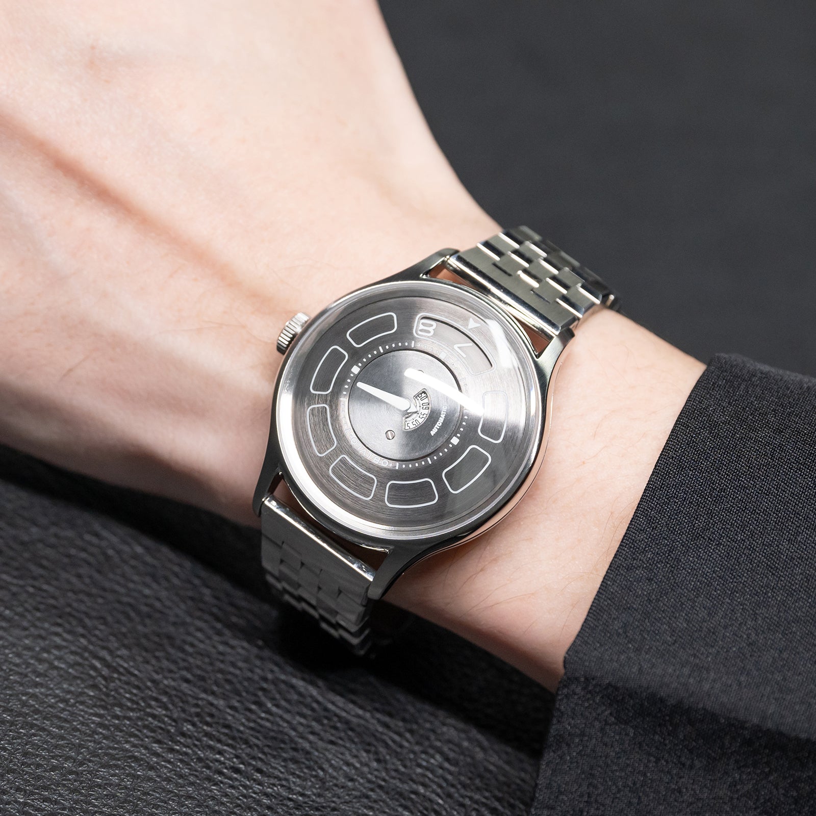 Dial Design: Silver Mechanical Rotating Indices And Hands Dial, Unique UFO-inspired dial layout with innovative time display system and modern geometric elements. Sleek design with contrasting white markers creates a bold, contemporary look.