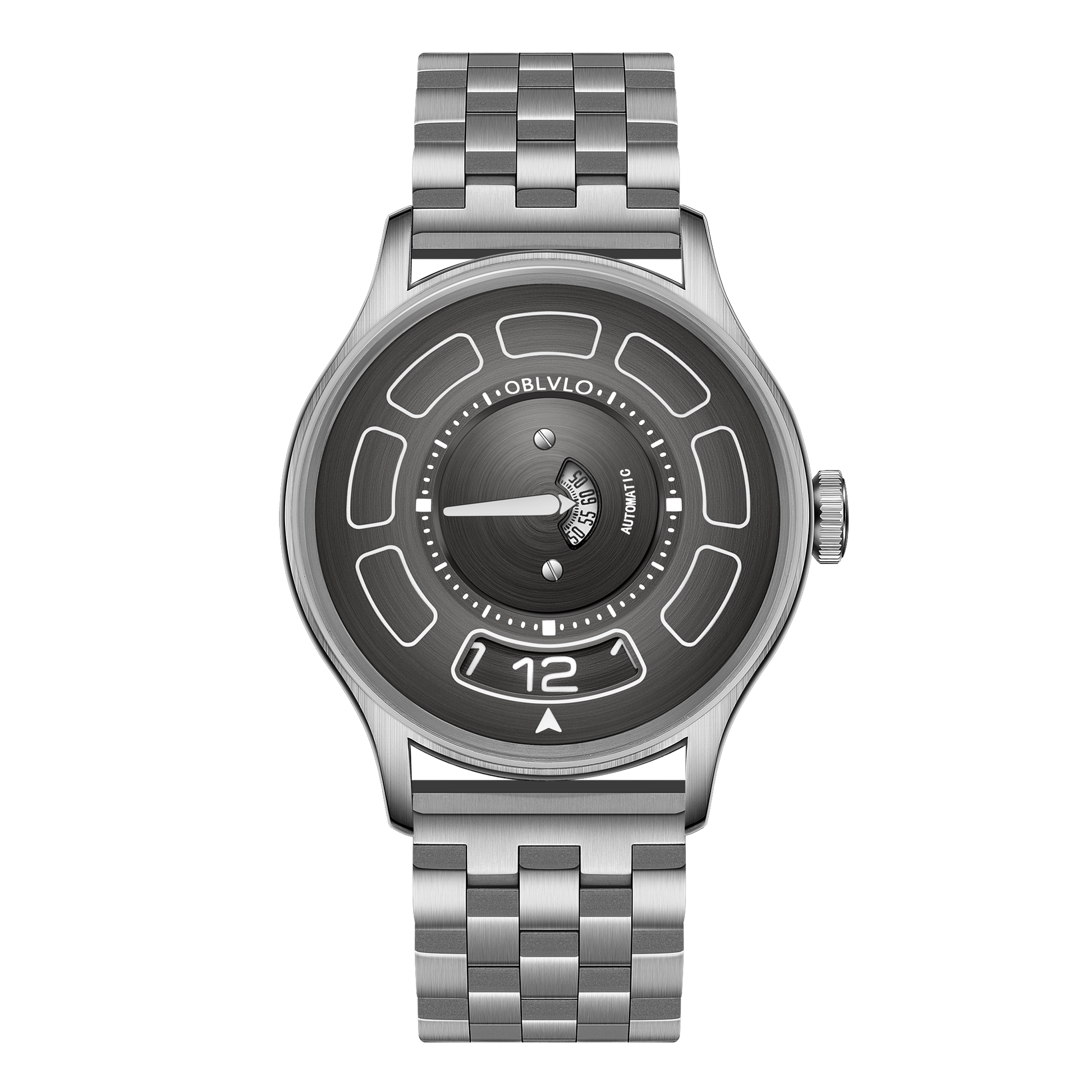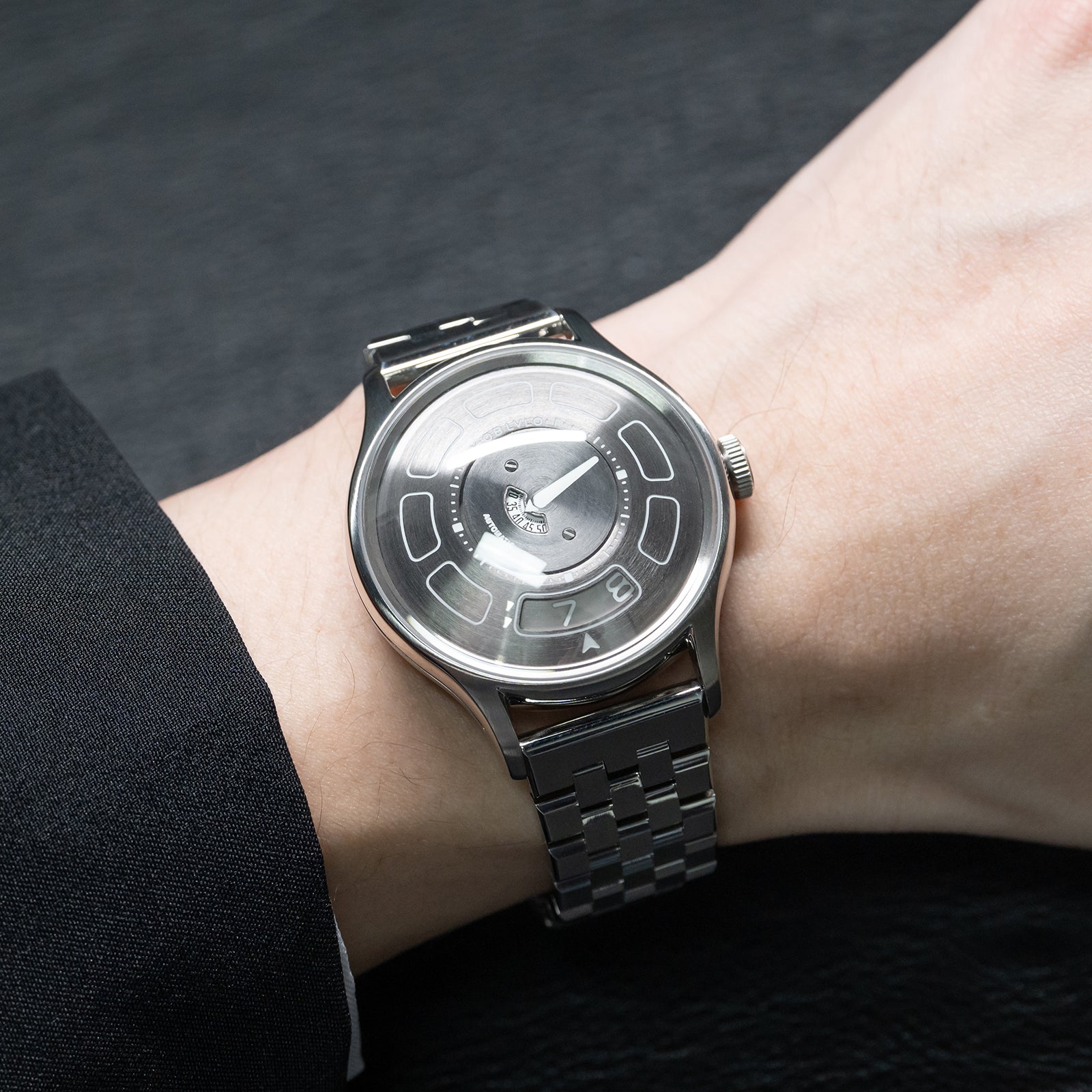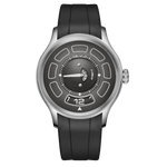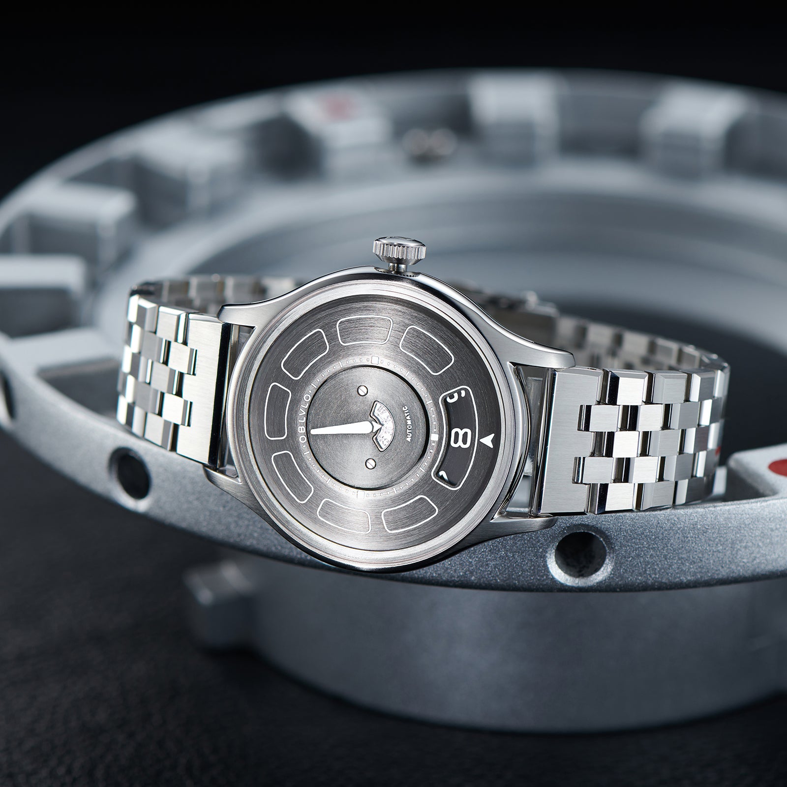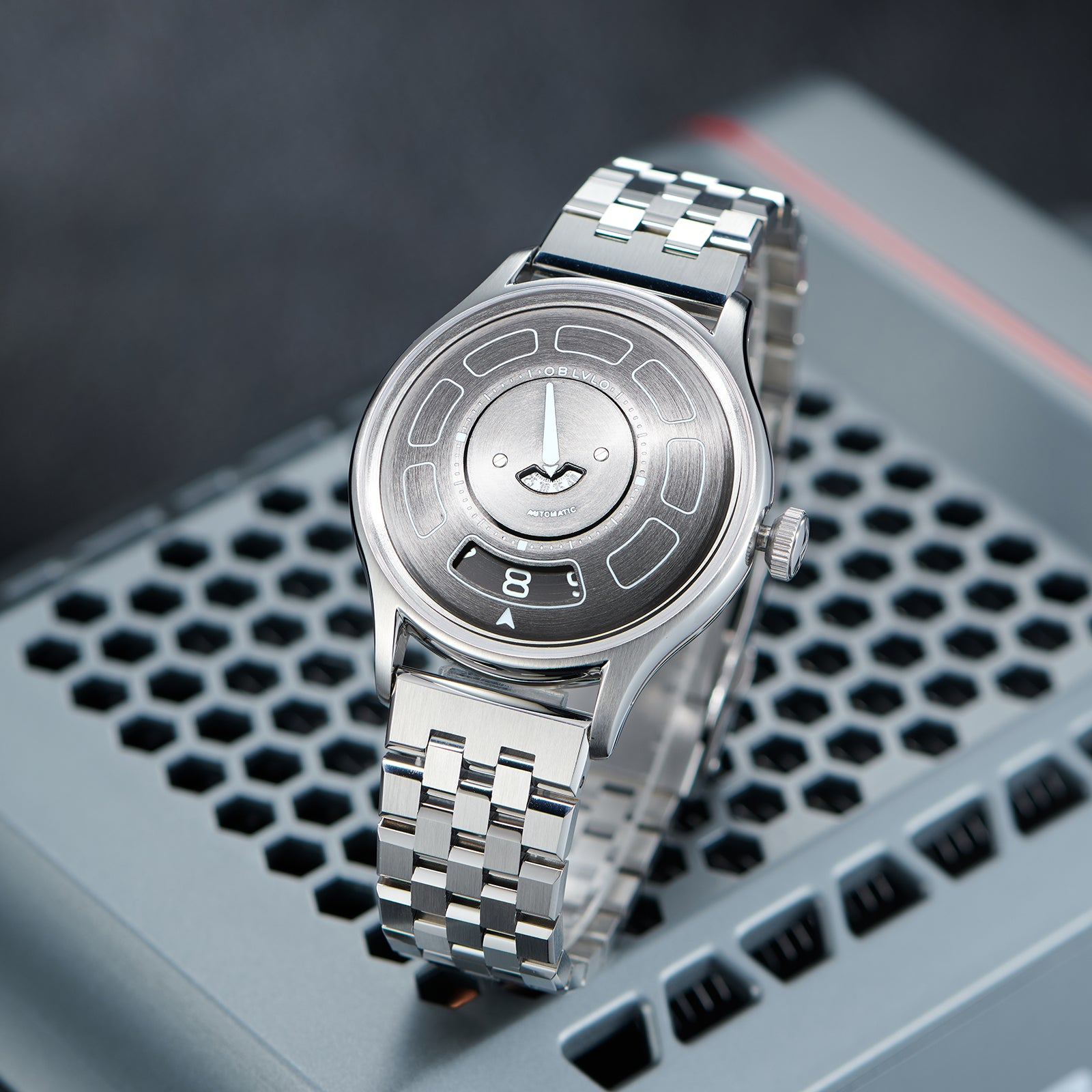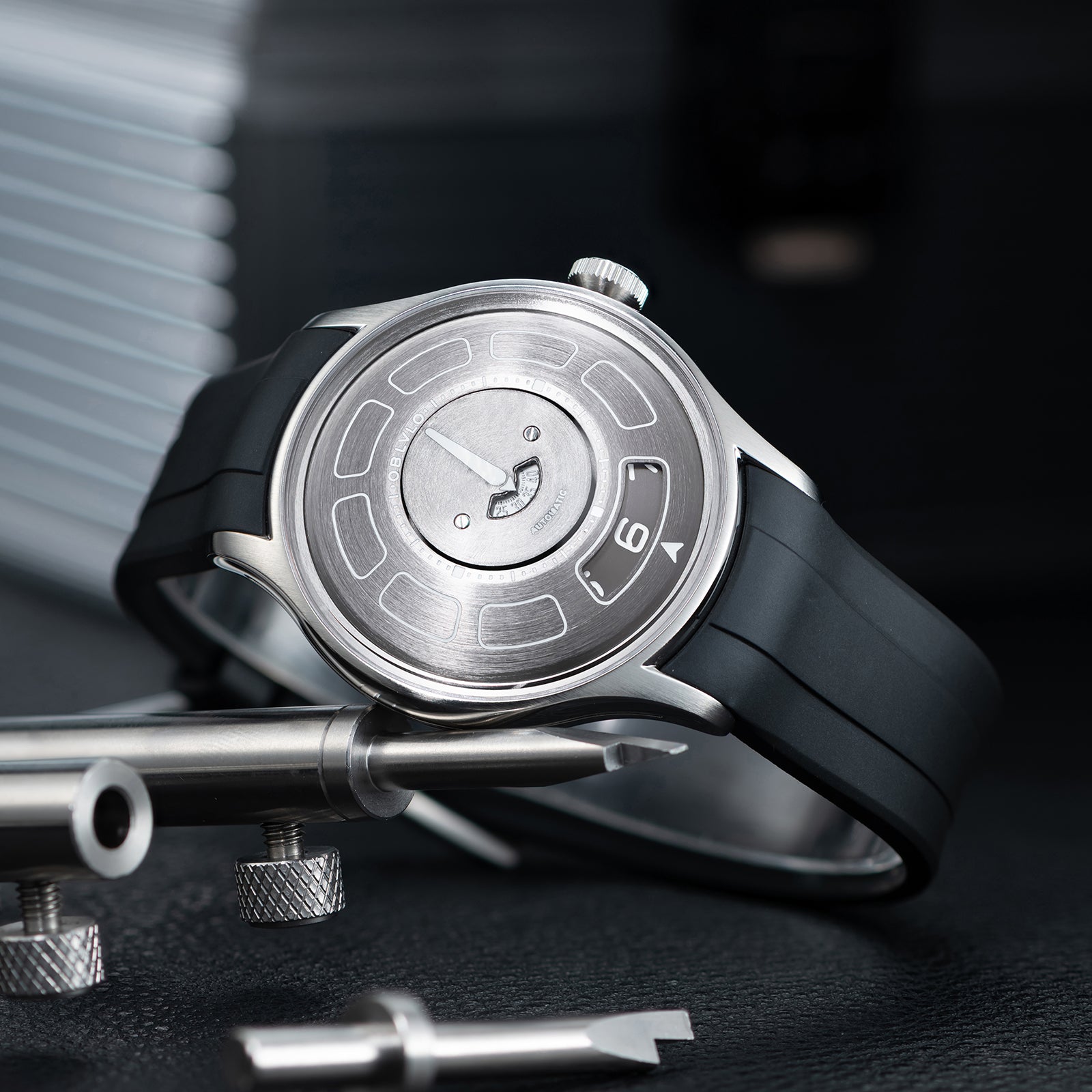 Dial Design: Silver Mechanical Rotating Indices And Hands Dial, Unique UFO-inspired dial layout with innovative time display system and modern geometric elements. Sleek design with contrasting white markers creates a bold, contemporary look.