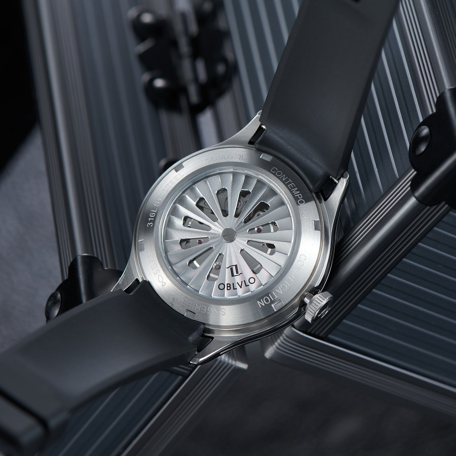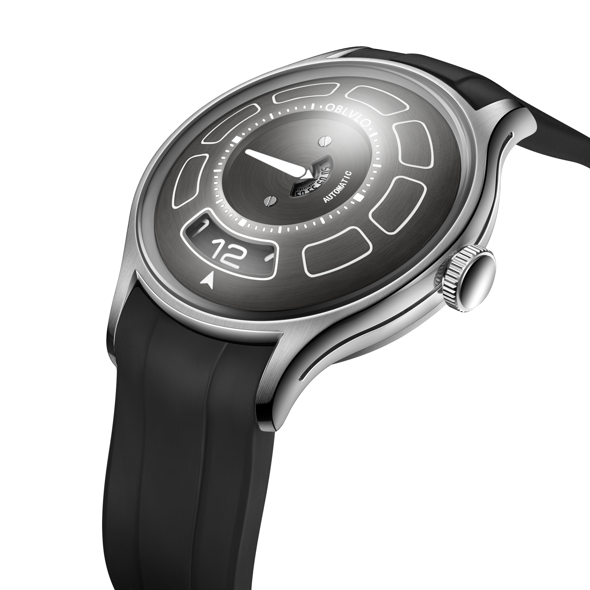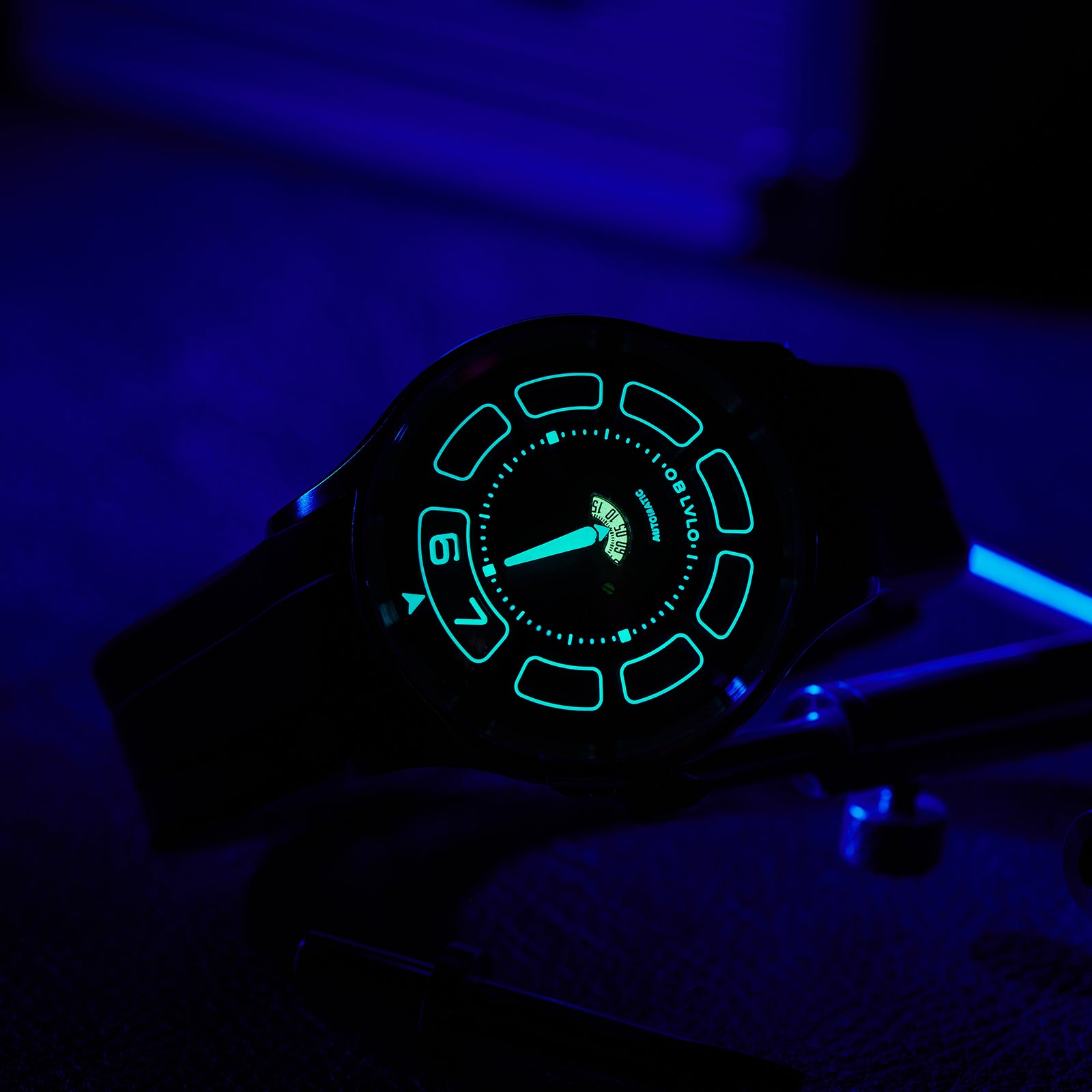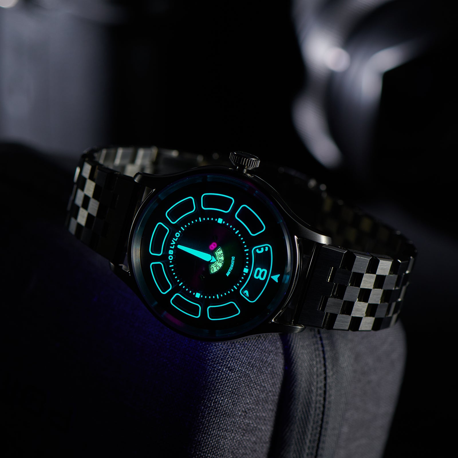 Dial Design: Silver Mechanical Rotating Indices And Hands Dial, Unique UFO-inspired dial layout with innovative time display system and modern geometric elements. Sleek design with contrasting white markers creates a bold, contemporary look.