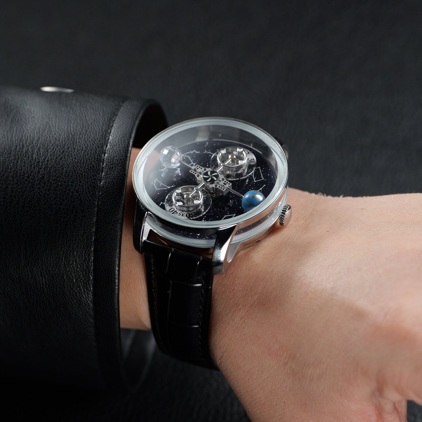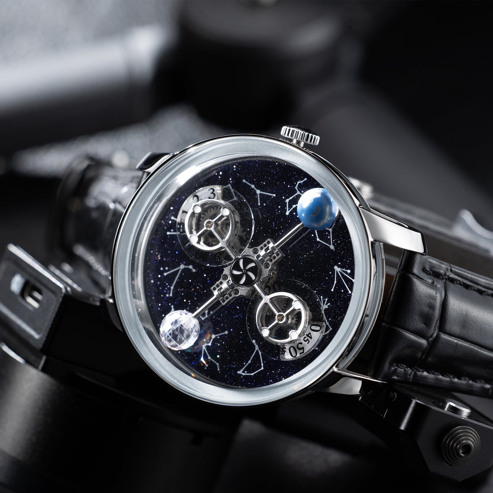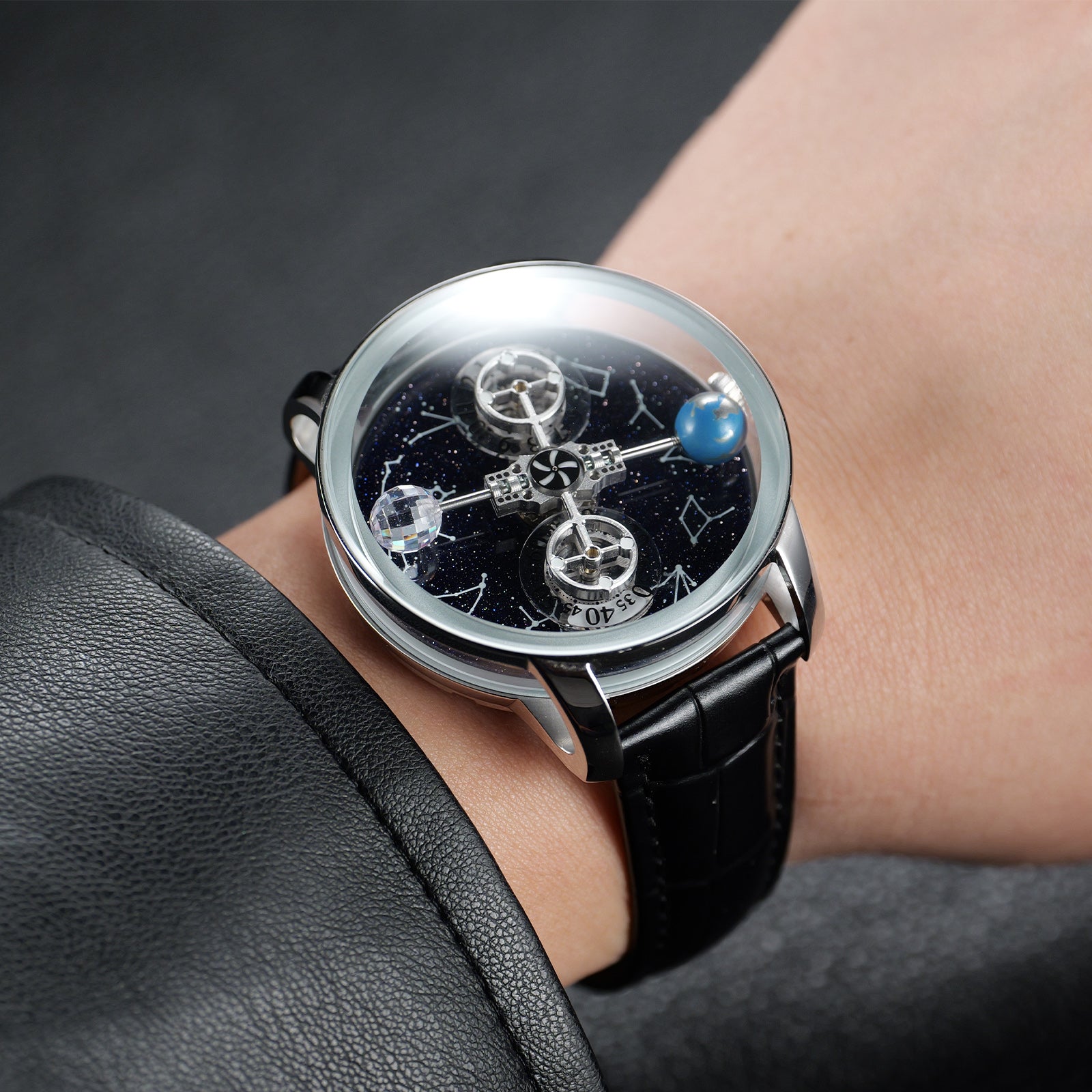 Dial Design: Starry Sky (Aventurine Dial) , This watch dail combines the timeless elegance of mechanical watchmaking with the awe-inspiring beauty of space exploration. The mesmerizing twelve Constellations dial features a detailed universe scene that transforms a simple time check into a moment of cosmic appreciation.