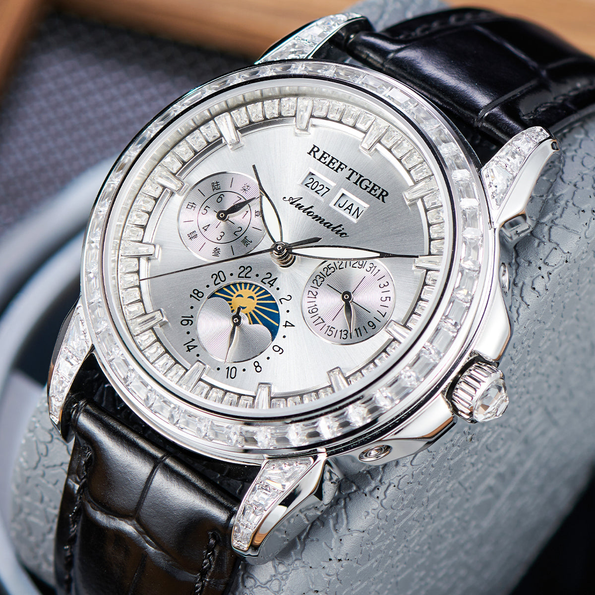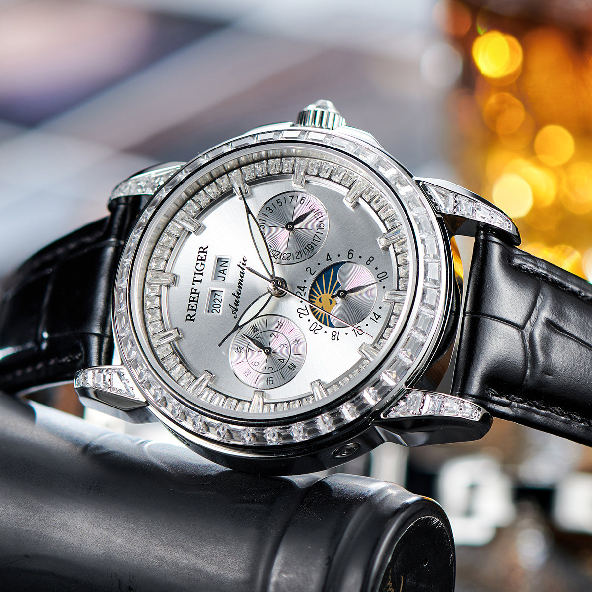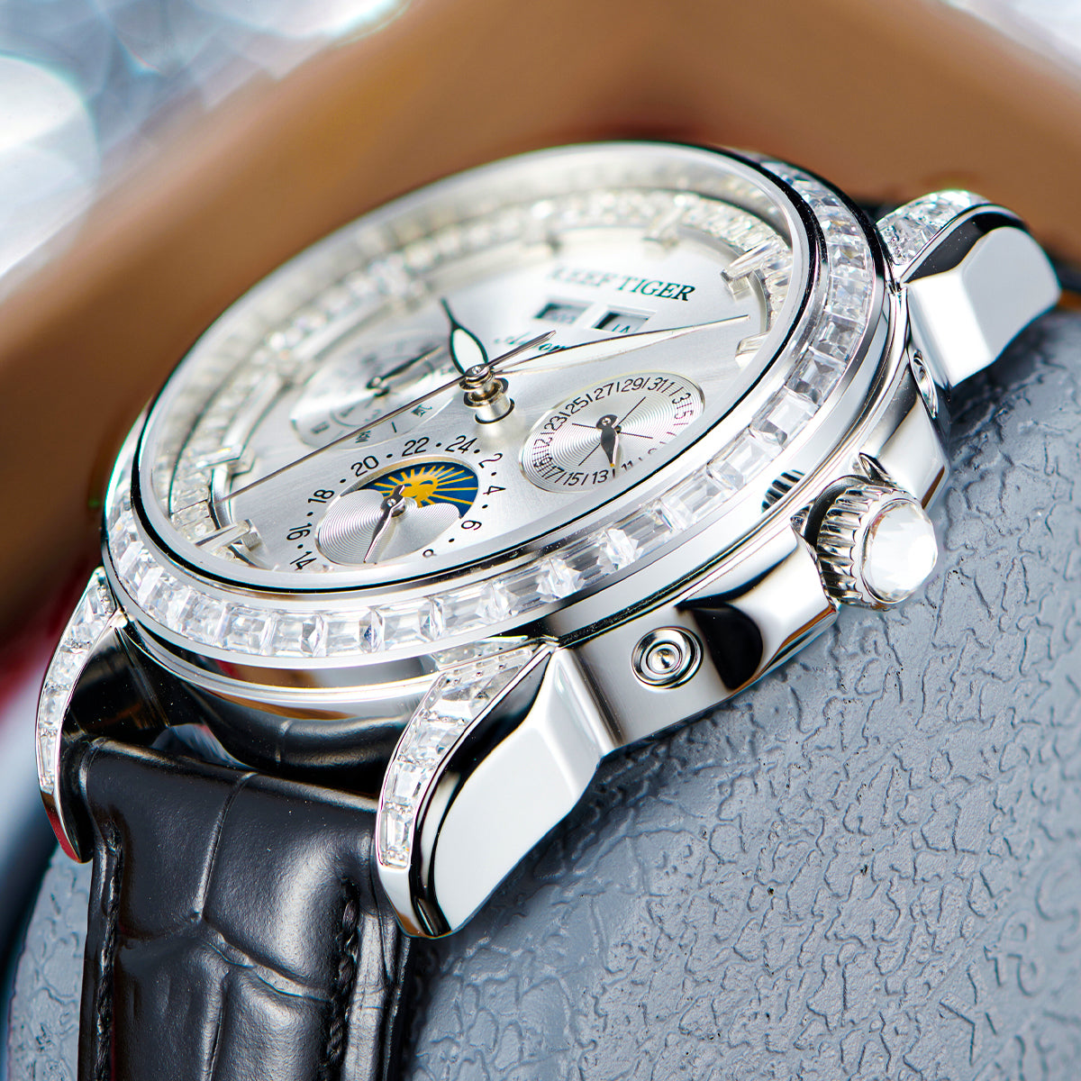 Dial Design: Silver Dial & Watch face is designed with year, month, date, day, 6 hours day/night/24 hours instruction & moonphase style, luminous hands display. White Color Zirconia and Diamond inlay collocation multifunctional dial, highlight charm, shine extraordinary brilliance.