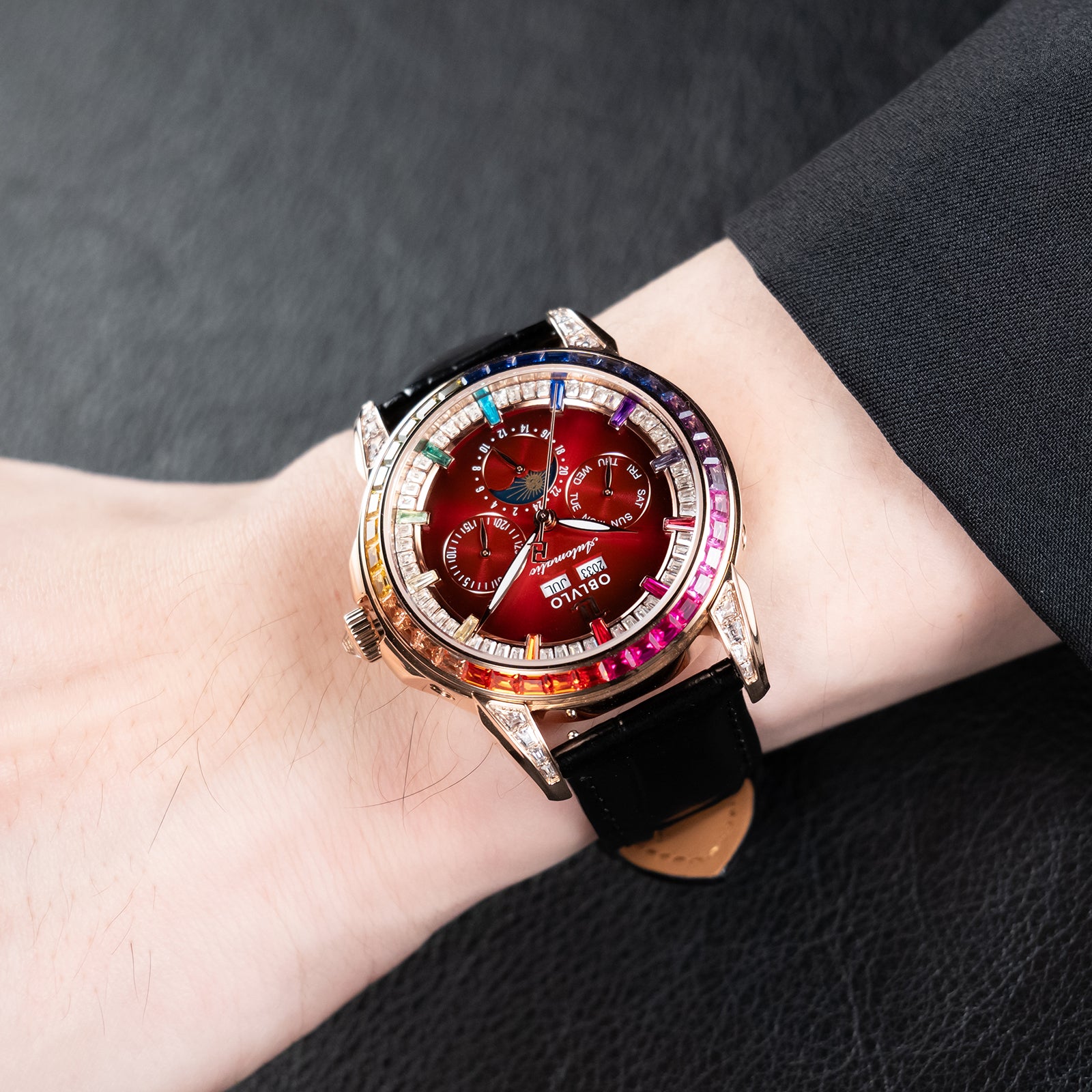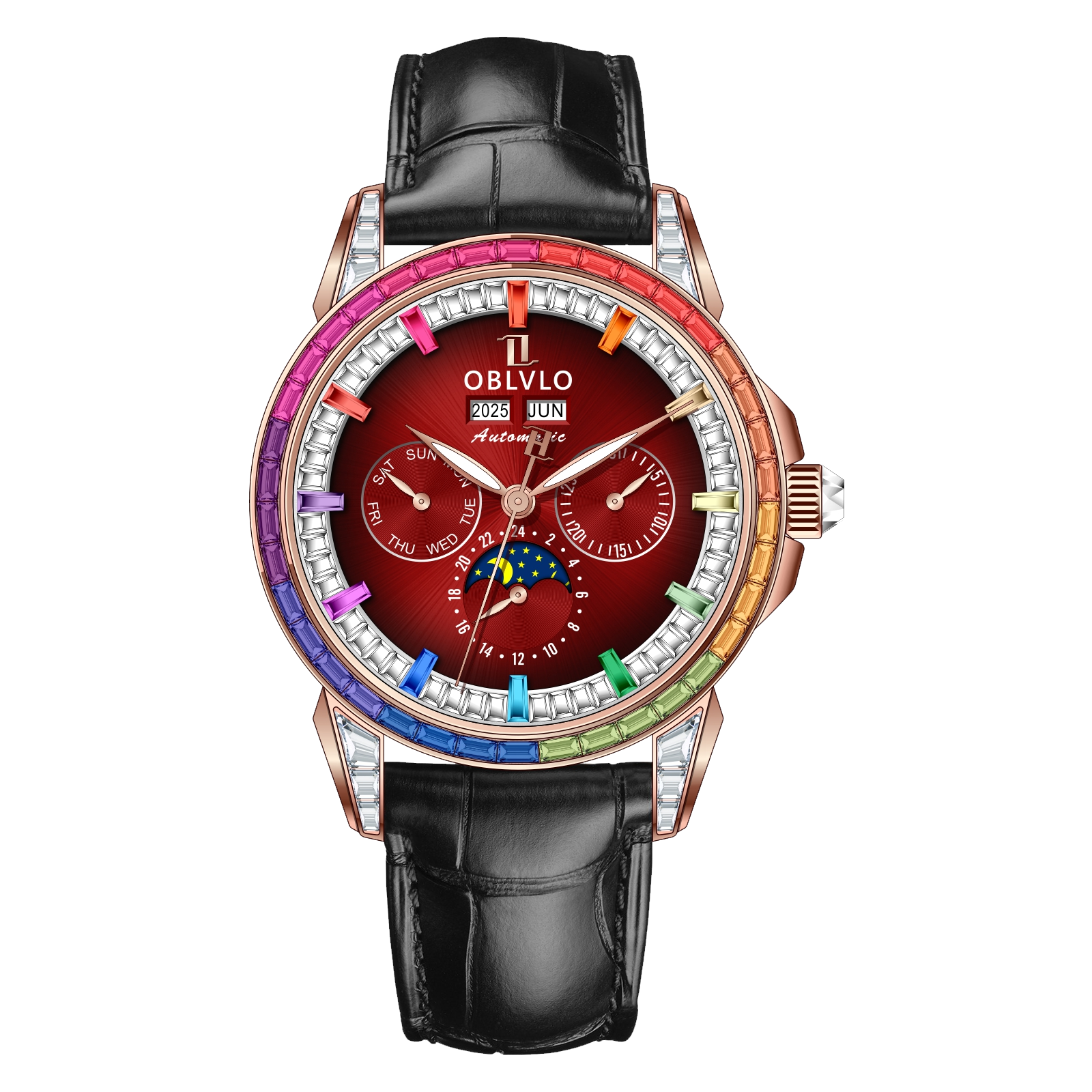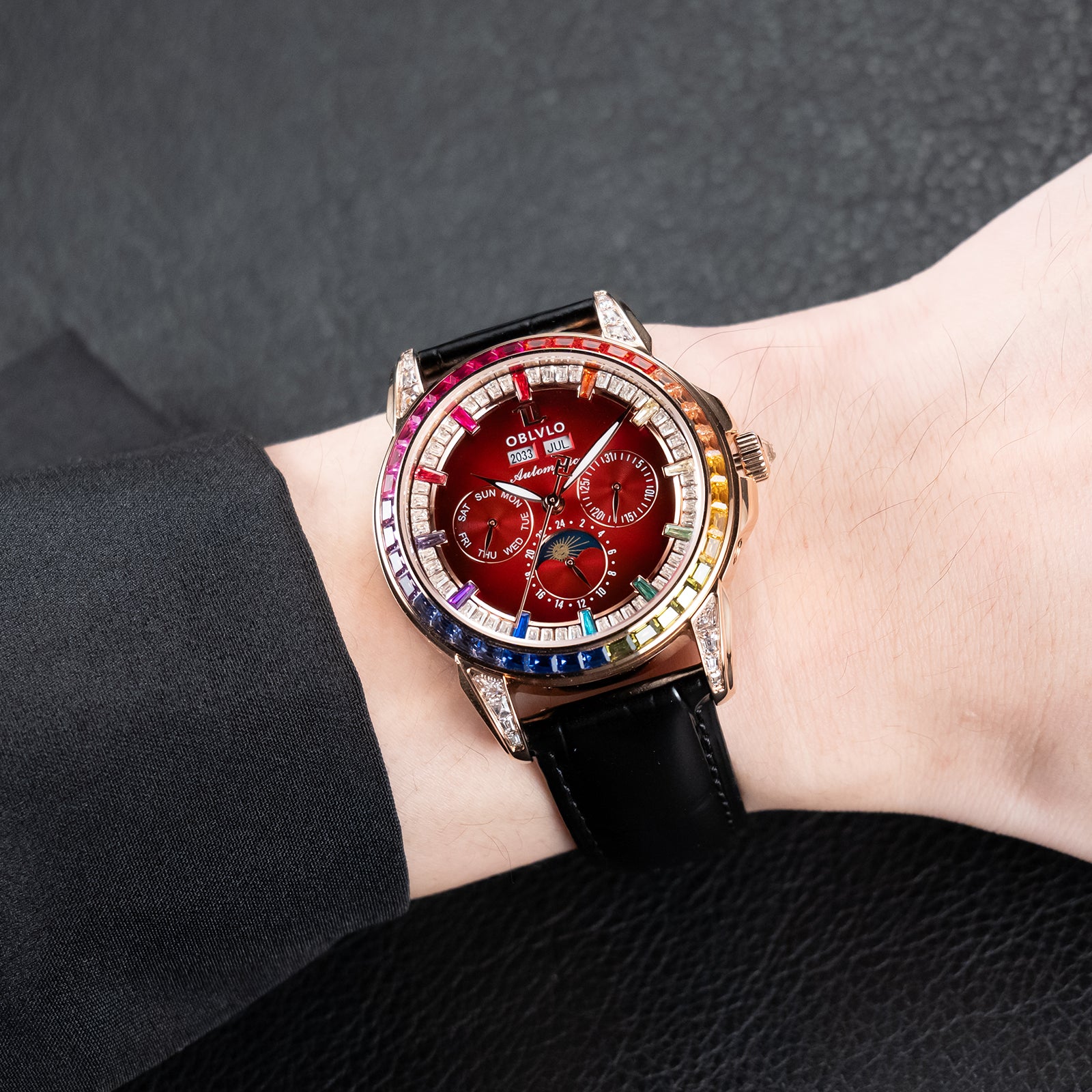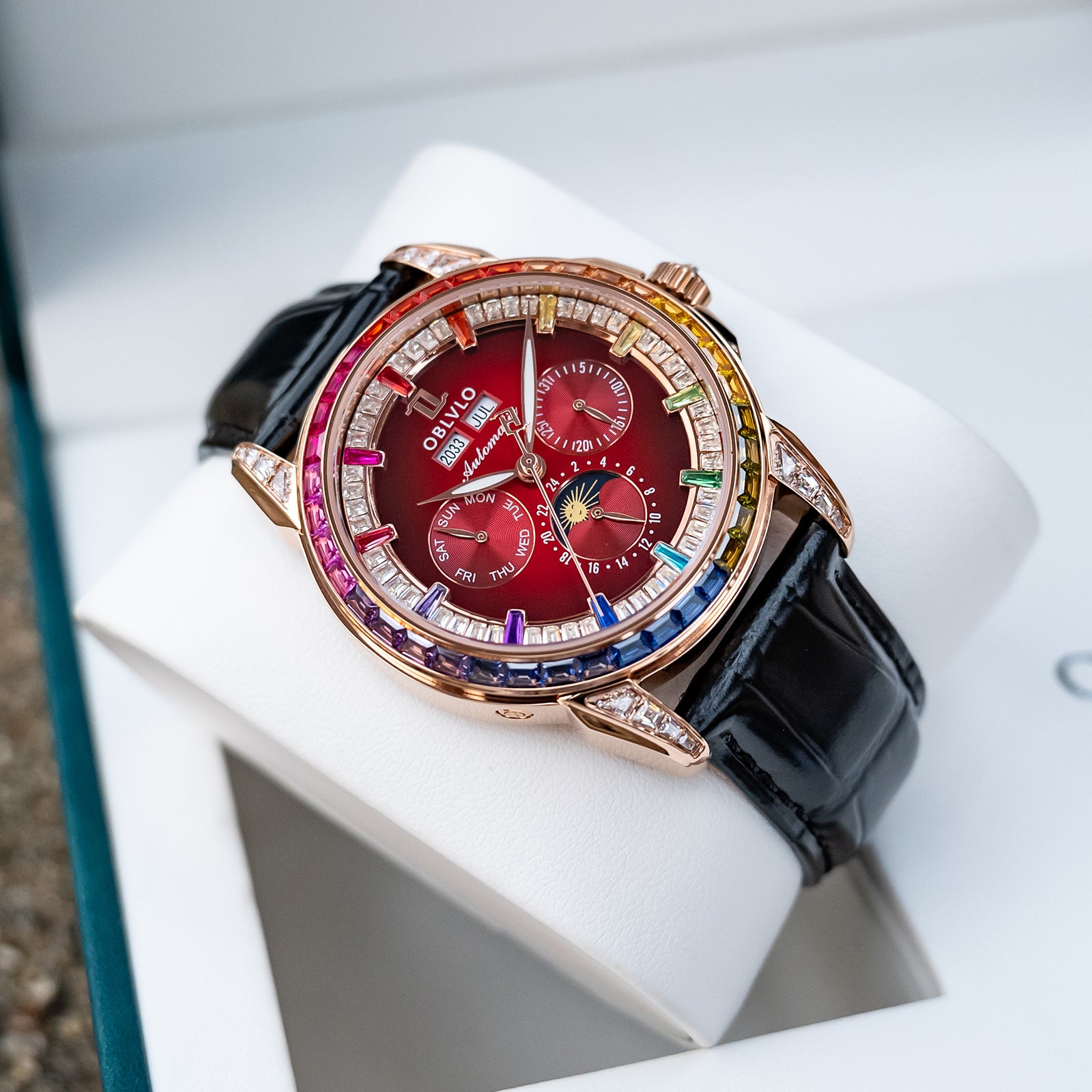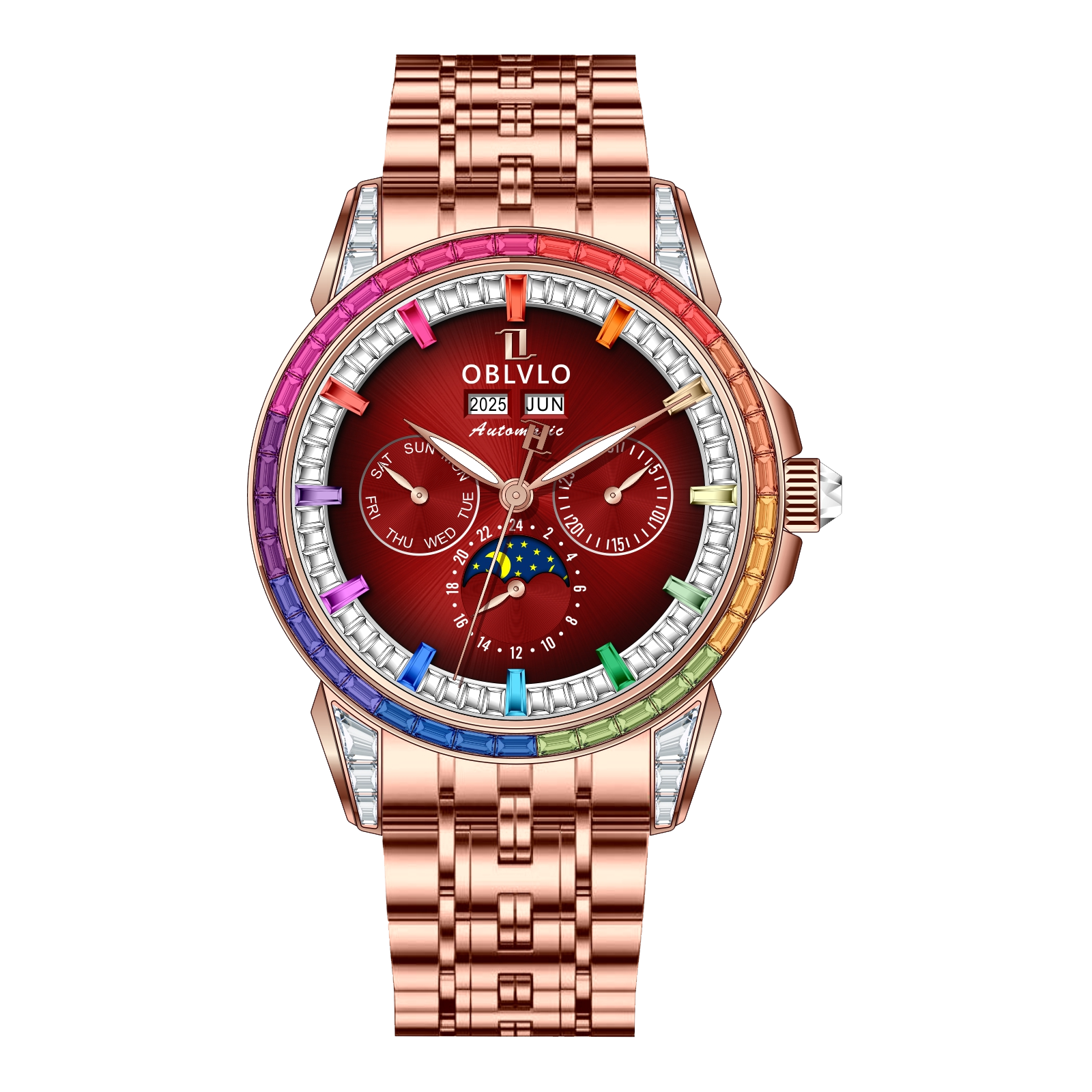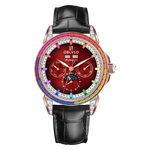 Dial Design: Burgundy Red Dial & Watch face is designed with year, month, date, day, 6 hours day/night/24 hours instruction & moonphase style, luminous hands display. Rainbow Color Zirconia inlay collocation multifunctional dial & bezel, highlight charm, shine extraordinary brilliance.