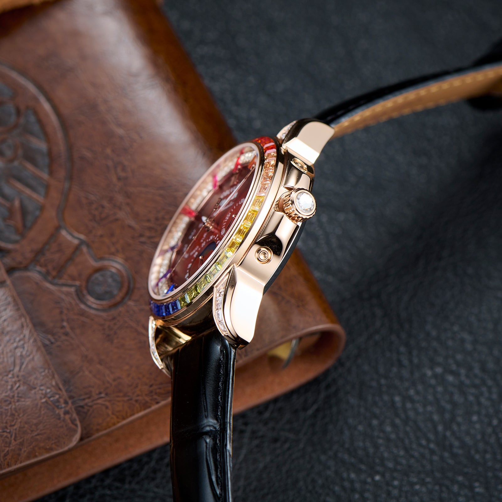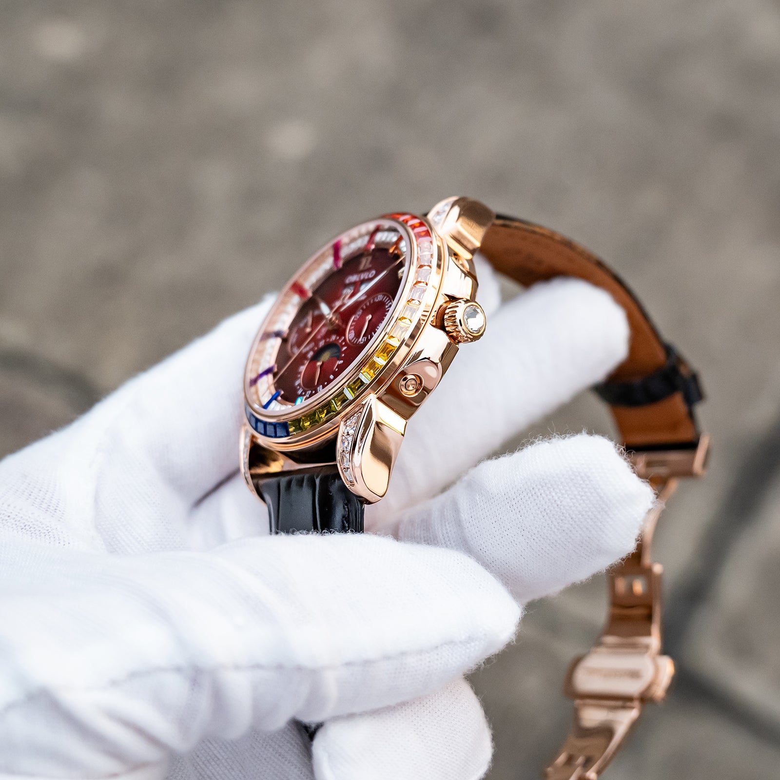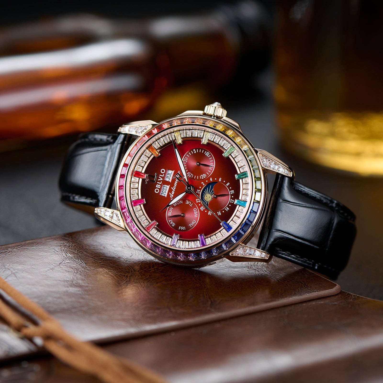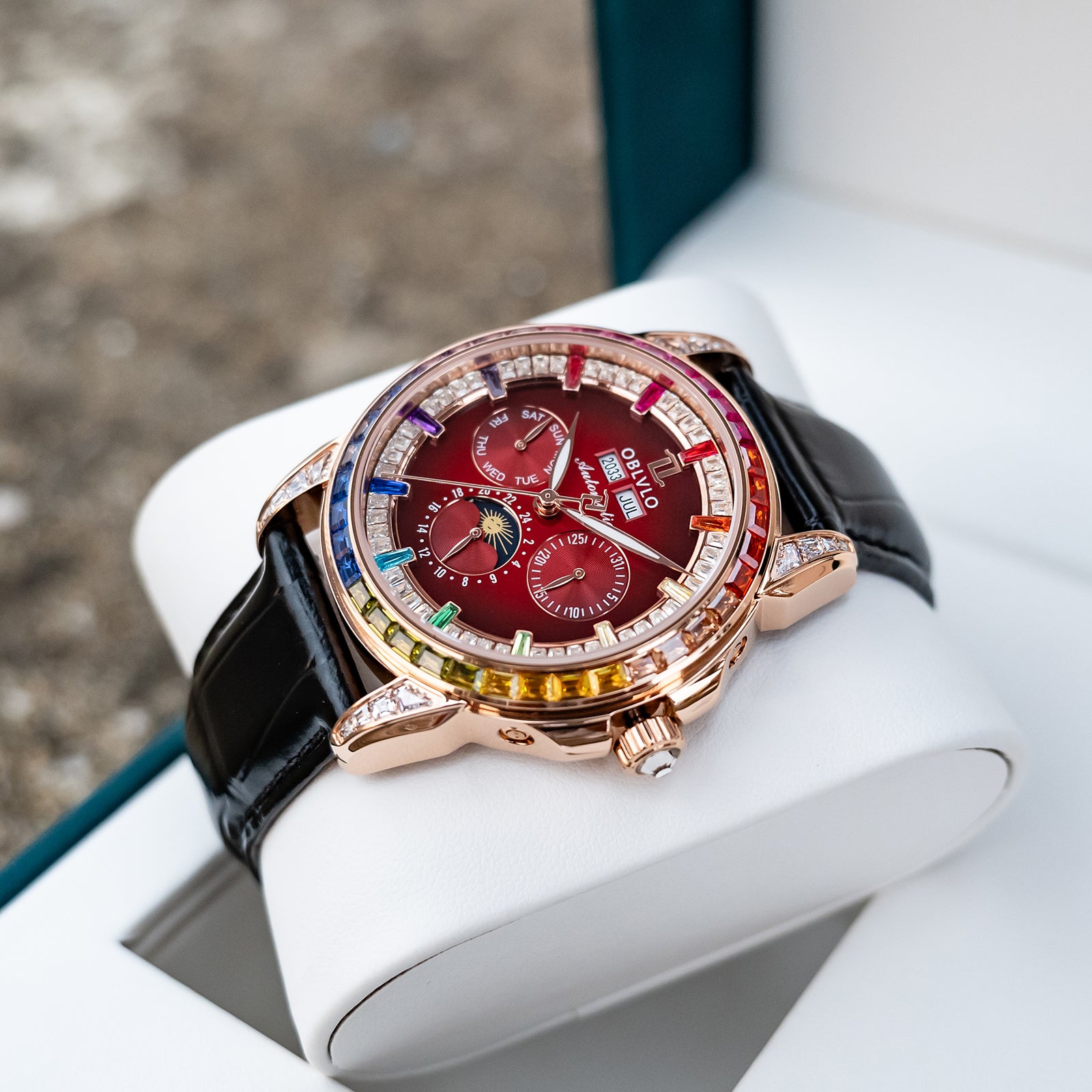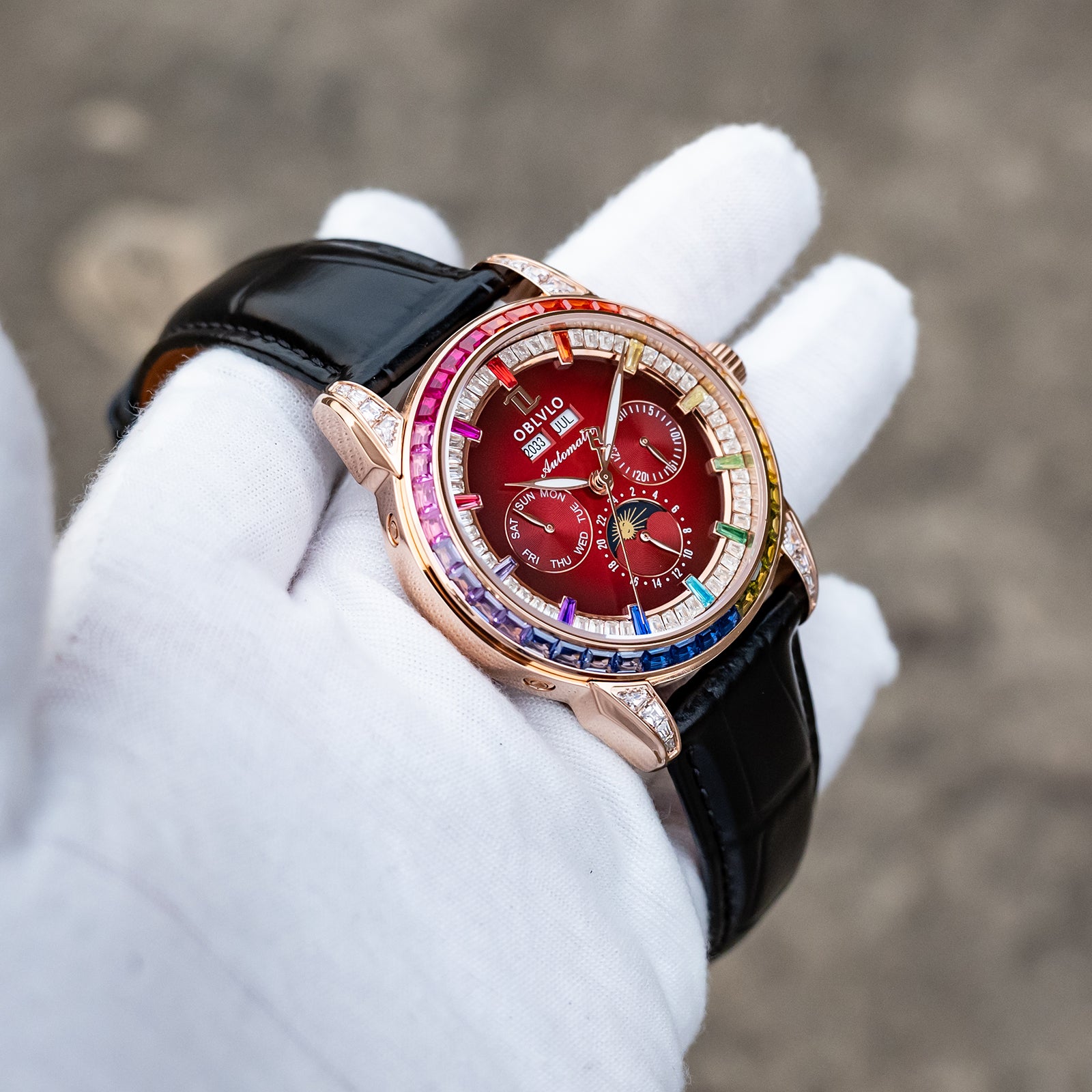 Dial Design: Burgundy Red Dial & Watch face is designed with year, month, date, day, 6 hours day/night/24 hours instruction & moonphase style, luminous hands display. Rainbow Color Zirconia inlay collocation multifunctional dial & bezel, highlight charm, shine extraordinary brilliance.