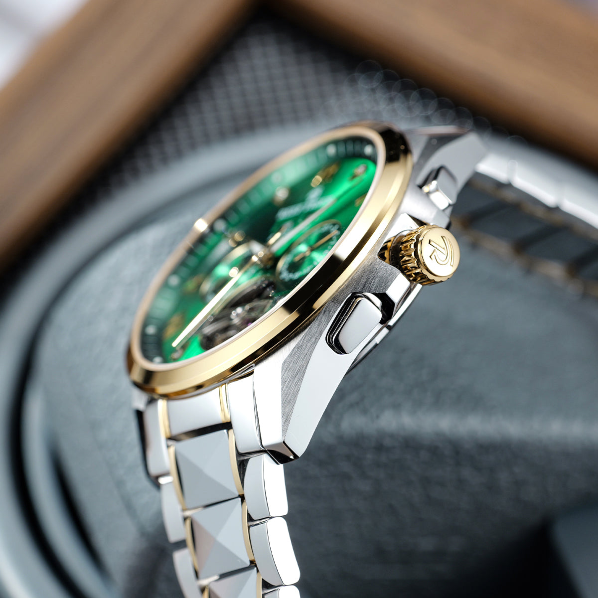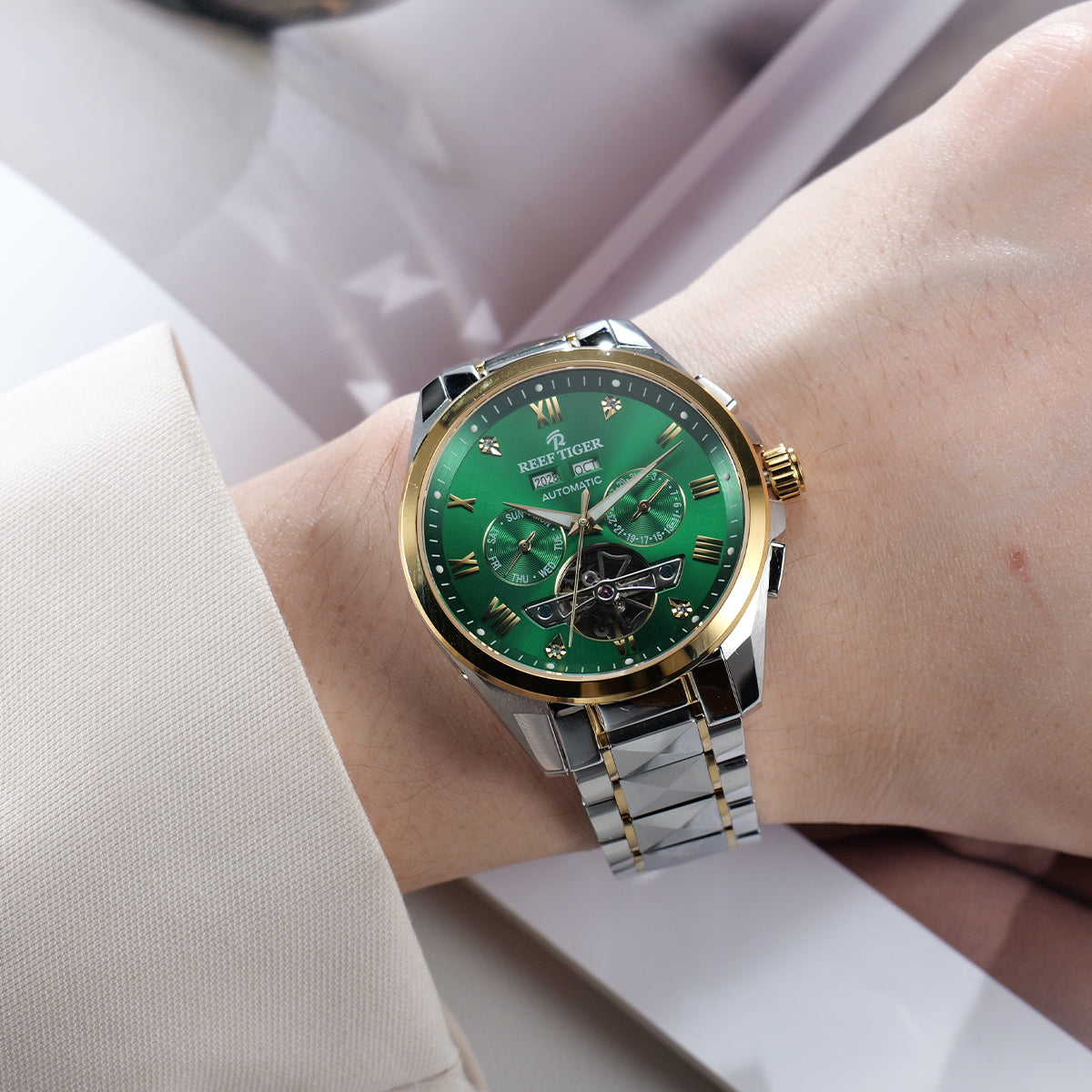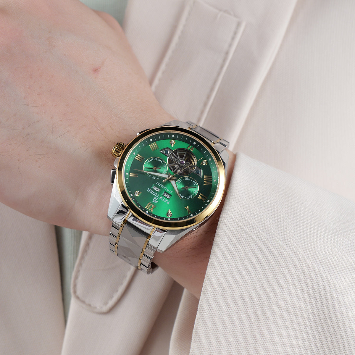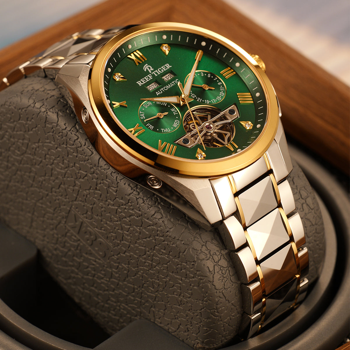 Dial Design: Green Dial, Watch face is designed with year, month, date, day, luminous hands display & tourbillon style dial.