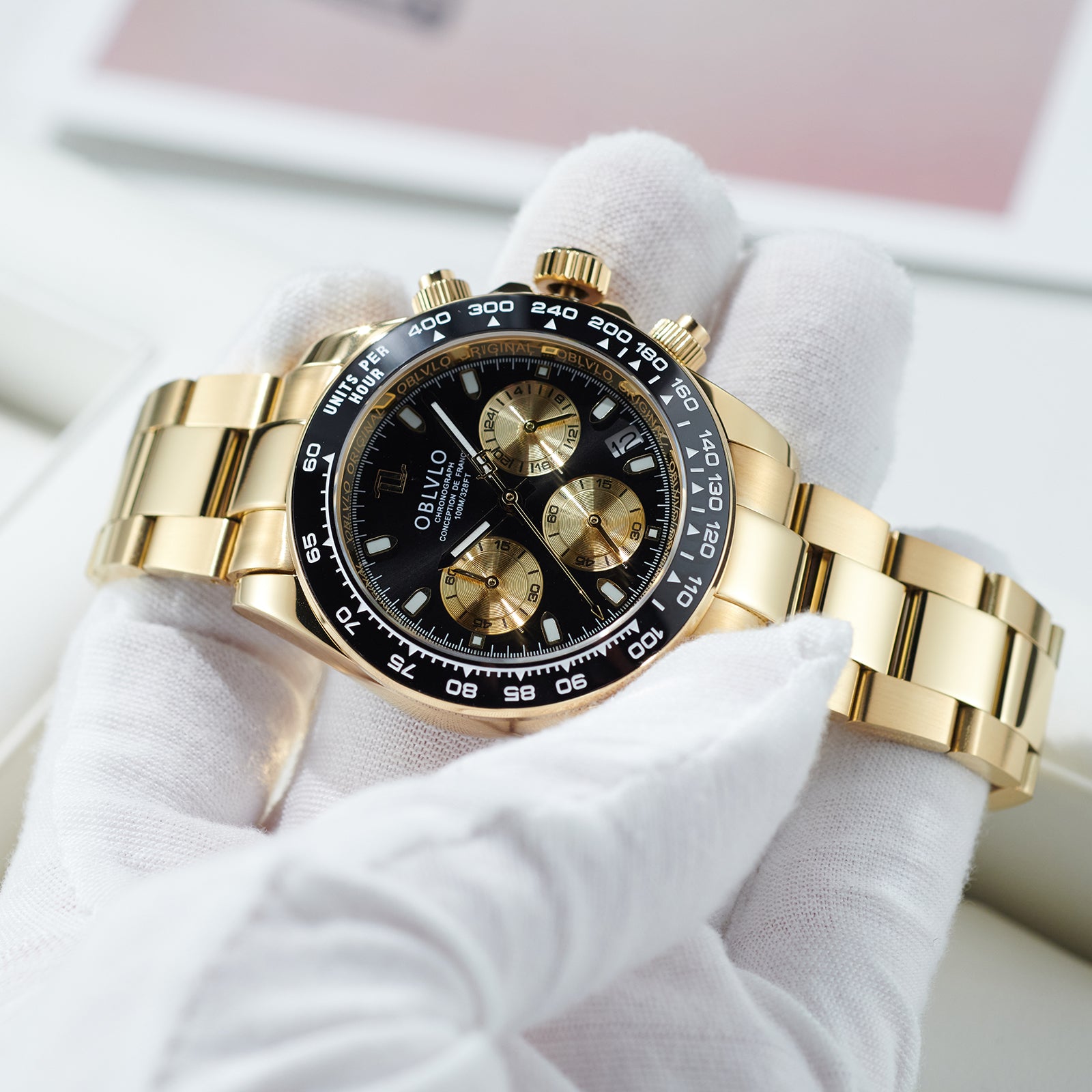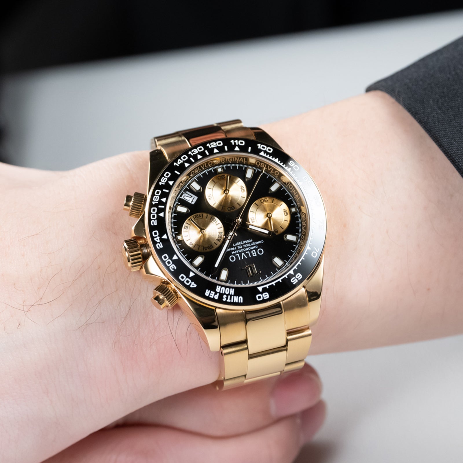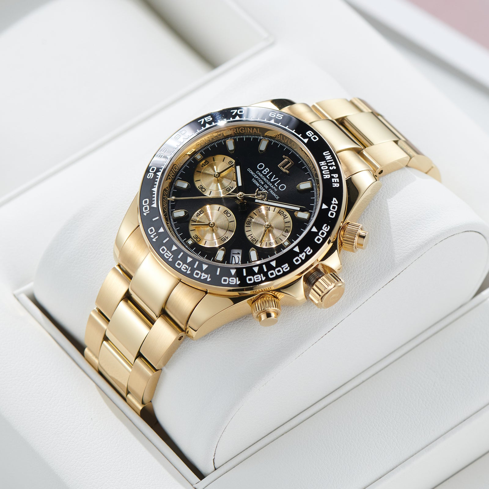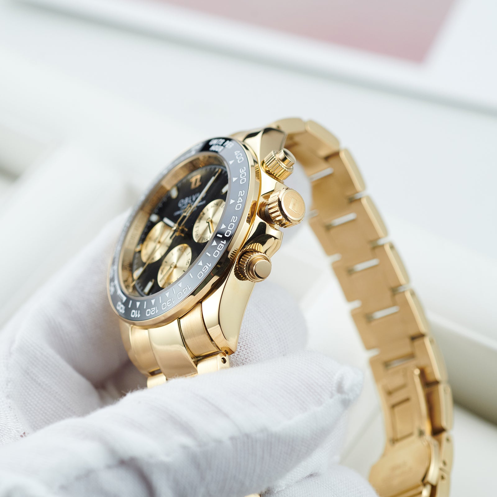 Dial Design: Black dial, MULTI-FUNCTIONAL CHRONOGRAPH: This is a functional watch that driving and speed lovers can dream of. The dial adopts a classic inverted triangle design and consists of three sub-dials, 24 hours, 60 minutes and 60 seconds. The timing button on the top right is (Start/Pause) and the timing button on the bottom right is (Reset to zero). There is a calendar window between 4 and 5 o'clock, with a tachymeter on the outer ring.