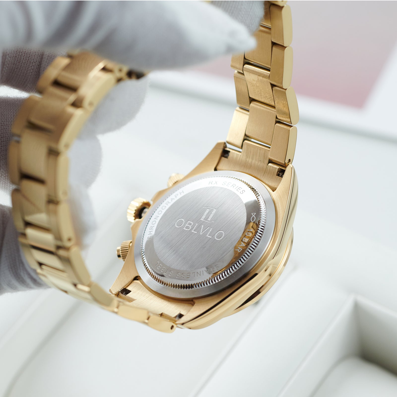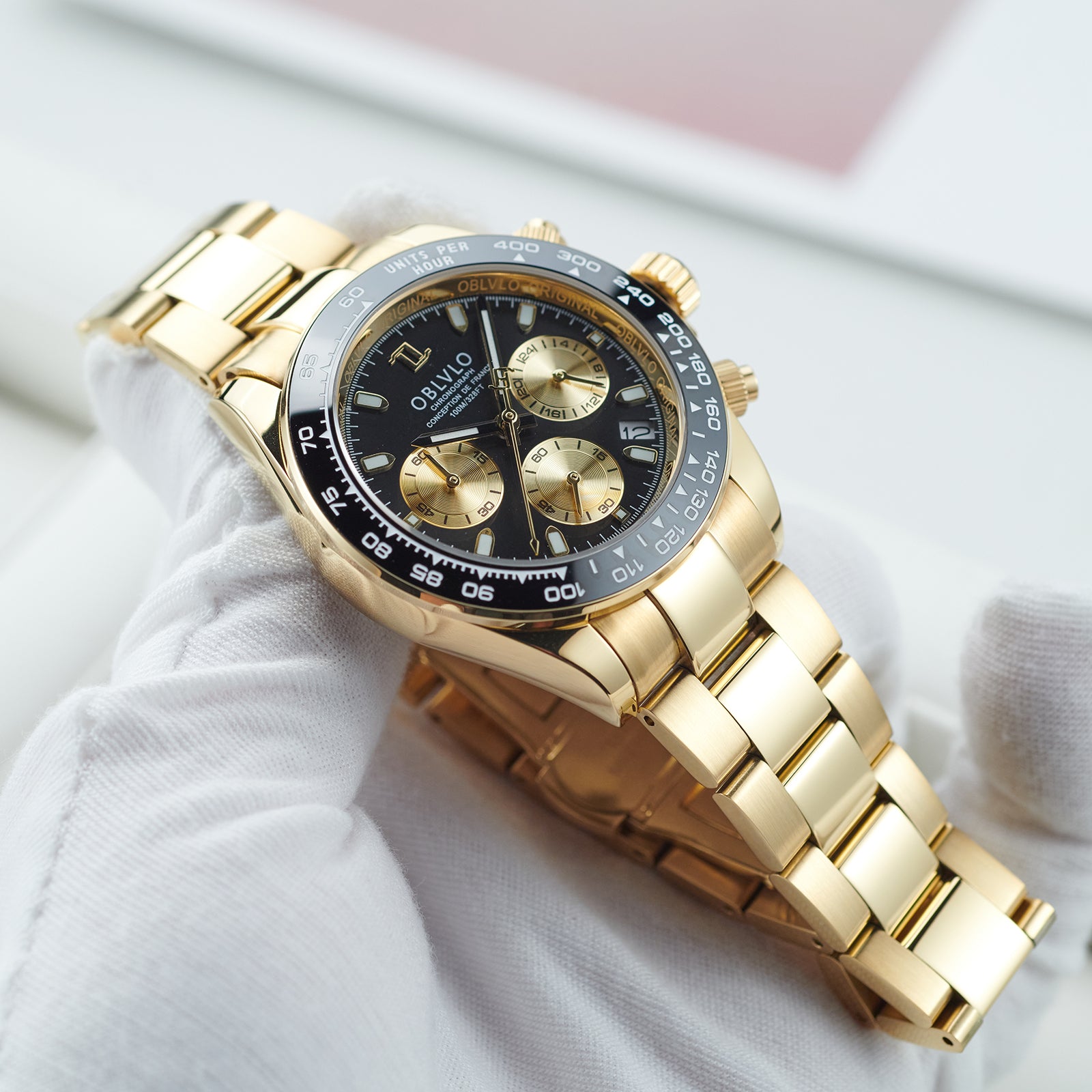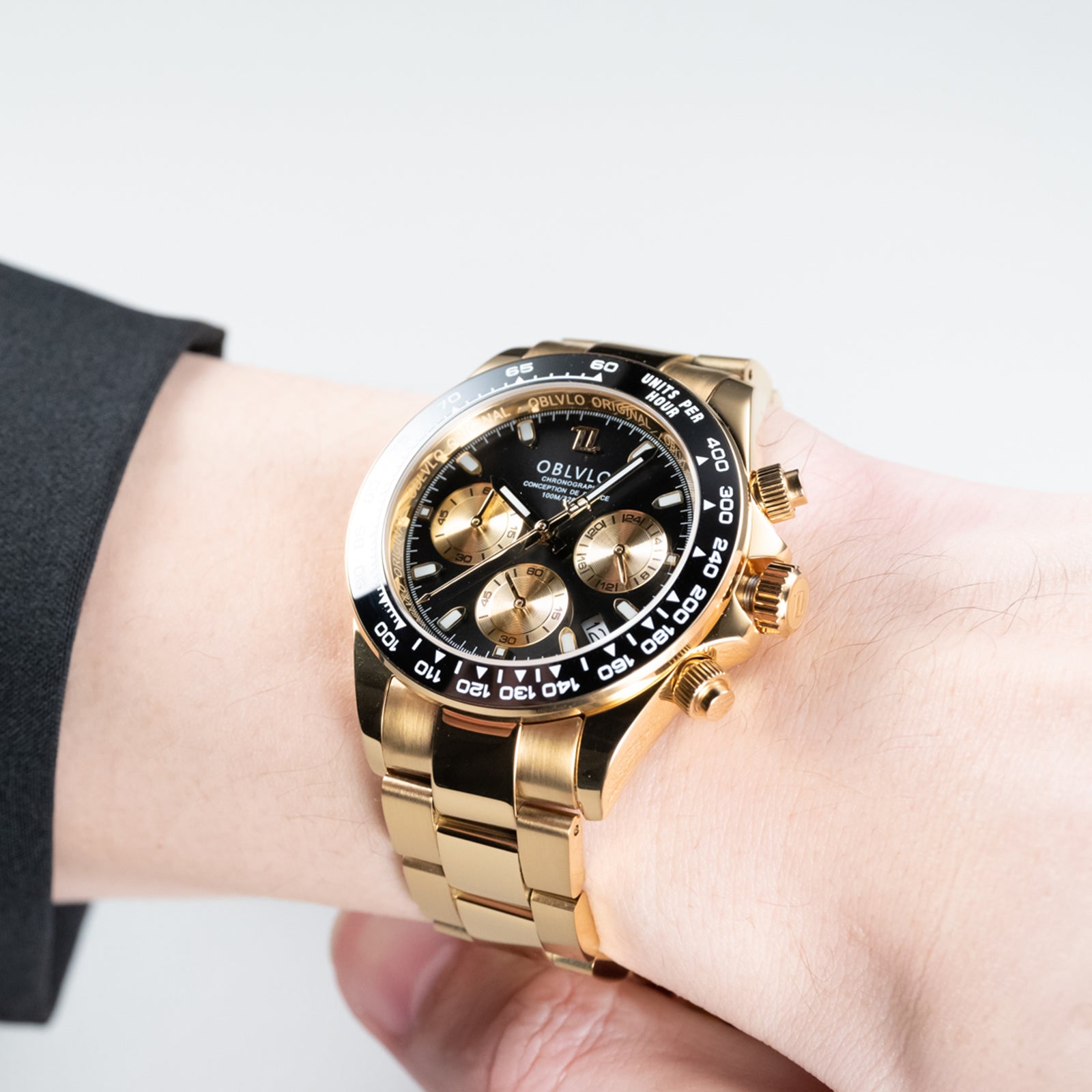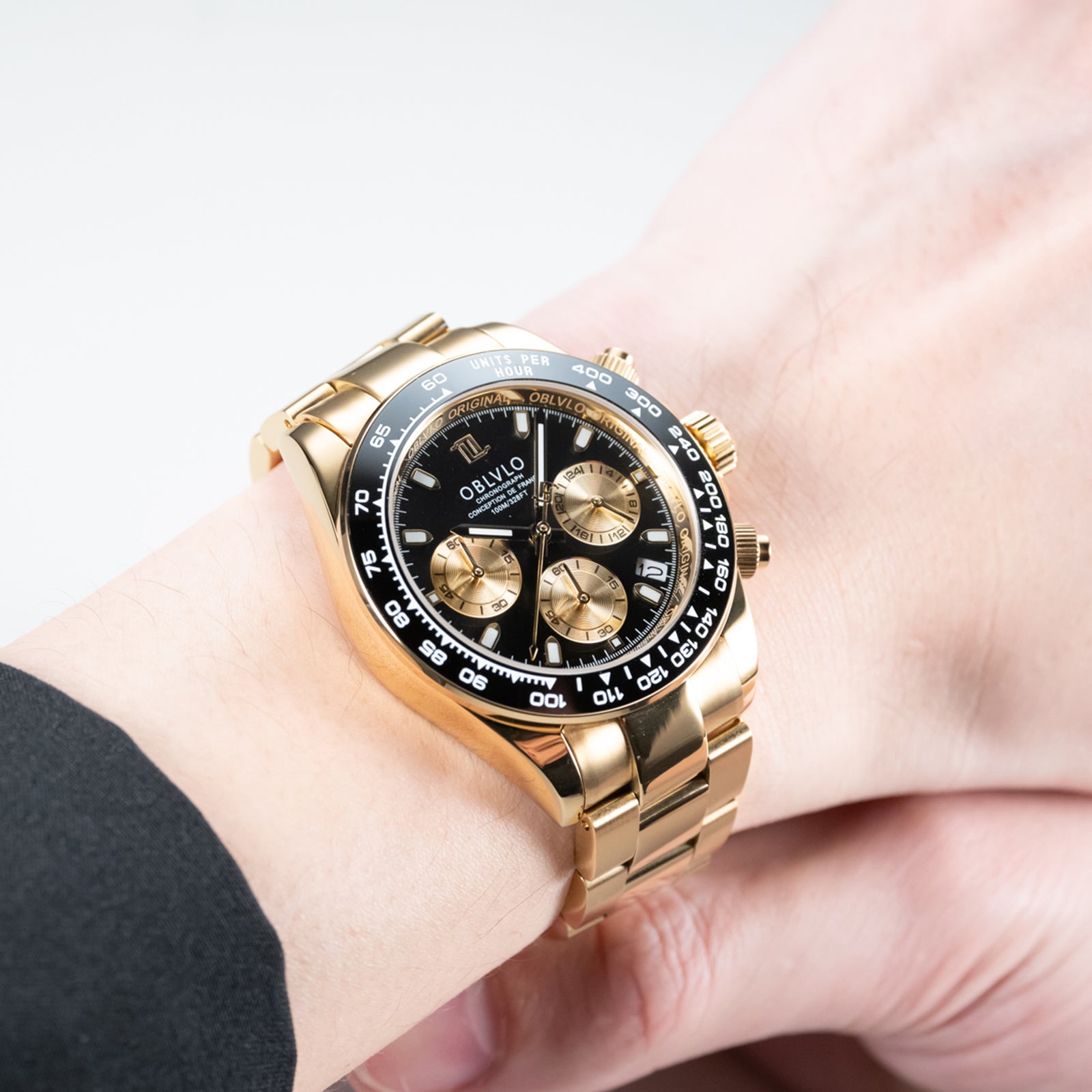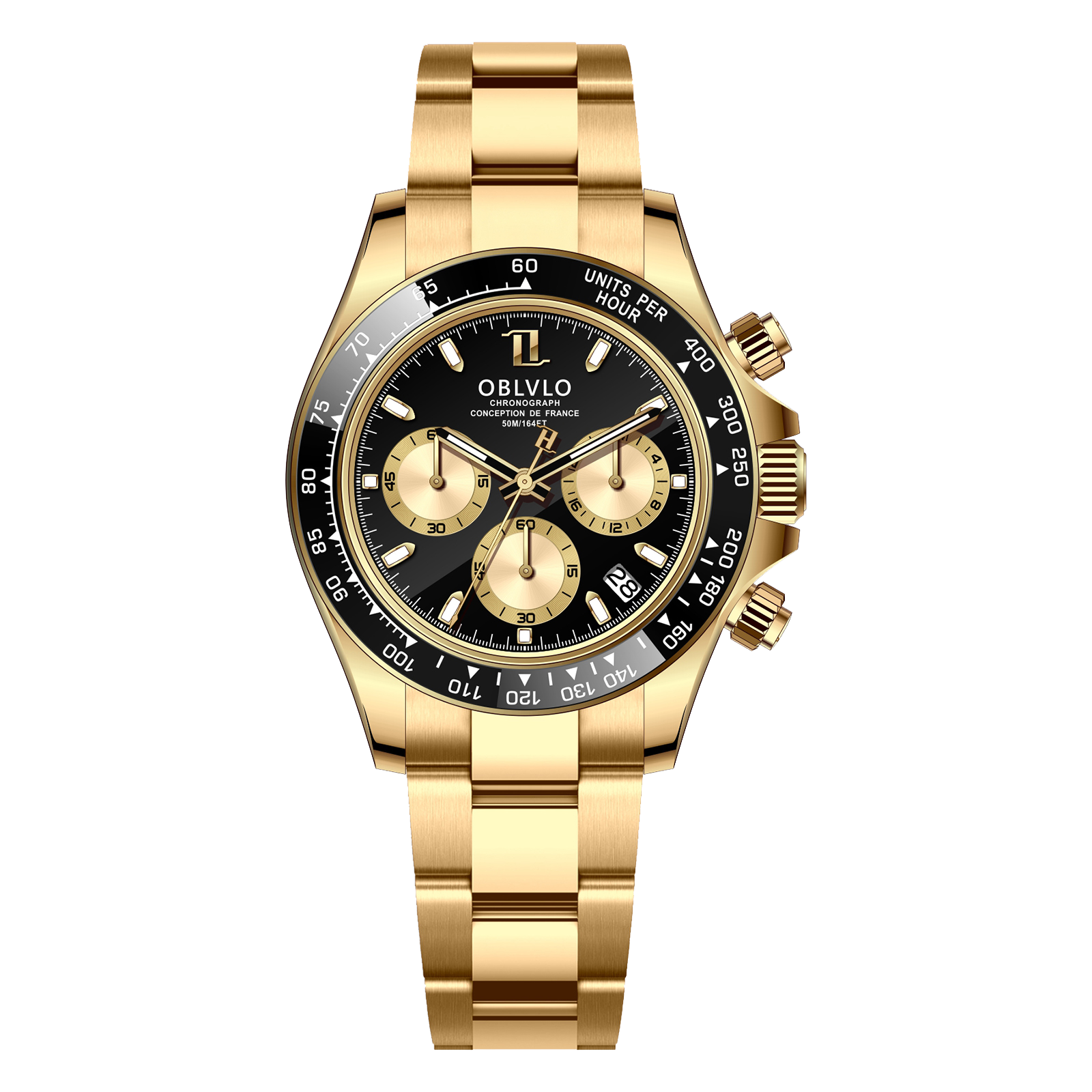 Dial Design: Black dial, MULTI-FUNCTIONAL CHRONOGRAPH: This is a functional watch that driving and speed lovers can dream of. The dial adopts a classic inverted triangle design and consists of three sub-dials, 24 hours, 60 minutes and 60 seconds. The timing button on the top right is (Start/Pause) and the timing button on the bottom right is (Reset to zero). There is a calendar window between 4 and 5 o'clock, with a tachymeter on the outer ring.