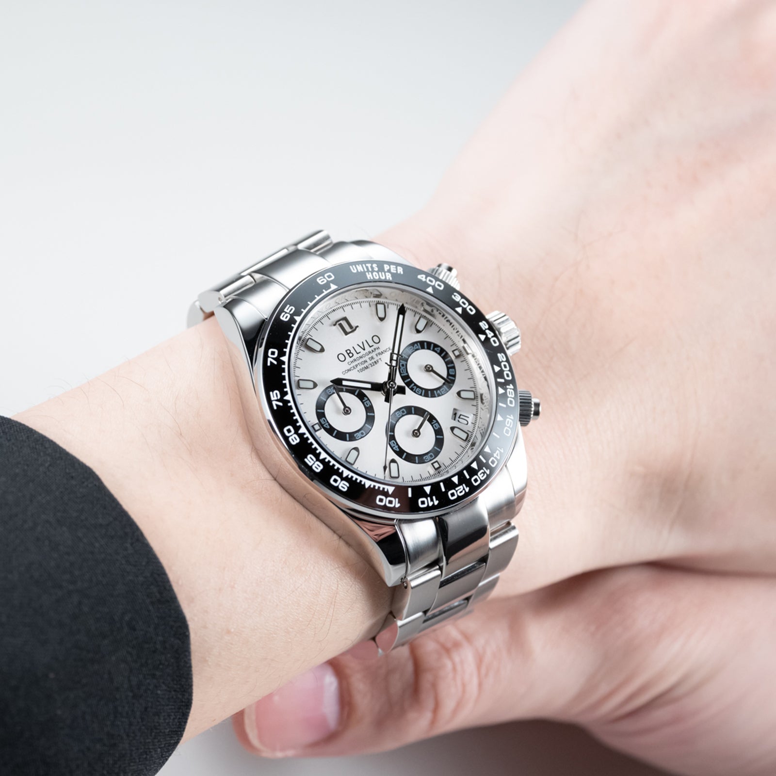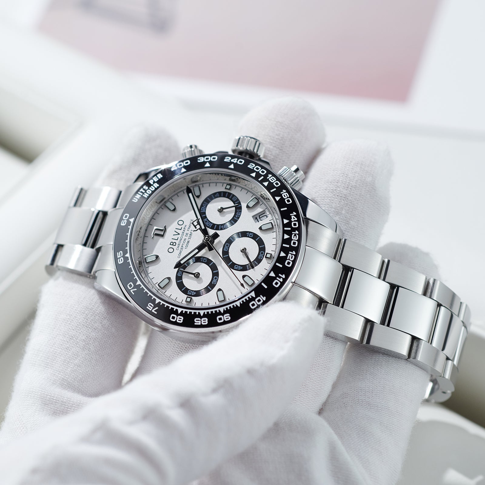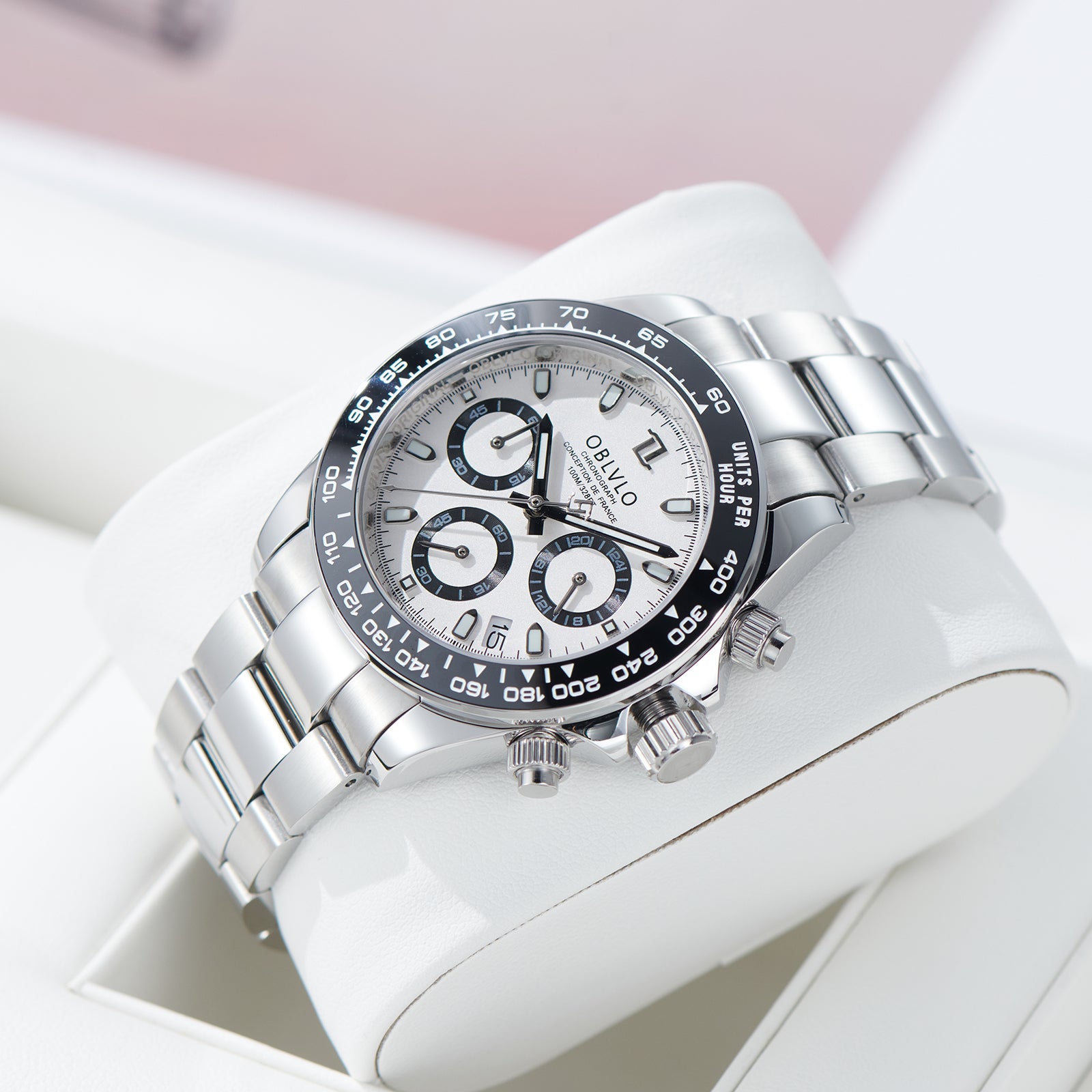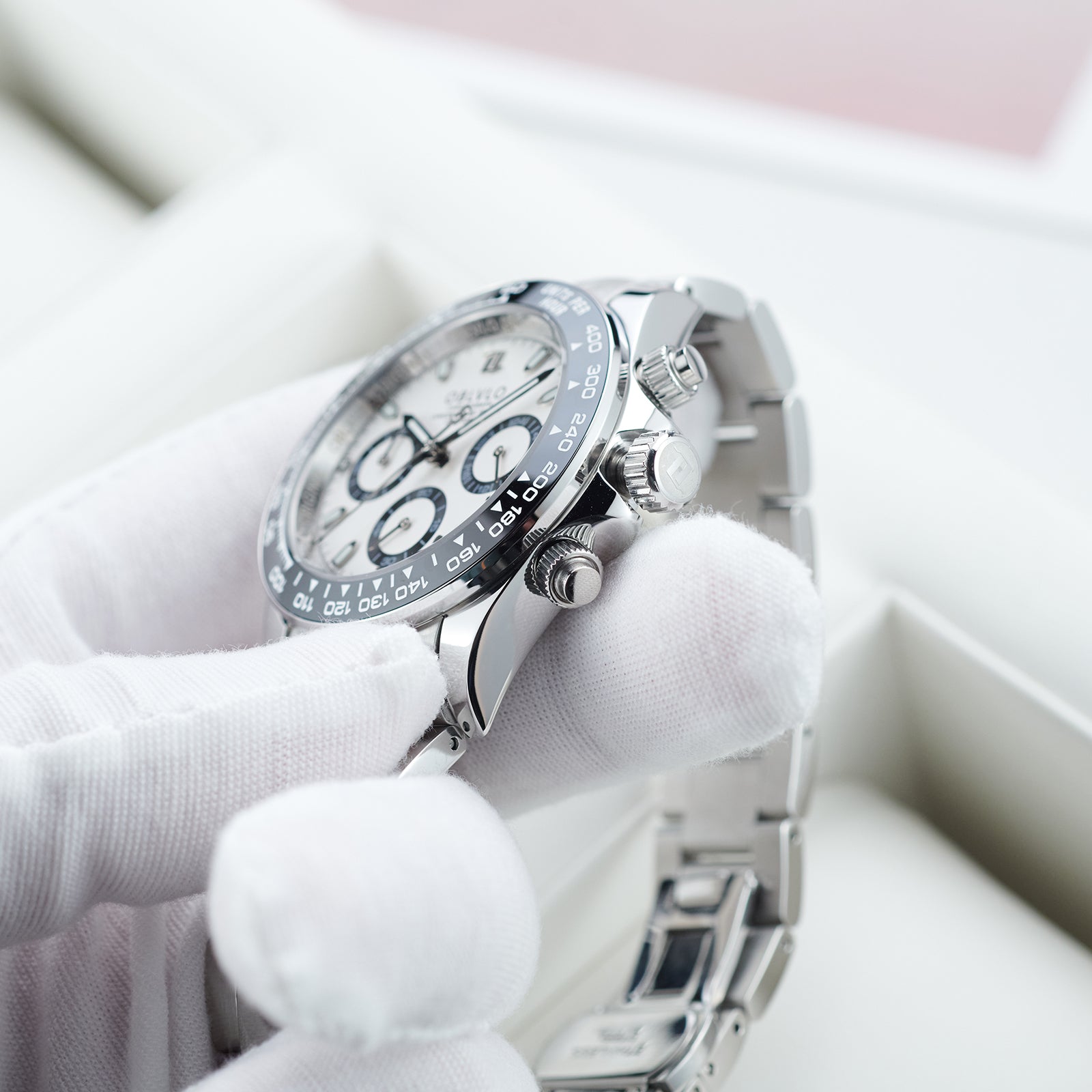 Dial Design: Panda dial, MULTI-FUNCTIONAL CHRONOGRAPH: This is a functional watch that driving and speed lovers can dream of. The dial adopts a classic inverted triangle design and consists of three sub-dials, 24 hours, 60 minutes and 60 seconds. The timing button on the top right is (Start/Pause) and the timing button on the bottom right is (Reset to zero). There is a calendar window between 4 and 5 o'clock, with a tachymeter on the outer ring.