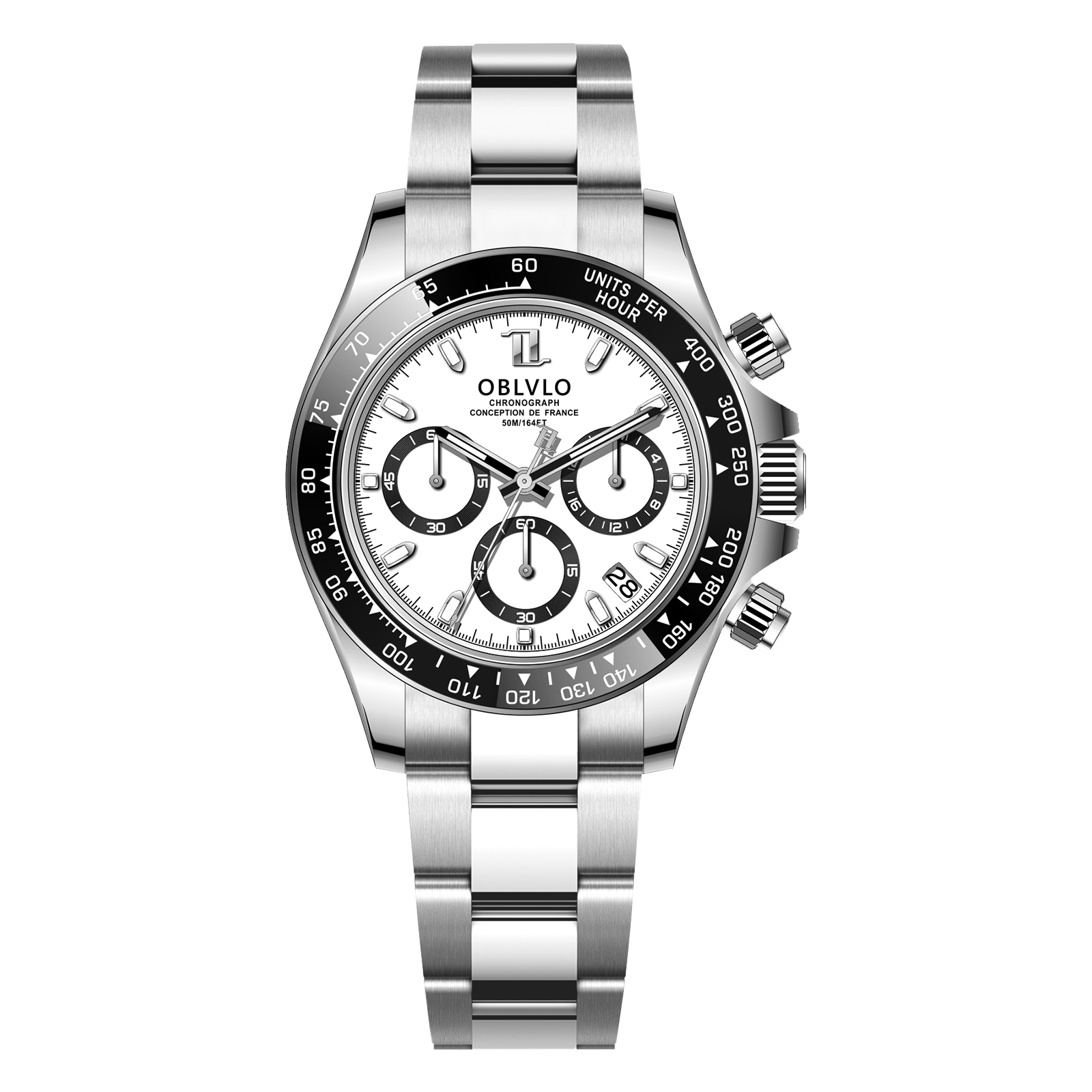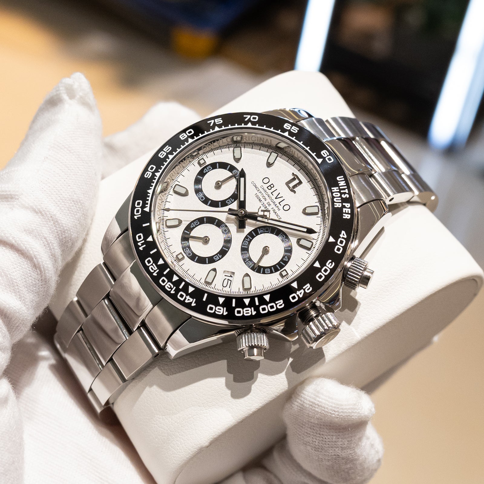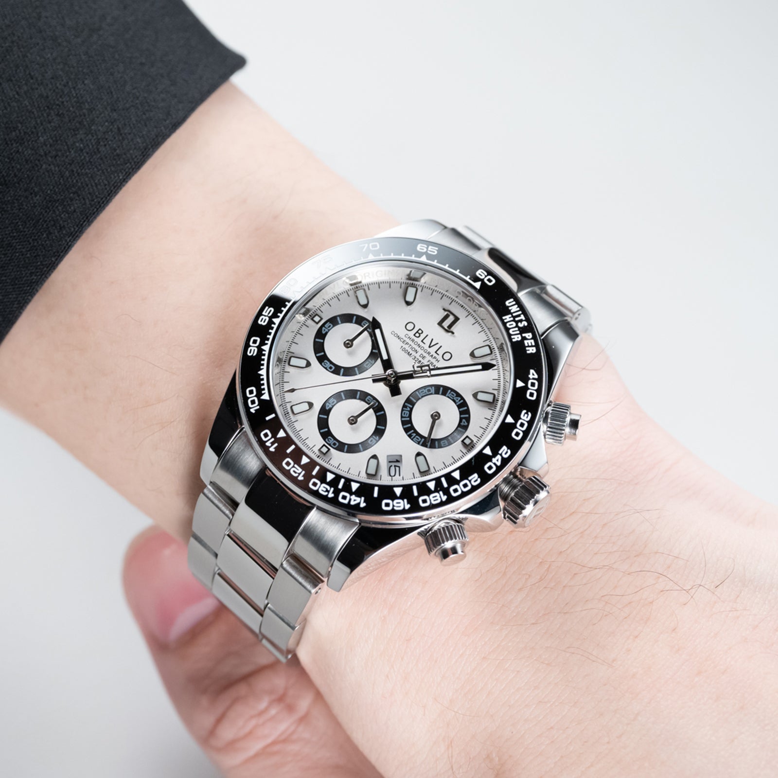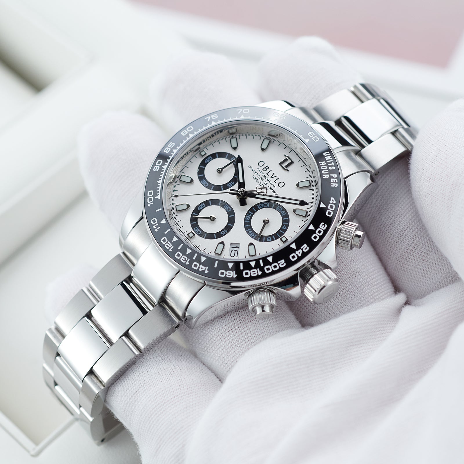 Dial Design: Panda dial, MULTI-FUNCTIONAL CHRONOGRAPH: This is a functional watch that driving and speed lovers can dream of. The dial adopts a classic inverted triangle design and consists of three sub-dials, 24 hours, 60 minutes and 60 seconds. The timing button on the top right is (Start/Pause) and the timing button on the bottom right is (Reset to zero). There is a calendar window between 4 and 5 o'clock, with a tachymeter on the outer ring.
