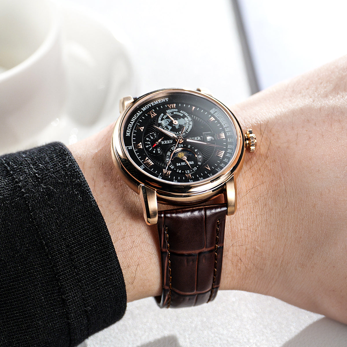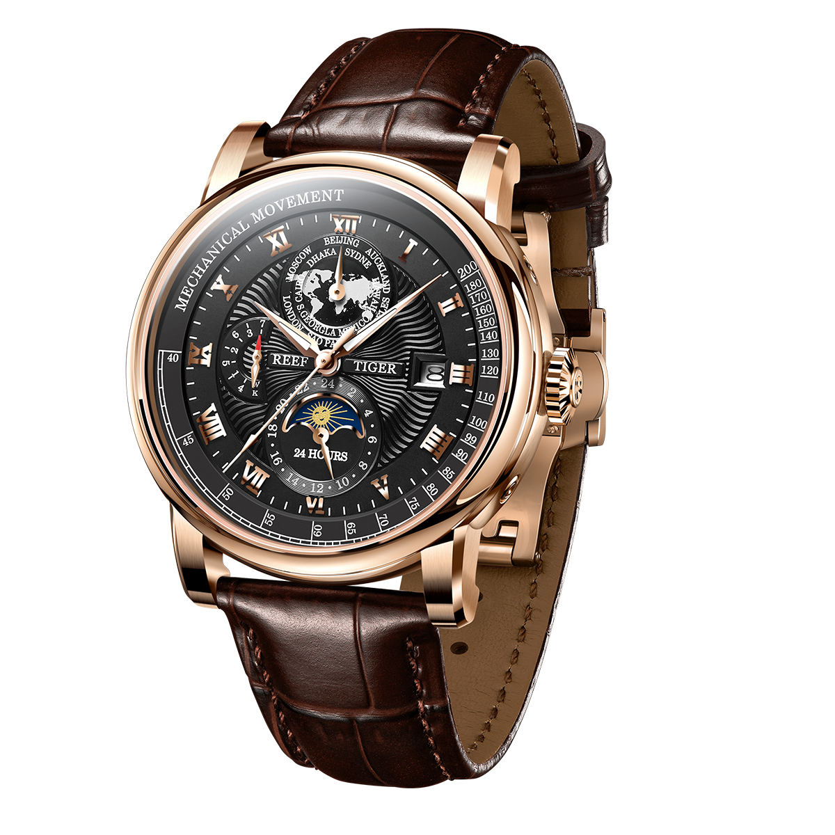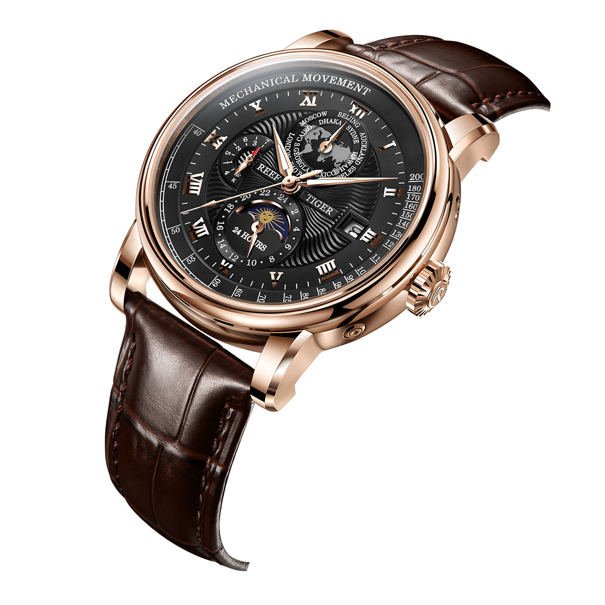 Dial Design: Black Dial & Watch face is designed with simplified 12 o'clock position world time, 3 hours with calendar window, 6 hours day/night/24 hours instruction & moonphase style dial.