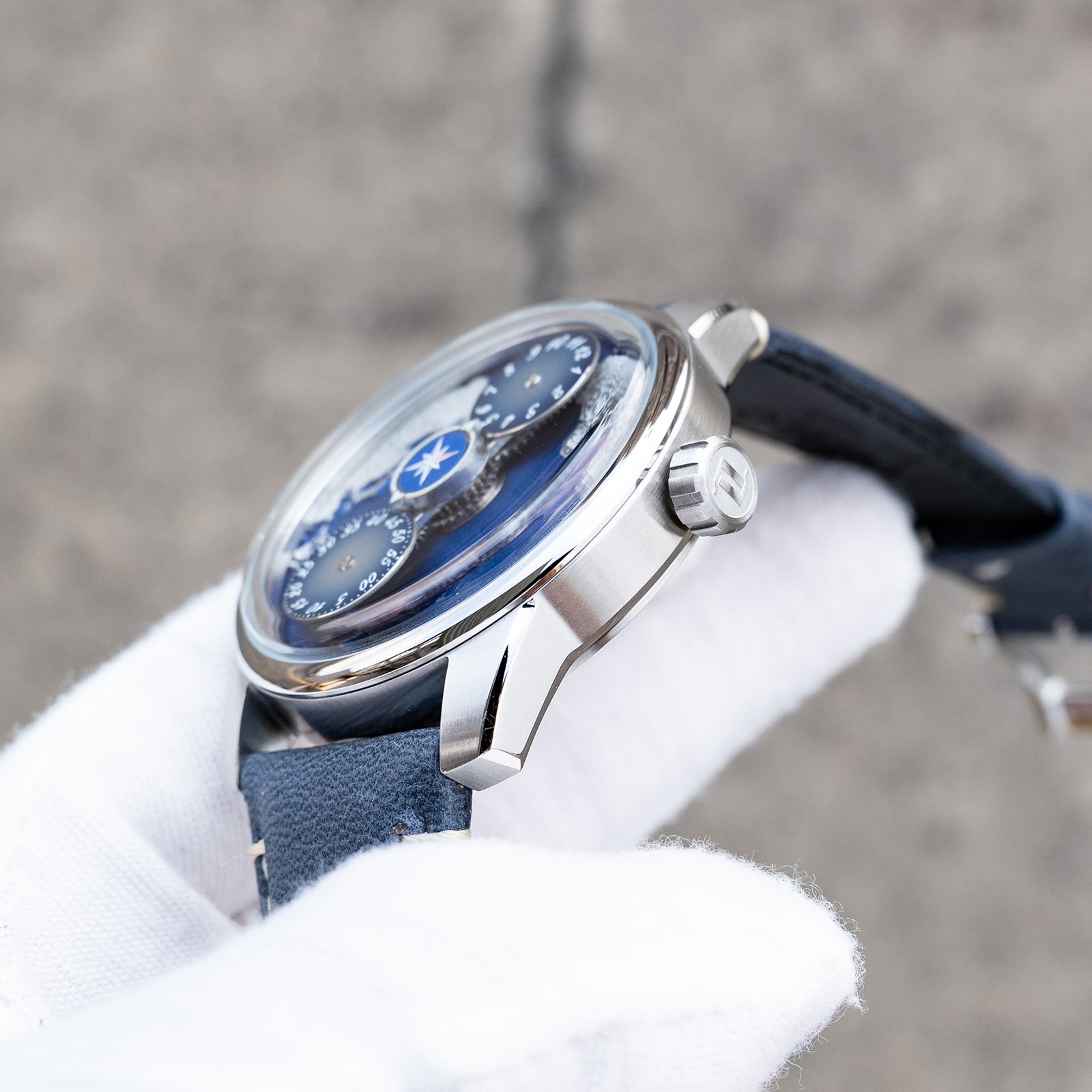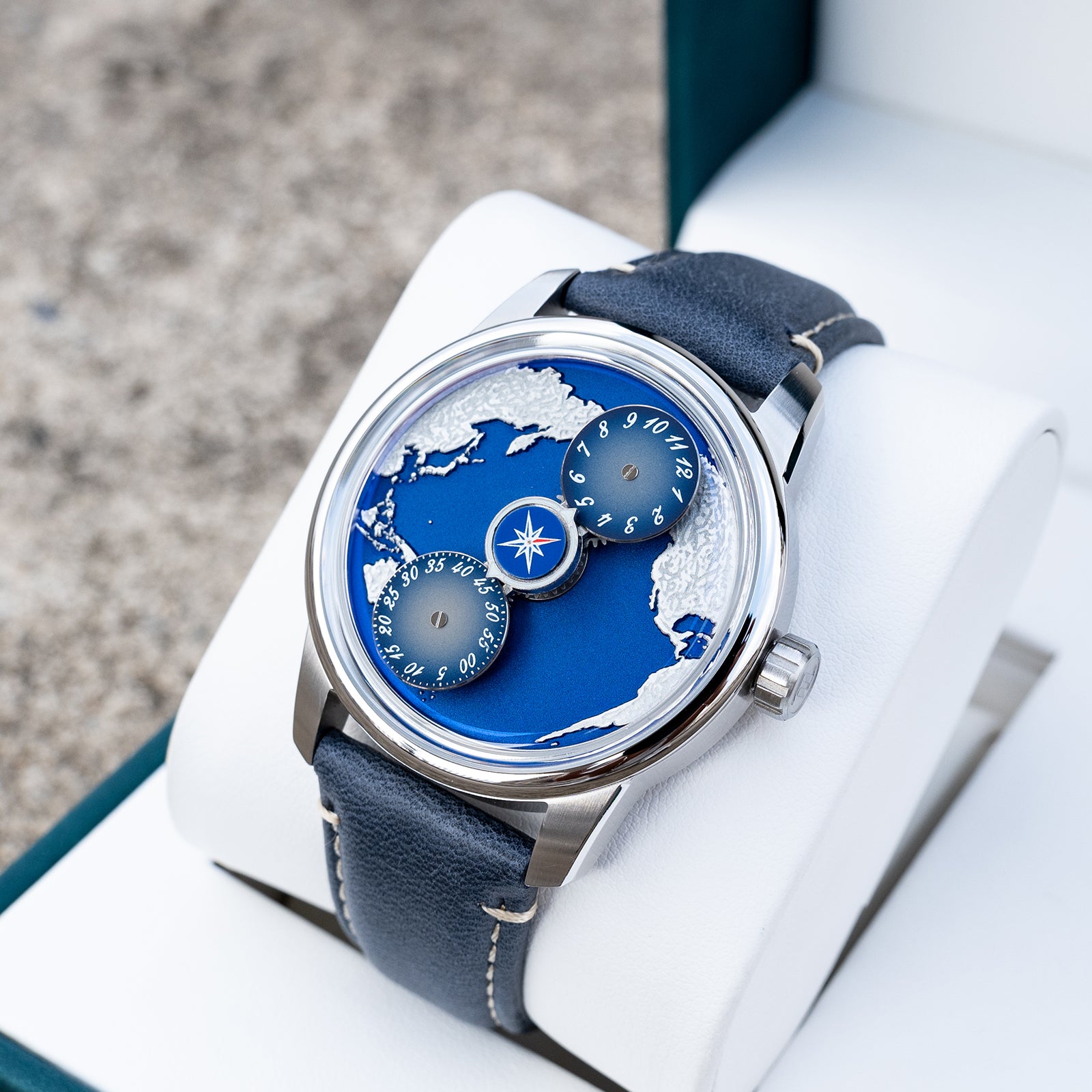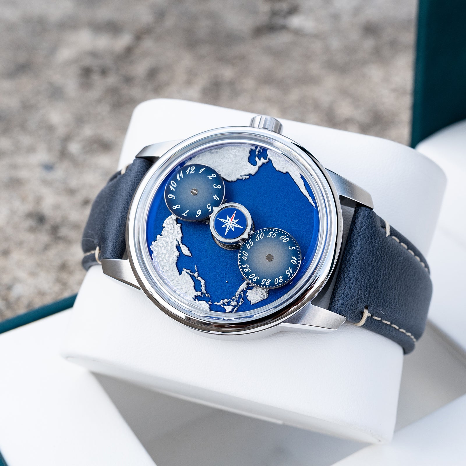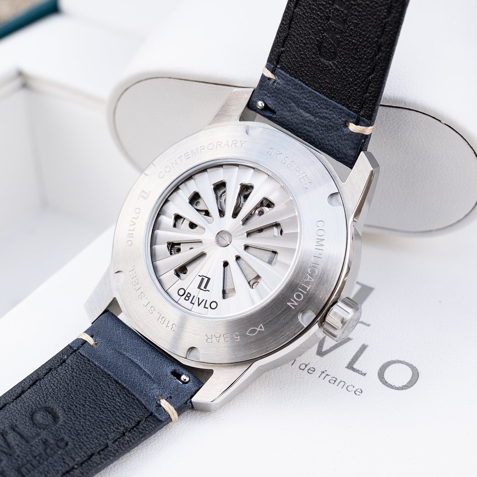 The sapphire crystal glass face ensures durability and scratch resistance, while the blue Italian calfskin strap adds a touch of luxury and comfort to the overall wearing experience.With a water resistance of 5BAR/5ATM/50M, the OBLVLO JM EARTH is suitable for everyday wear and can withstand splashes and brief immersion in water. The folding buckle ensures a secure and comfortable fit on the wrist, making it an ideal companion for both formal occasions and casual outings.