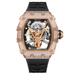 Crafted with precision and attention to detail, the OBLVLO XM FIG Series features a tonneau case shape made of 316 stainless steel plated with rose gold and adorned with Swarovski crystal white diamonds on the bezel. The dial showcases a mesmerizing skeleton design, complemented by a unique gold rock and roll skeleton hand sign that sets these skeleton watches apart from the rest.
