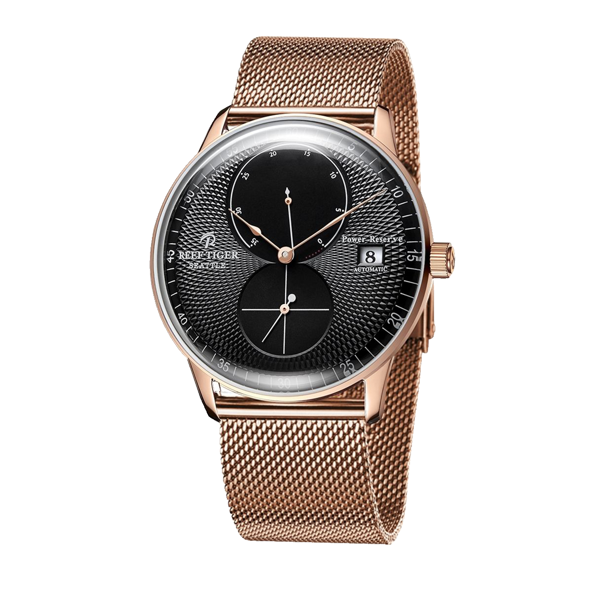 The Reef Tiger Seattle Navy 1 Series presents a stunning collection of luxury rose gold men's dress watches, with the Model No. RGA82B0-04 standing out as a true epitome of elegance and sophistication.