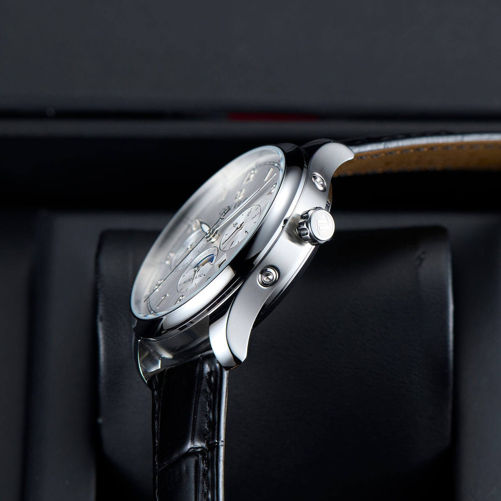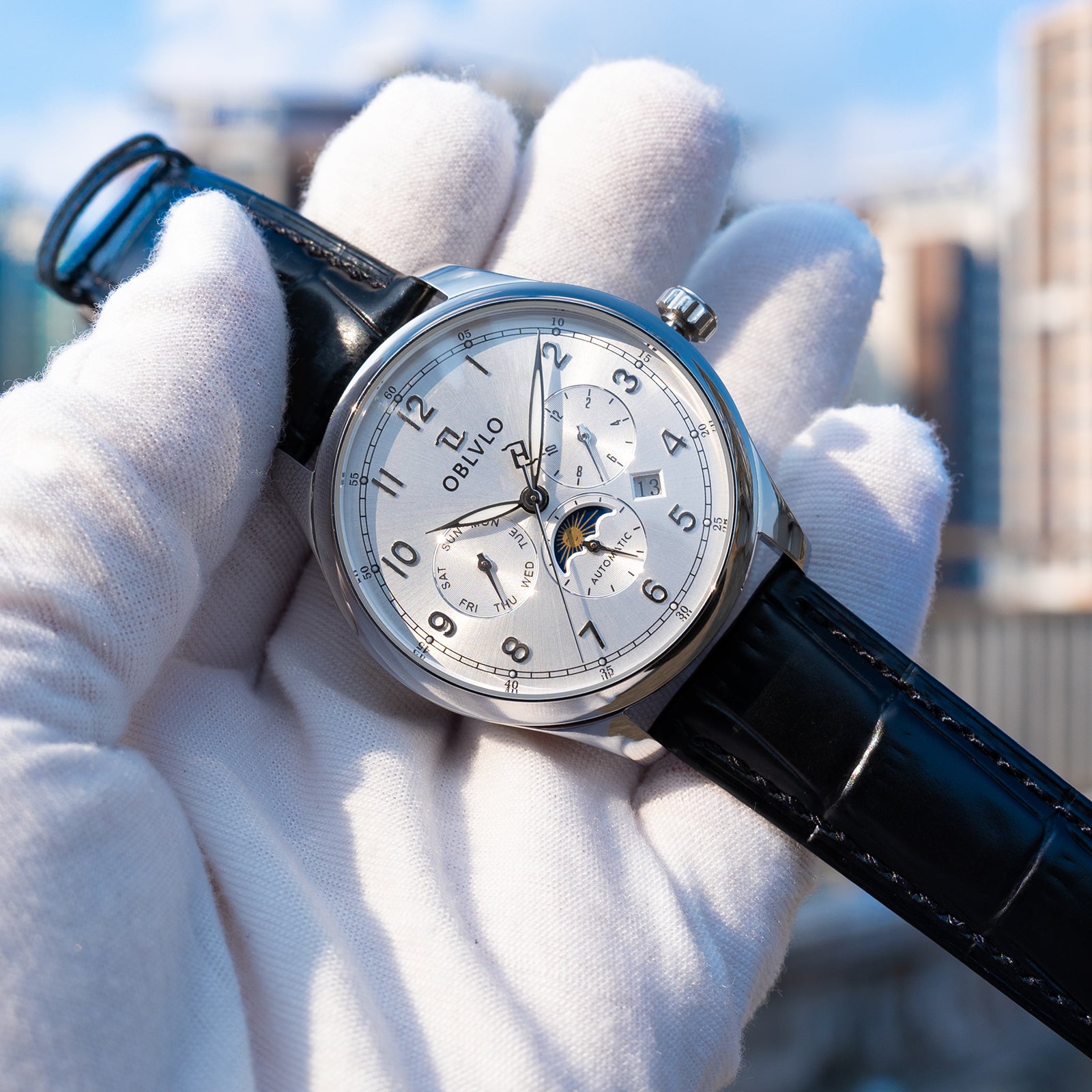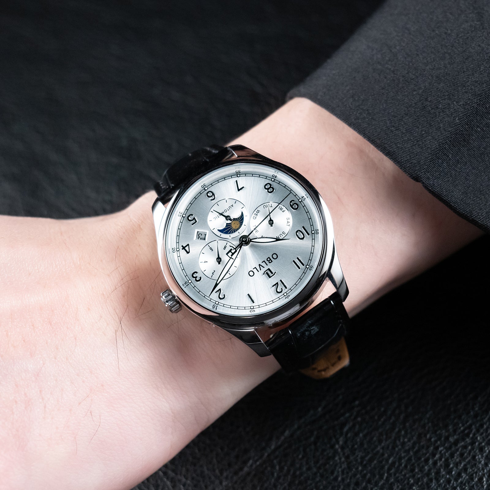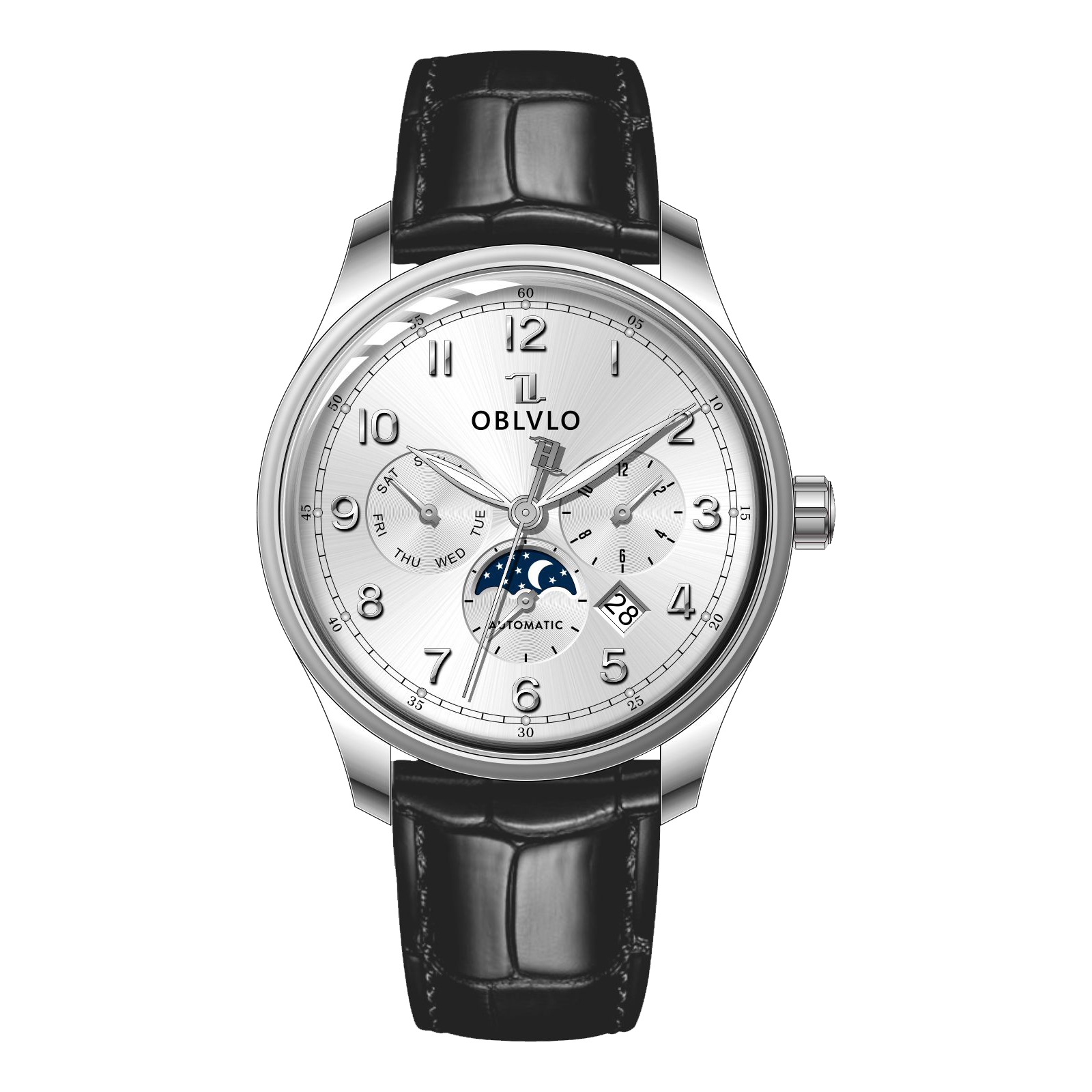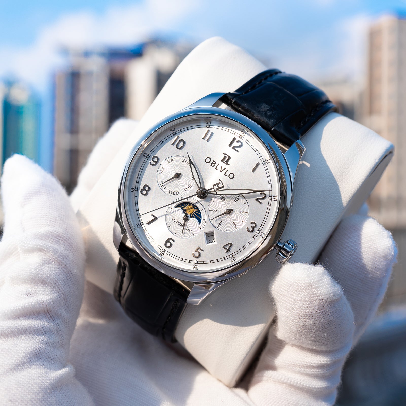 Dial Design: The White Multi-function Dial: Features an intricate moon and sun phase indicator at 6 o'clock position, adding both functionality and visual appeal. With classic and simple as the keynote, this watch showcases nature and leisure, polished by age, exuding a unique temperament of chic without losing texture.