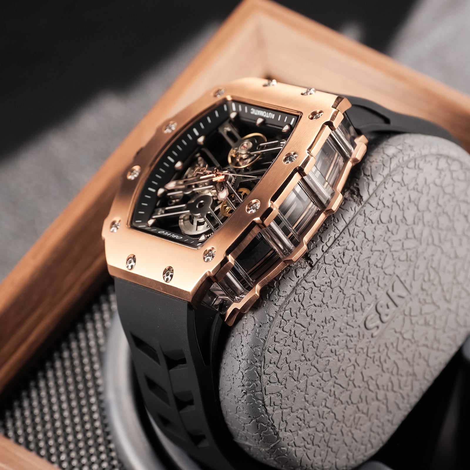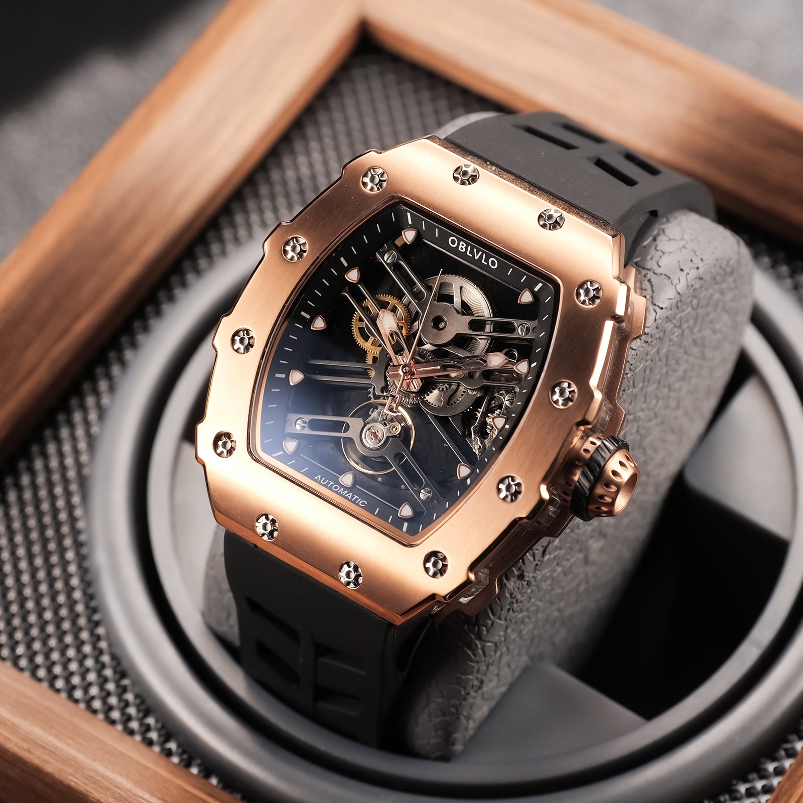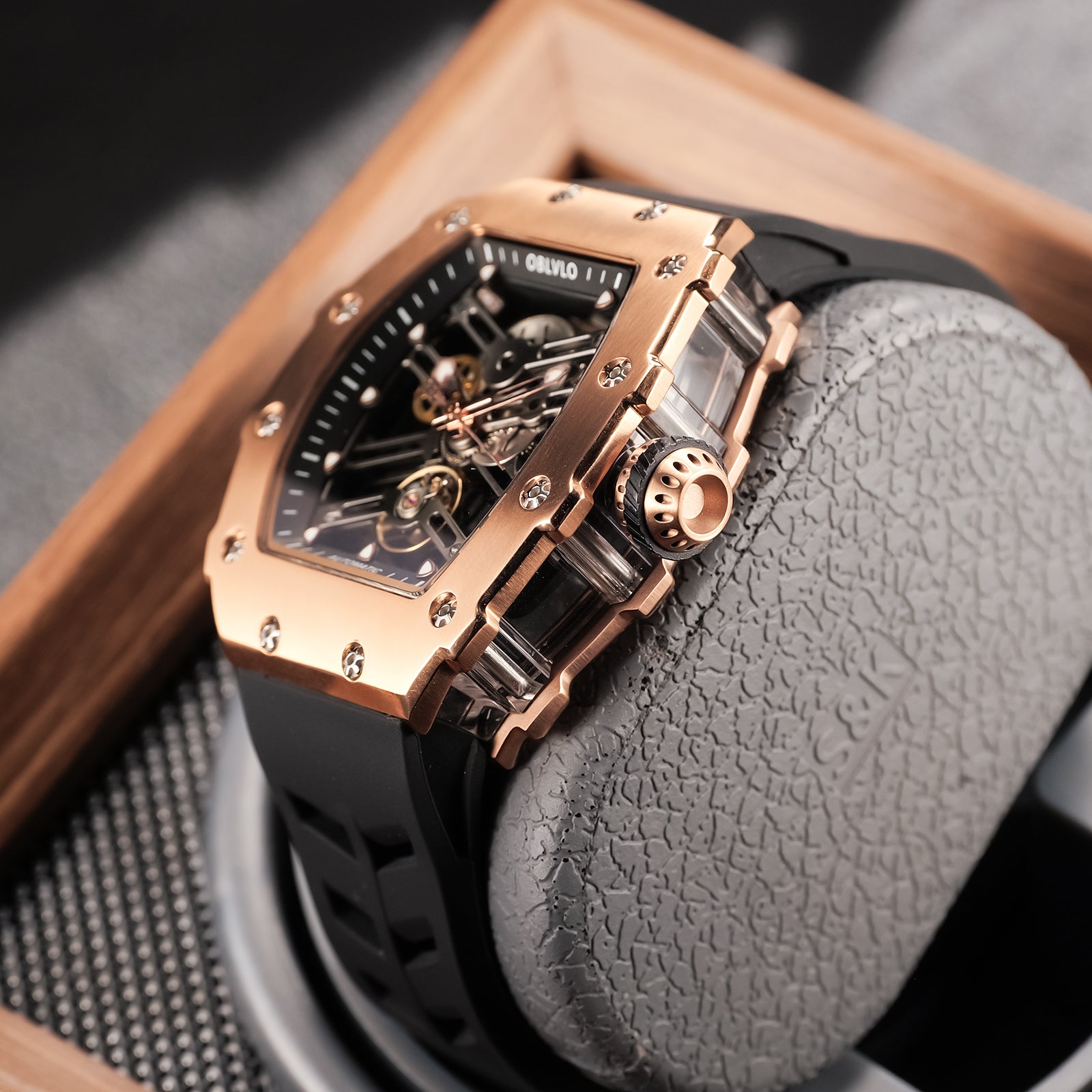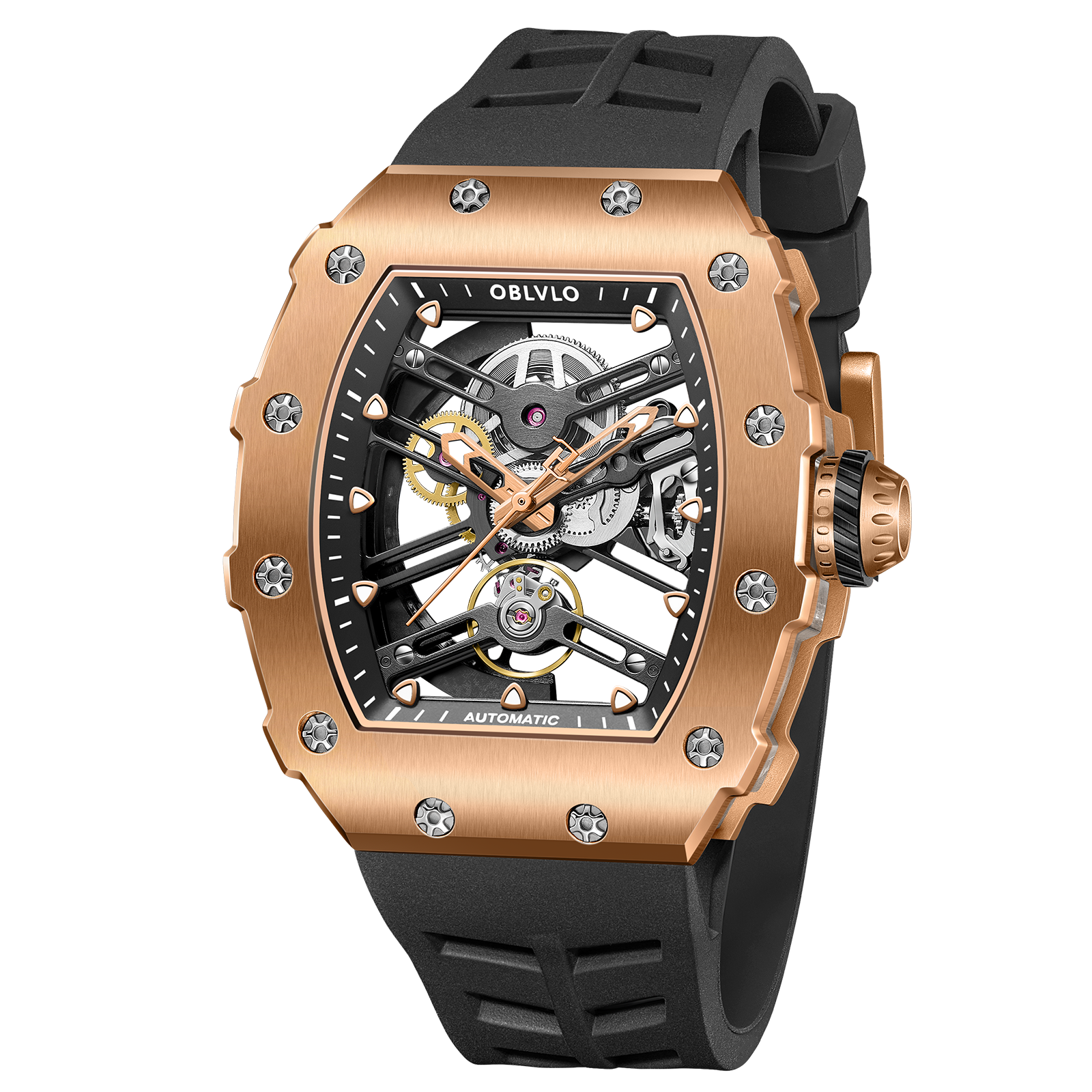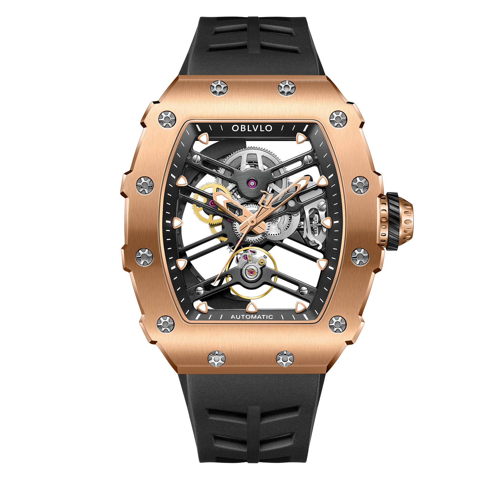 The OBLVLO XM XSK Series Cool Automatic Rose Gold Skeleton Watch. Crafted with precision, the case of this timepiece is made of 316 stainless steel plated with luxurious rose gold, giving it a sleek and premium look. The tonneau case shape adds a touch of uniqueness and sophistication to the watch's overall aesthetic.