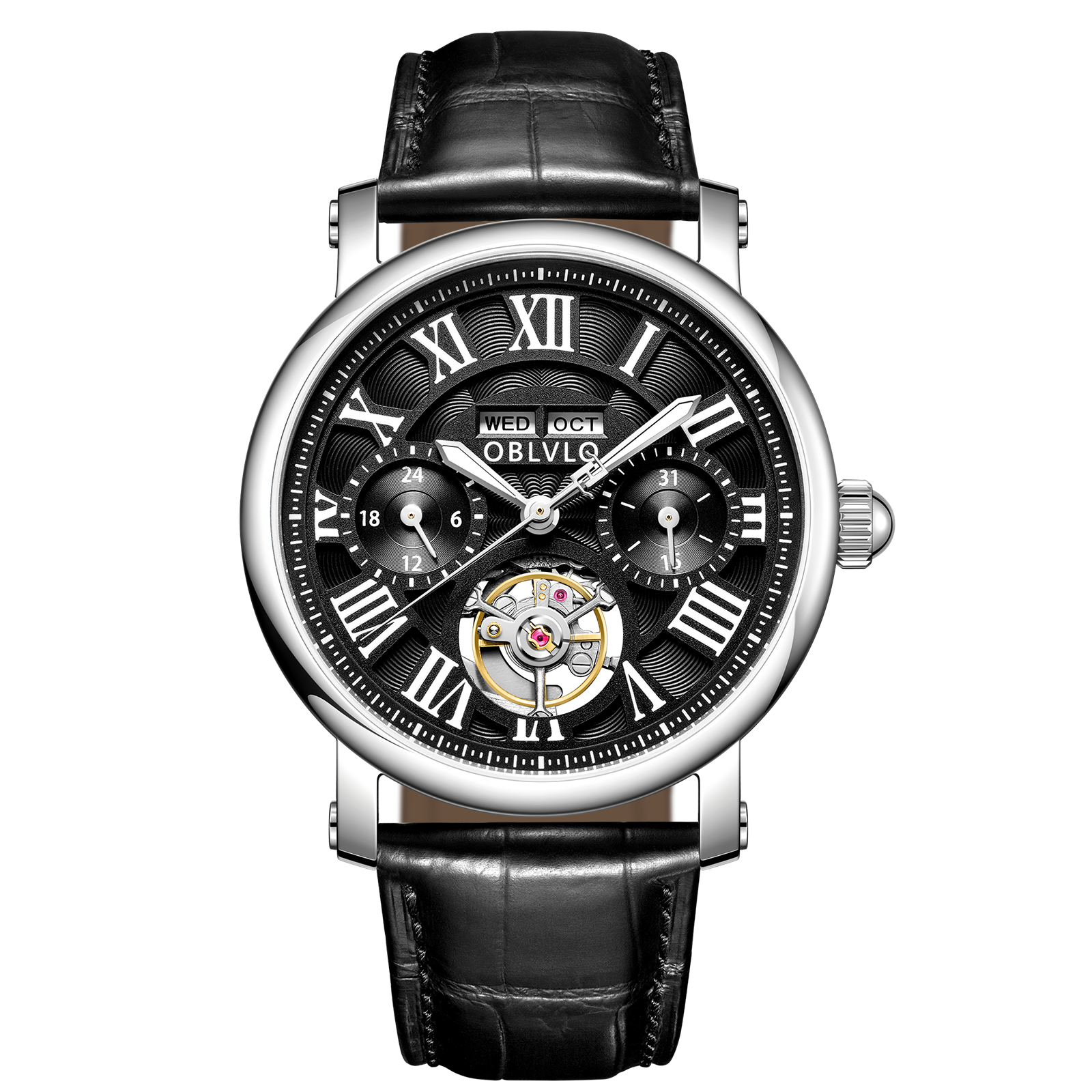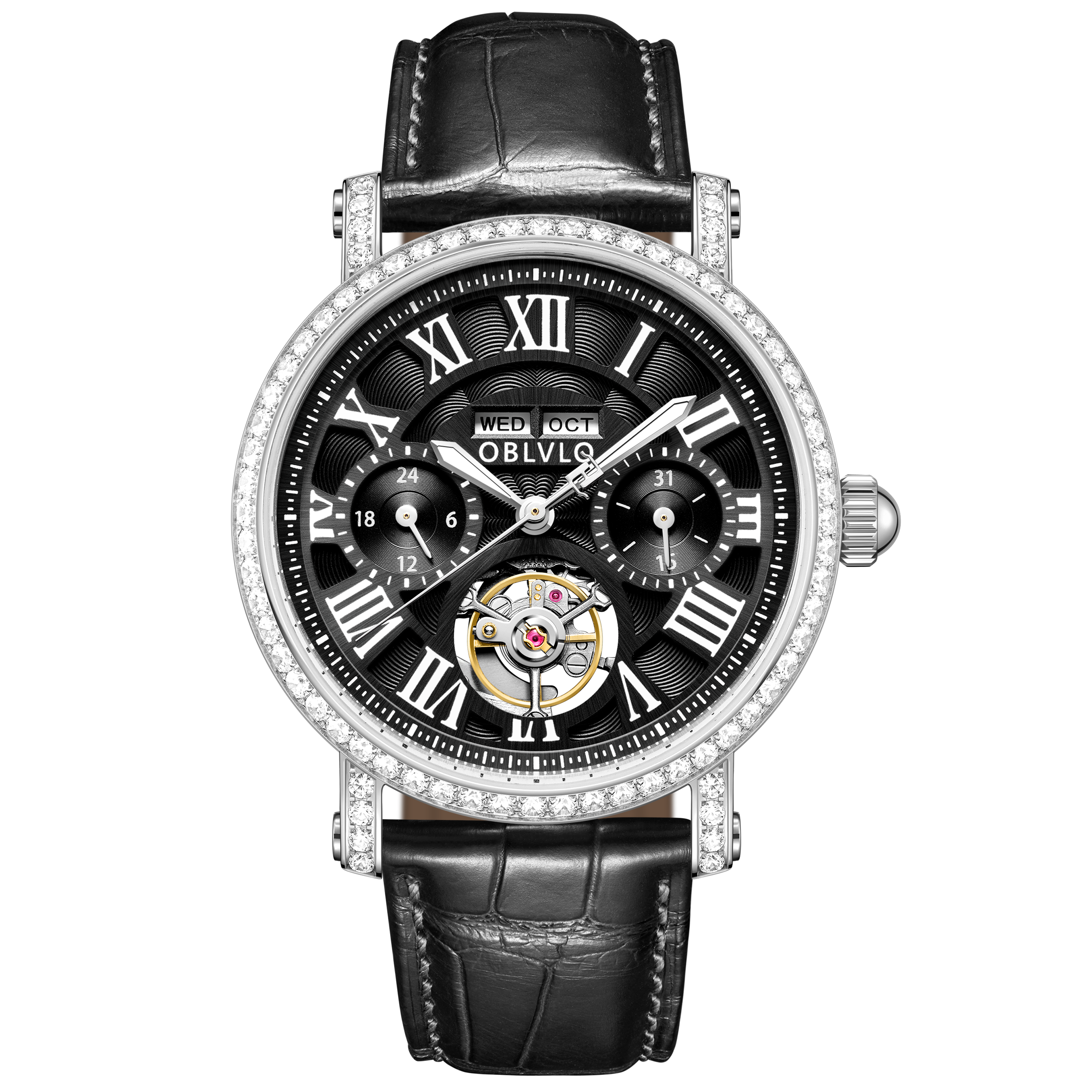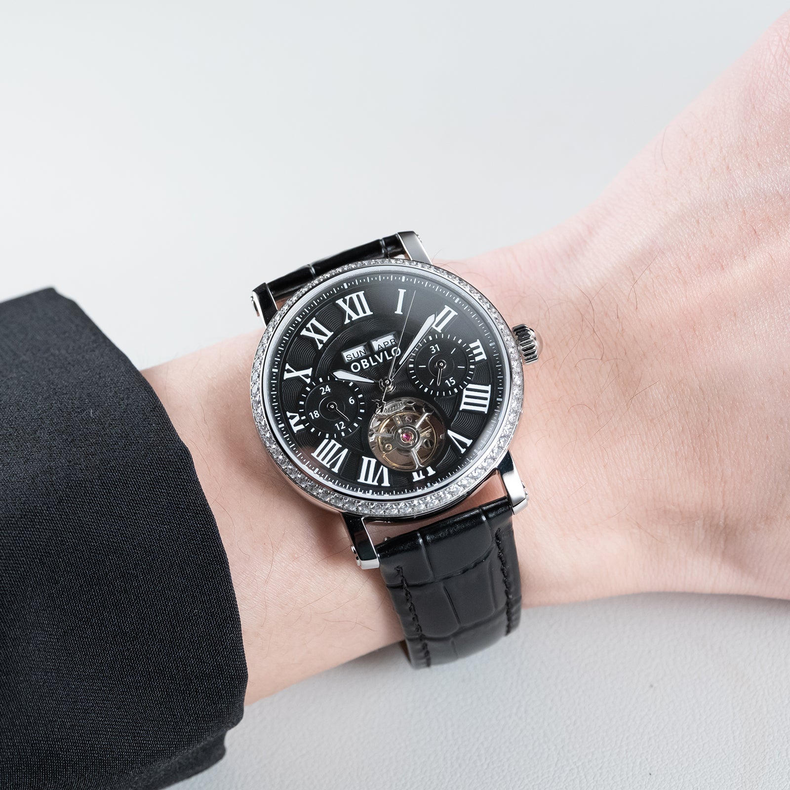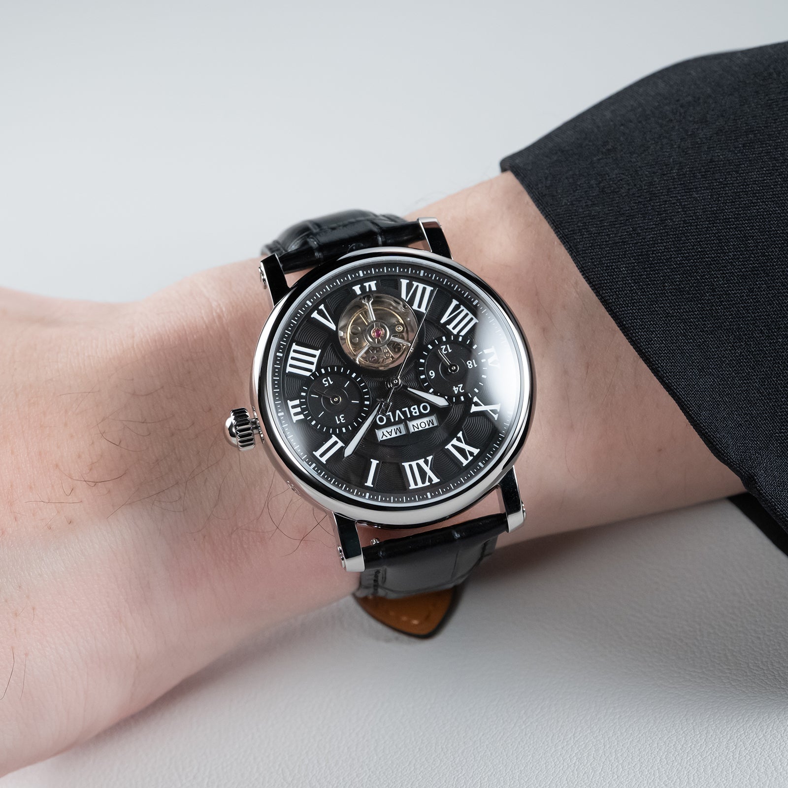 Dial Design: Black Dial, Tourbillon style & Multi-Function designed functions of year/month/week/day to meet all customer needs, Adding texture to the multi-layered dial with roman markings Zirconia Bezel, designed to enhance style, Show off tast!