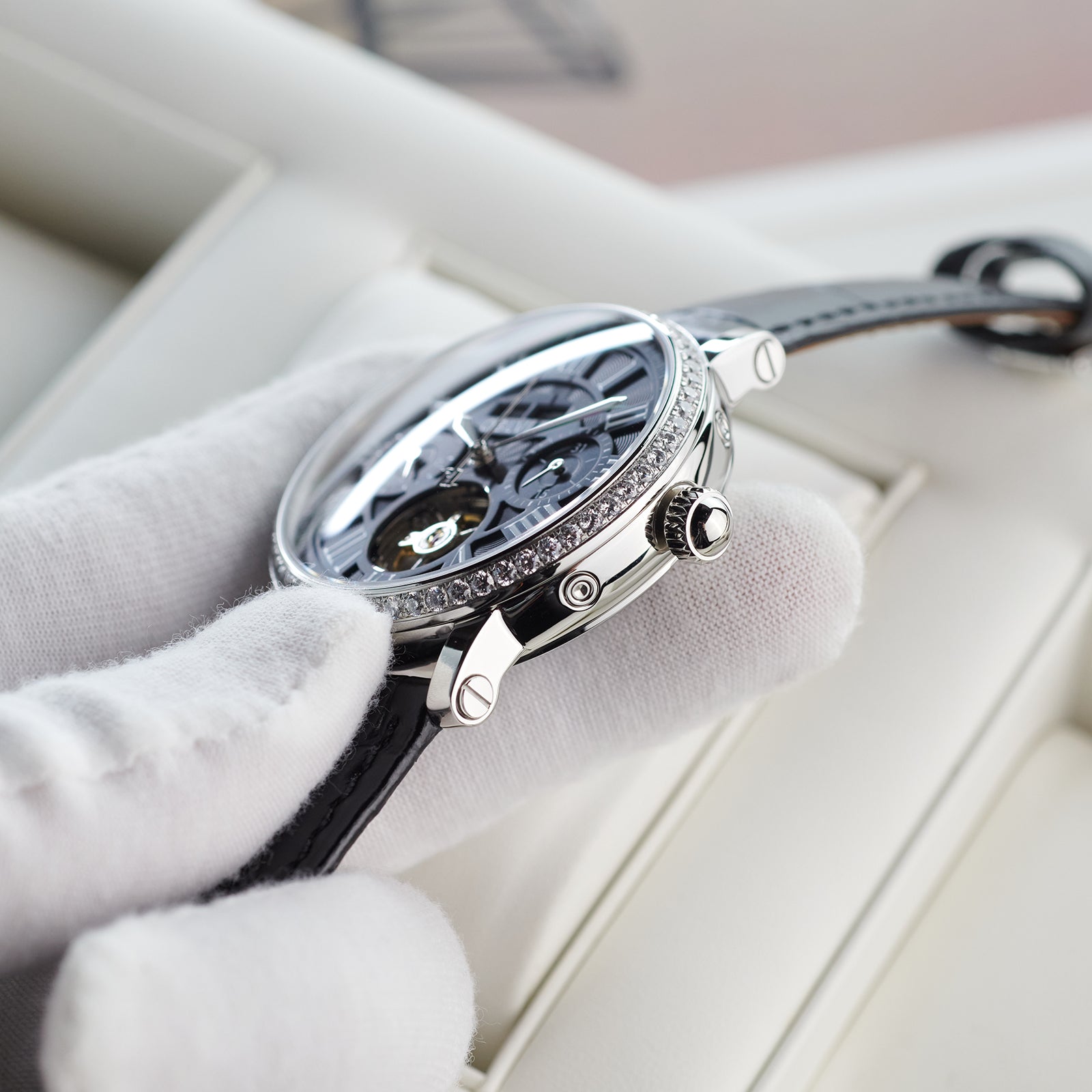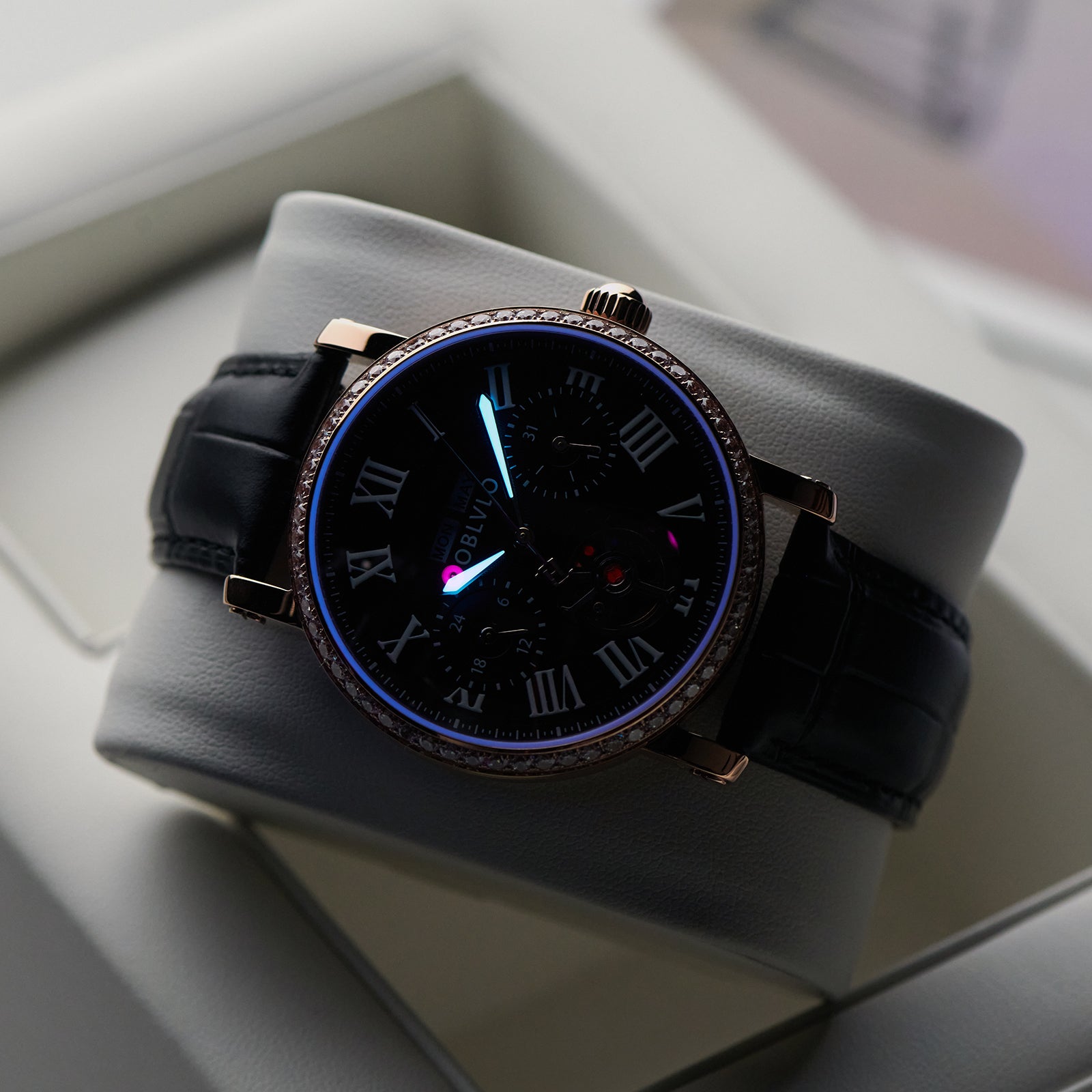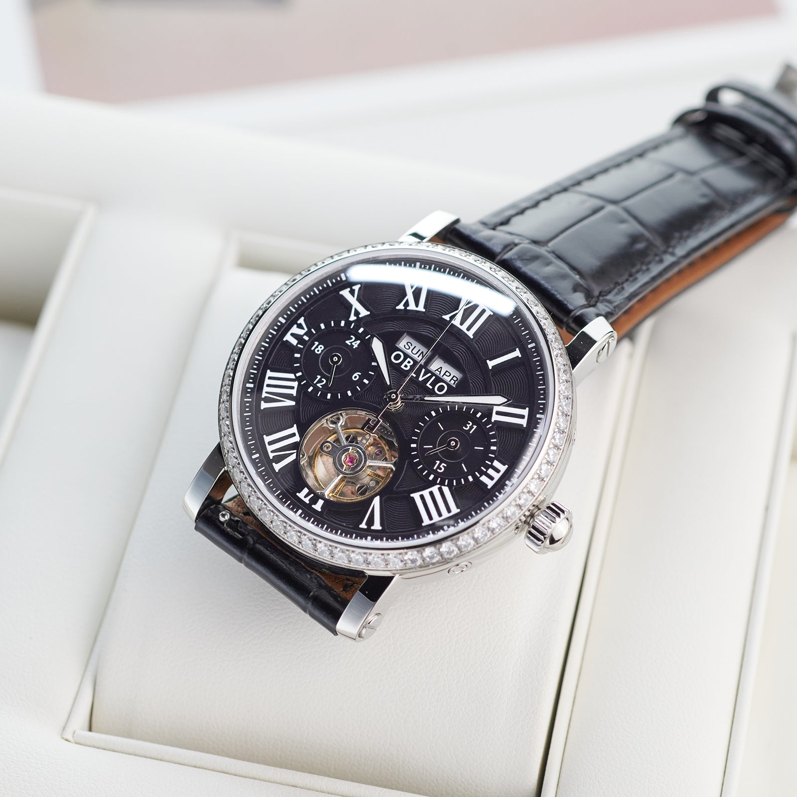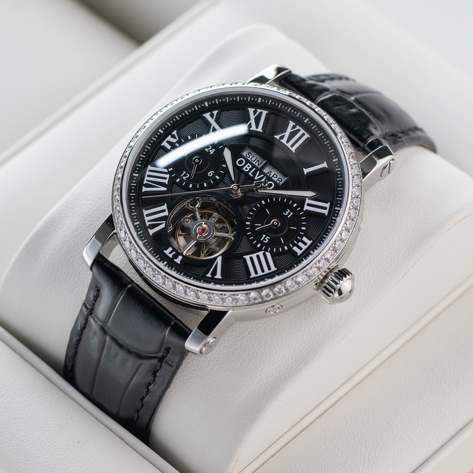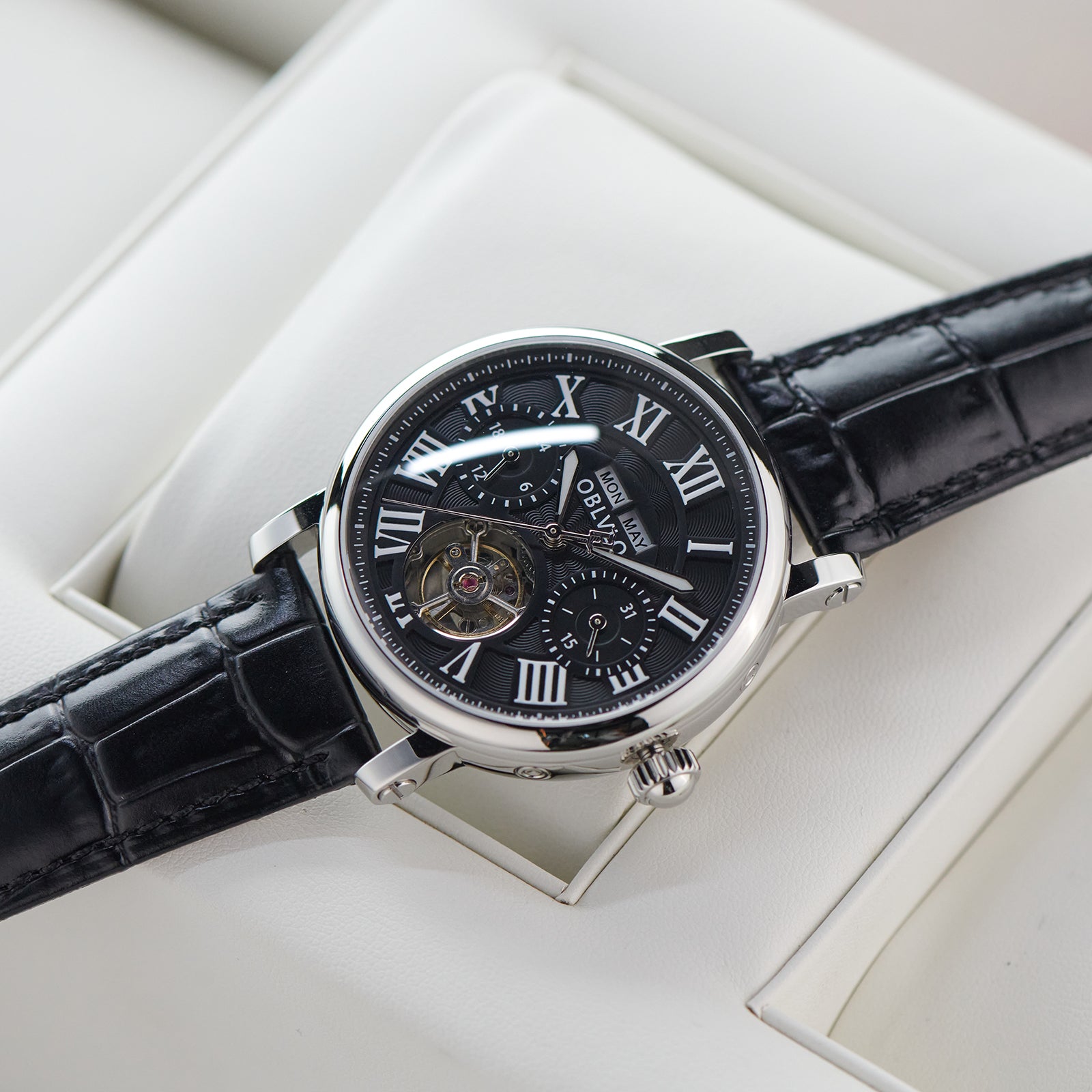 Dial Design: Black Dial, Tourbillon style & Multi-Function designed functions of year/month/week/day to meet all customer needs, Adding texture to the multi-layered dial with roman markings Zirconia Bezel, designed to enhance style, Show off tast!