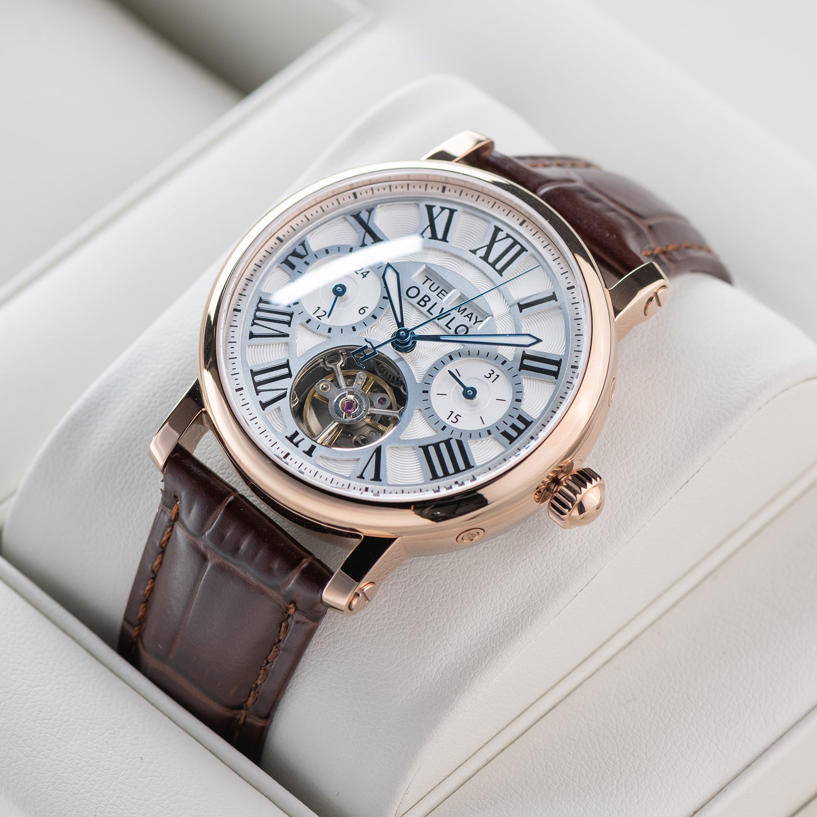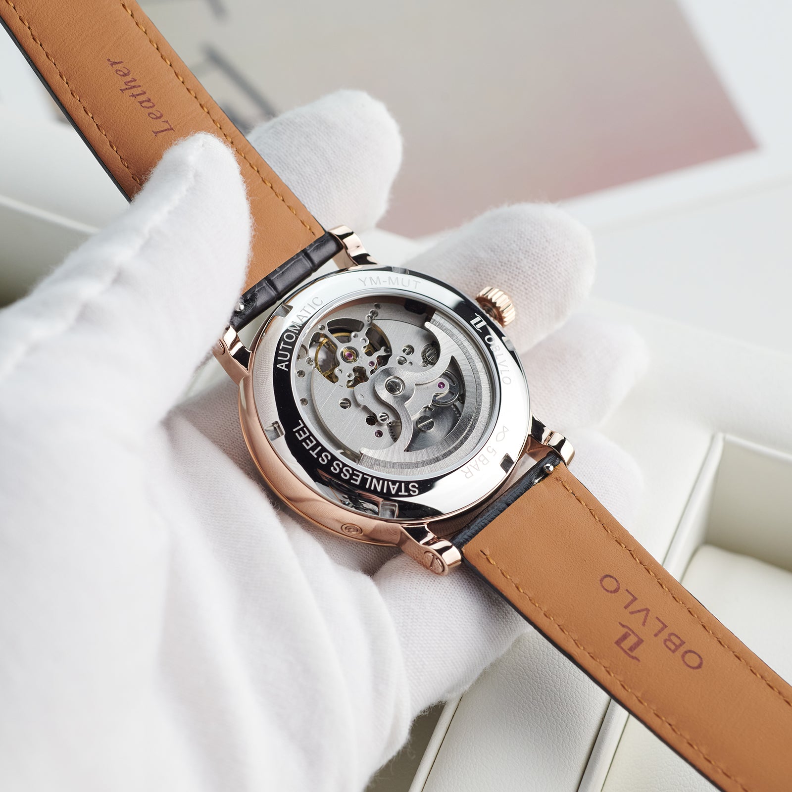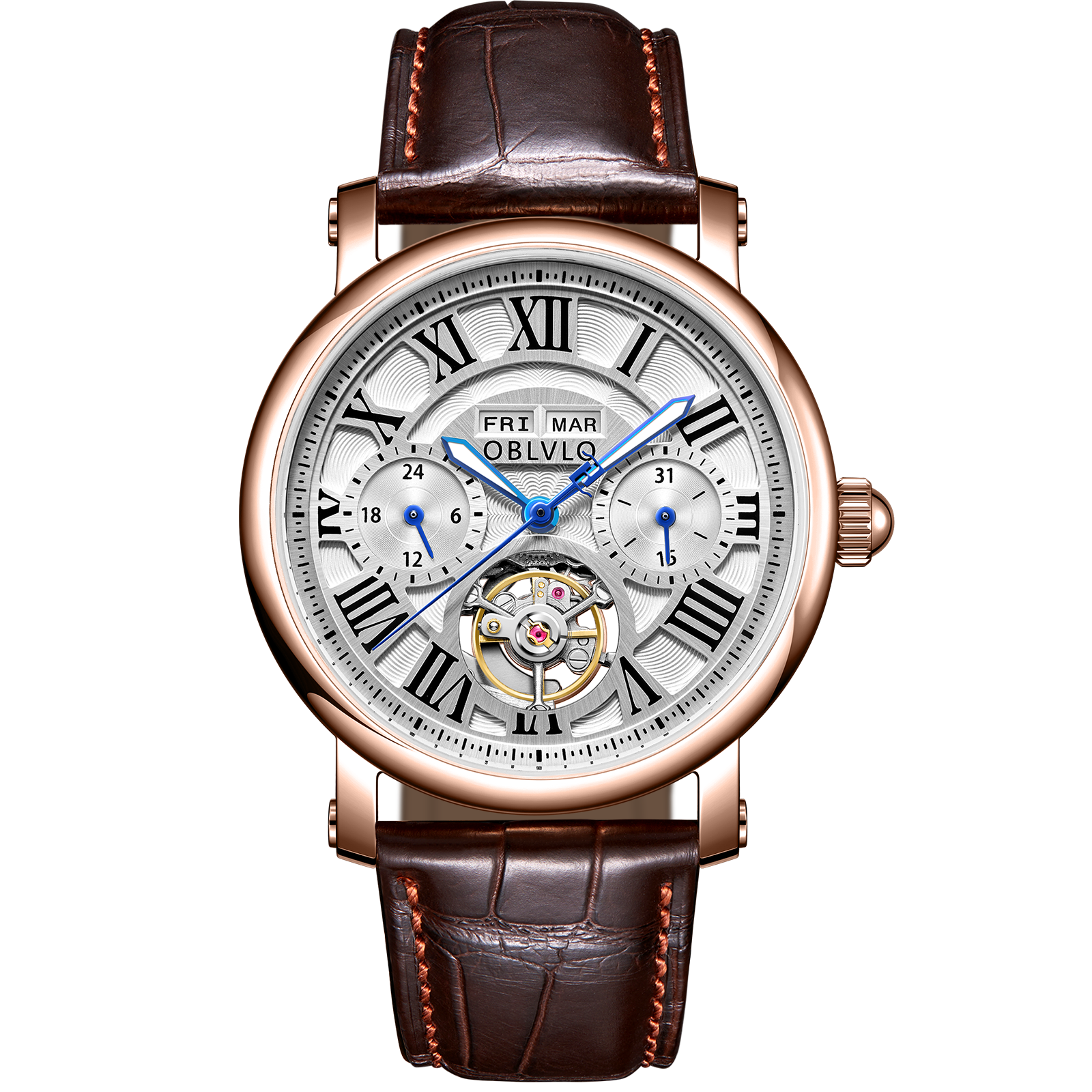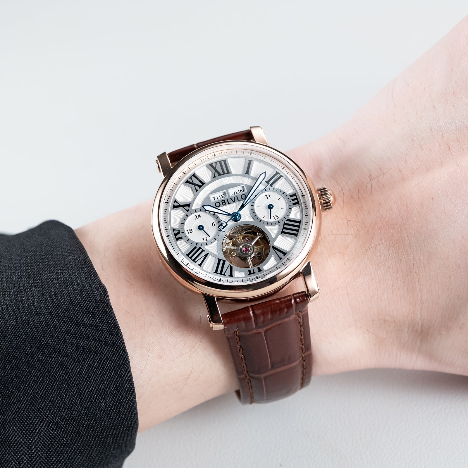 OBLVLO YM Rose Gold Tourbillon style Automatic Mechanical Diamond Dress Watches - Multi-Function year/month/week/day