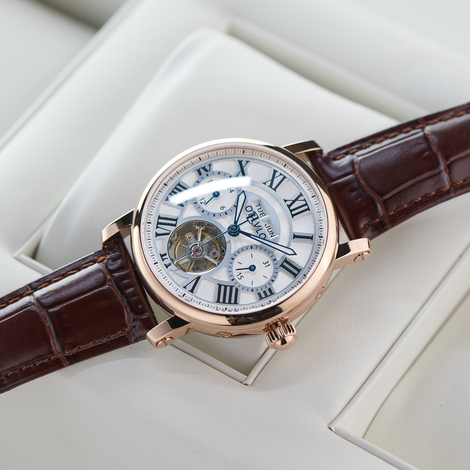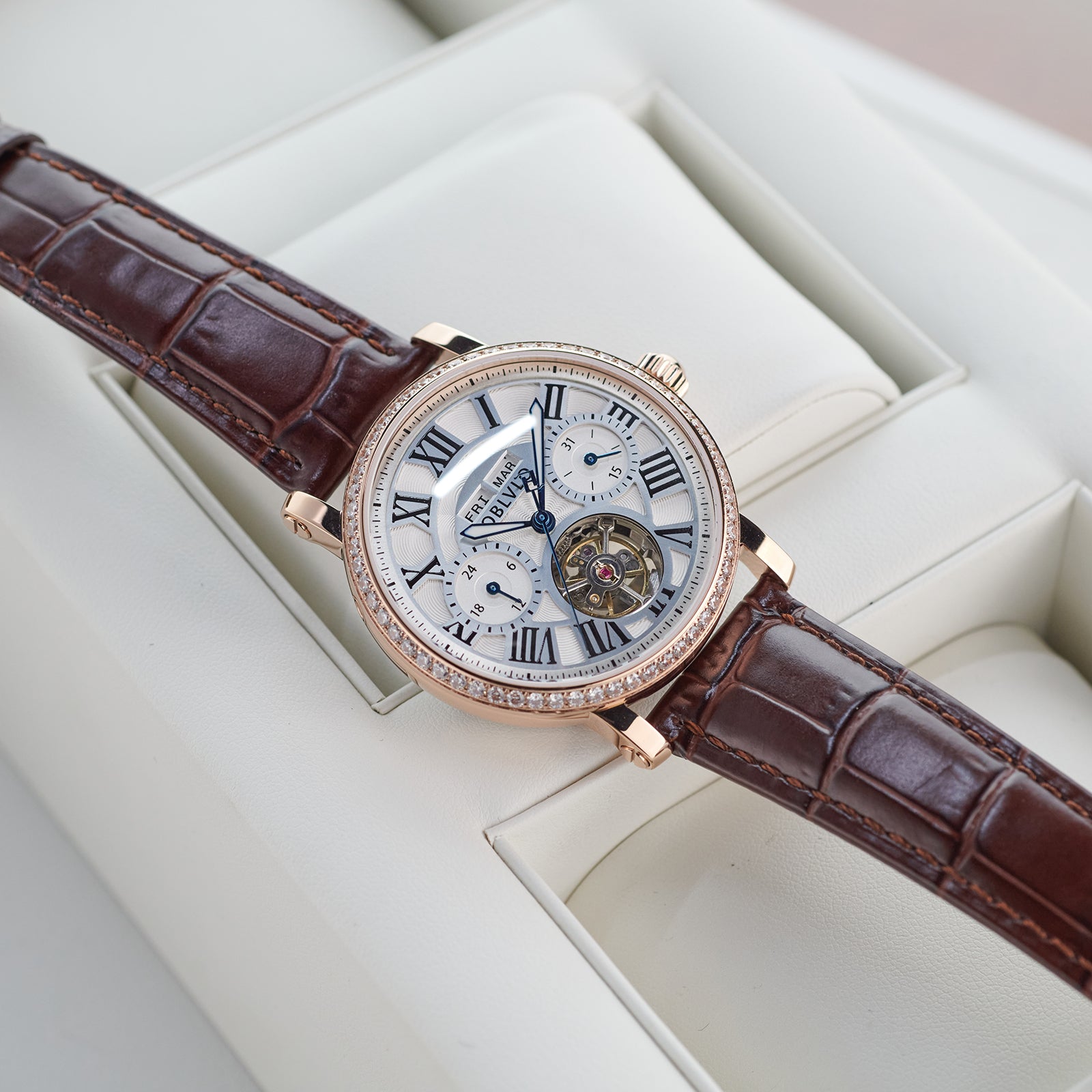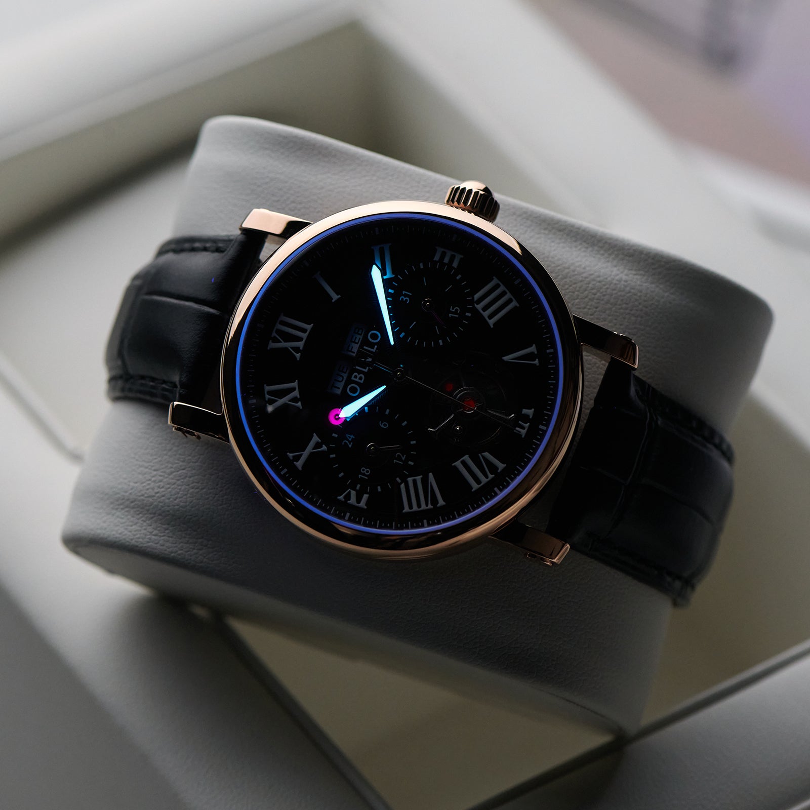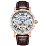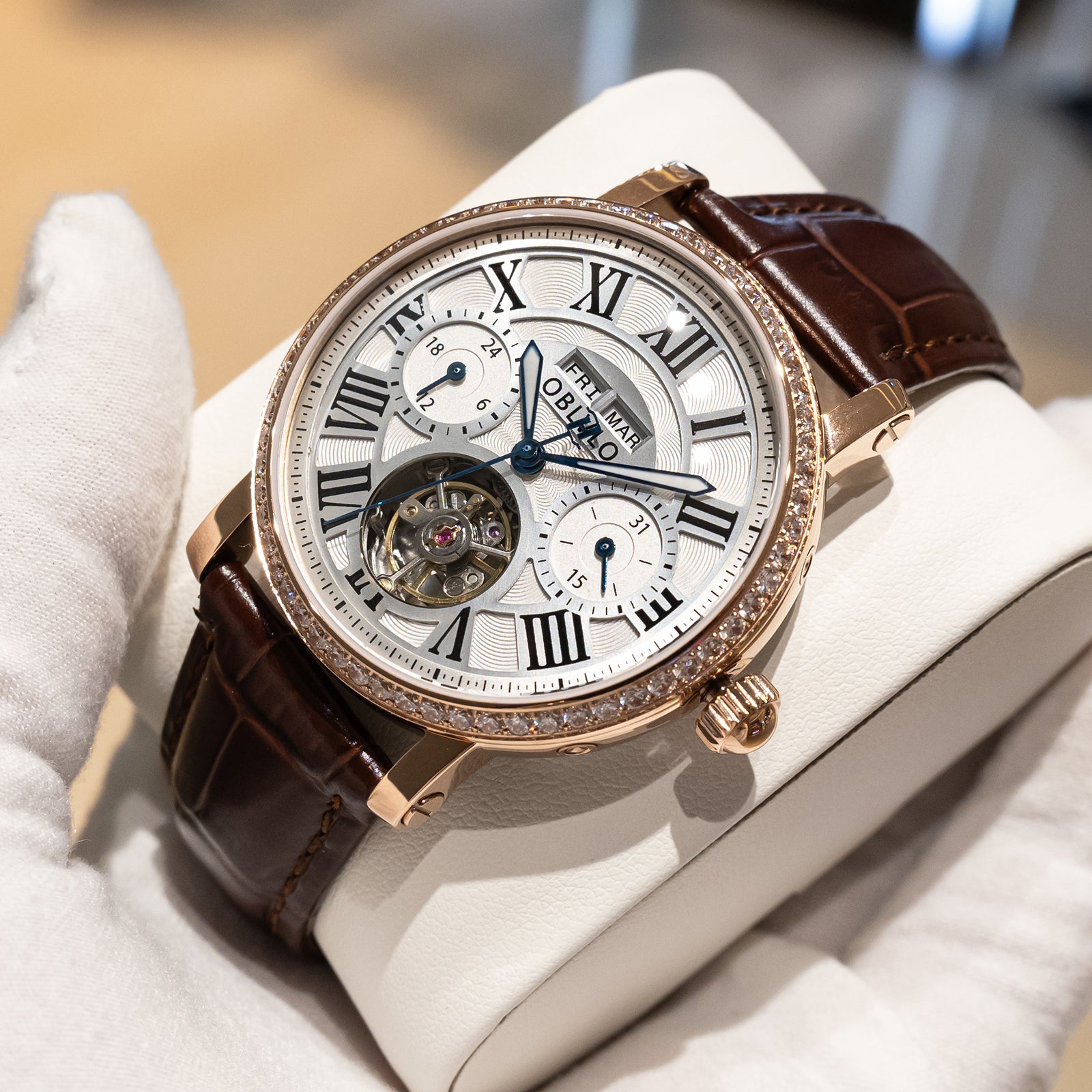OBLVLO YM Rose Gold Tourbillon style Automatic Mechanical Diamond Dress Watches - Multi-Function year/month/week/day