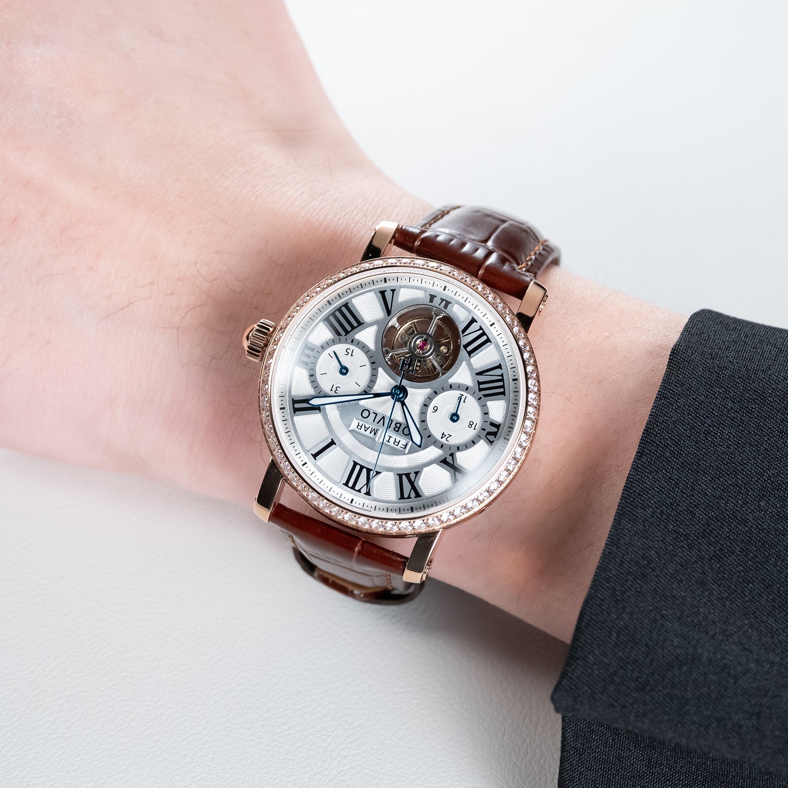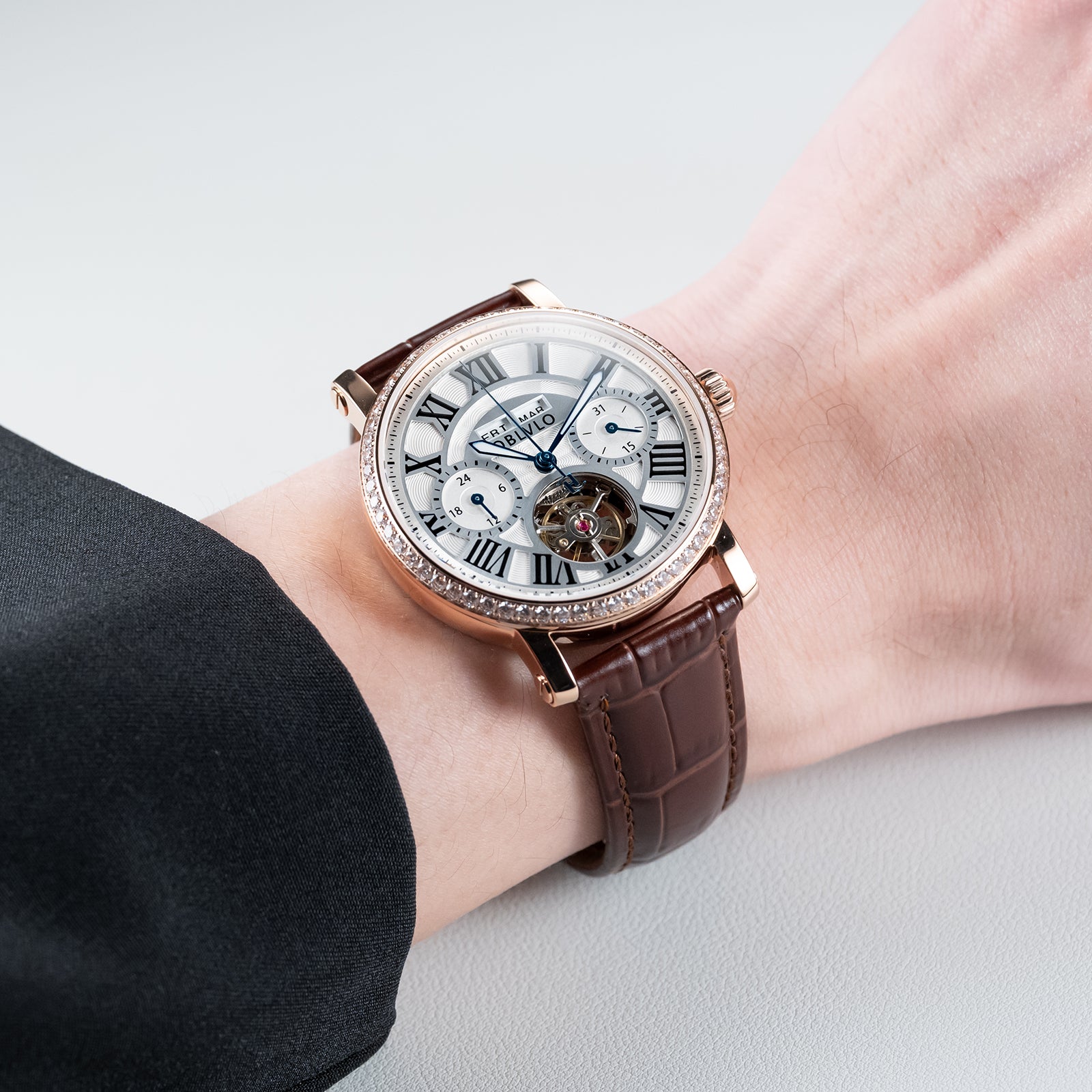 Dial Design: White Dial, Tourbillon style & Multi-Function designed functions of year/month/week/day to meet all customer needs, Adding texture to the multi-layered dial with roman markings Zirconia Bezel, designed to enhance style, Show off tast!