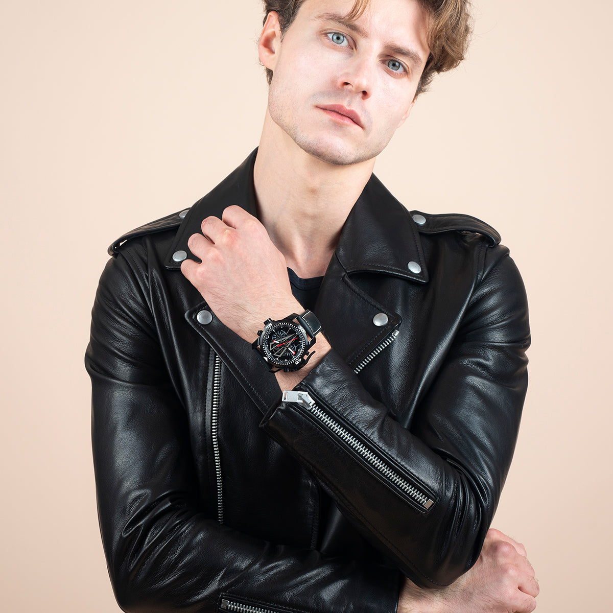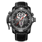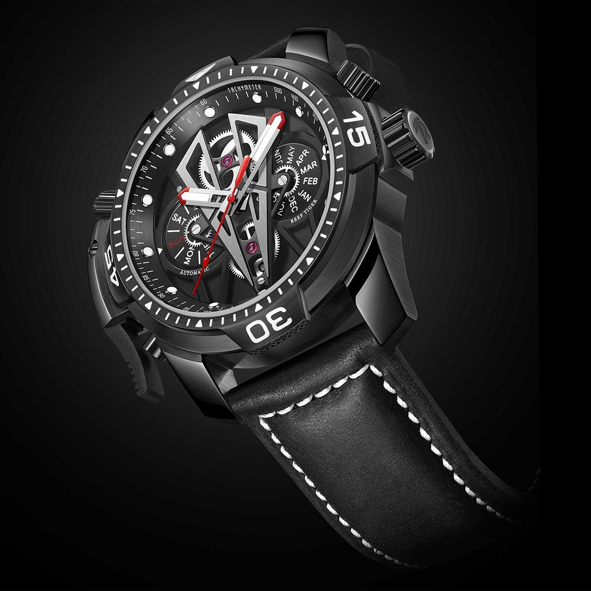 The case of the Reef Tiger Aurora Concept 2 is expertly fashioned from 316 stainless steel, plated with black PVD for enhanced durability and a sleek, stealthy aesthetic. The round case shape is both classic and versatile, measuring 46mm in diameter and 16mm in thickness, making a bold statement on the wrist. The black skeleton dial offers a glimpse into the intricate inner workings of the watch, showcasing the ST2503 mechanical movement with precision and style. Protected by scratch-resistant sapphire crystal, the dial is both striking and resilient, ensuring optimal legibility and durability in any situation.