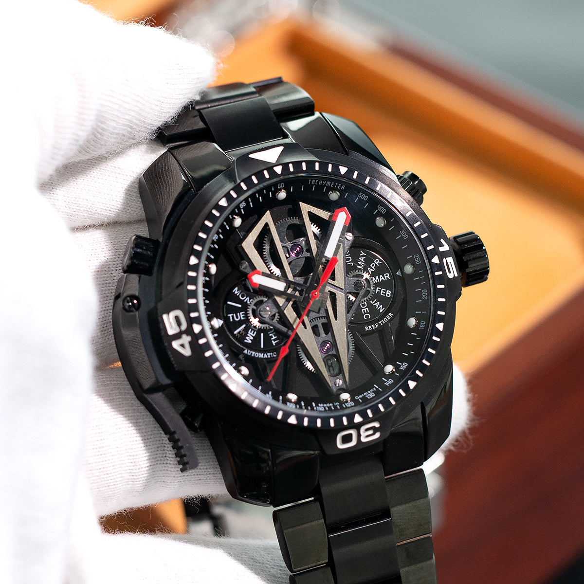 The luxury timepieces command attention and admiration like the Reef Tiger Aurora Concept 2 Black PVD Automatic Military Sport Watch for Men, model number RGA3591-02. Crafted with meticulous attention to detail and uncompromising quality, this exquisite timepiece seamlessly blends rugged military aesthetics with cutting-edge automatic movement technology. Let's delve into the key features that make this watch a standout choice for watch enthusiasts and connoisseurs alike.