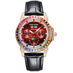 Dial Design: Burgundy Red Dial & Watch face is designed with year, month, date, day, 6 hours day/night/24 hours instruction & moonphase style, luminous hands display. Rainbow Color Zirconia and Diamond inlay collocation multifunctional dial, highlight charm, shine extraordinary brilliance.