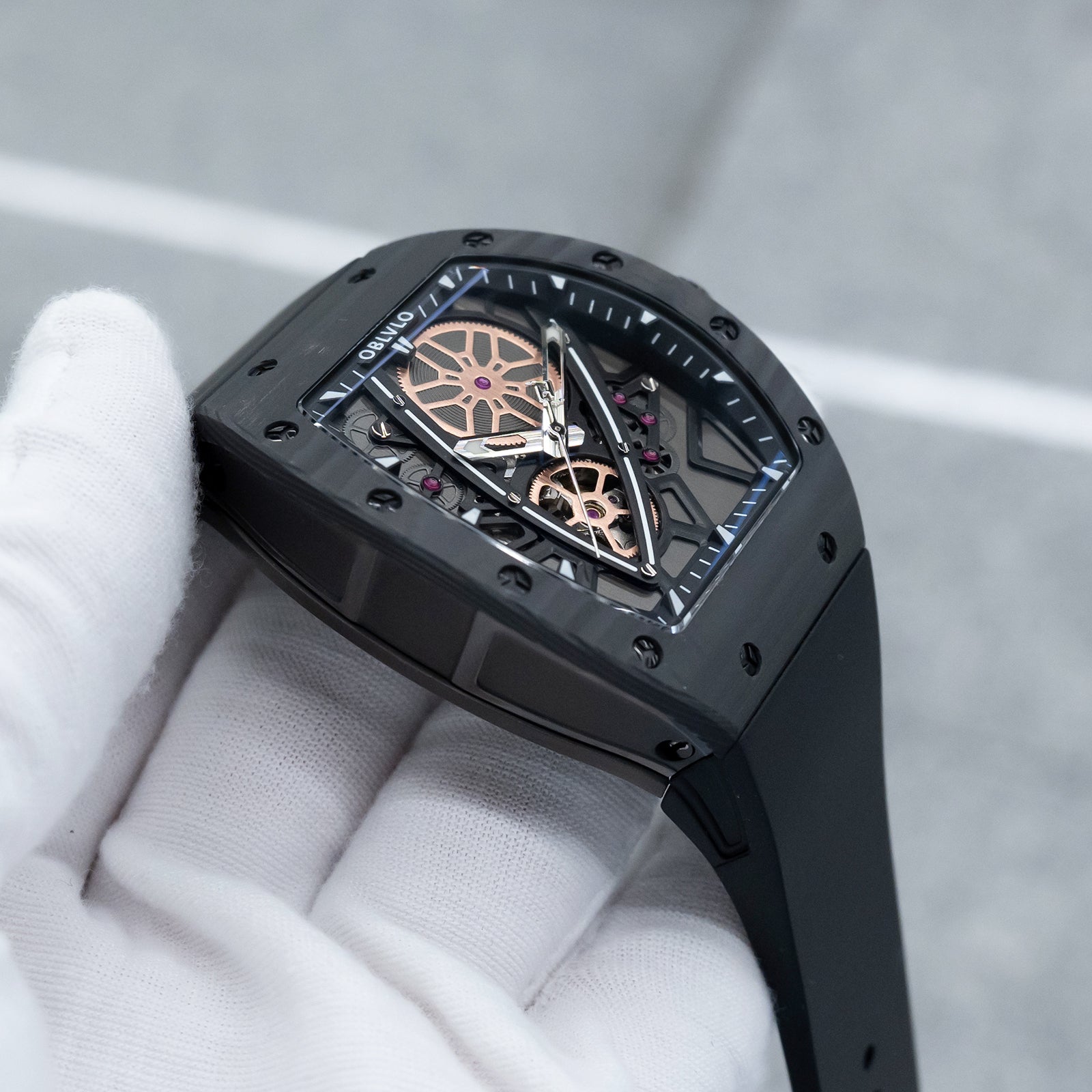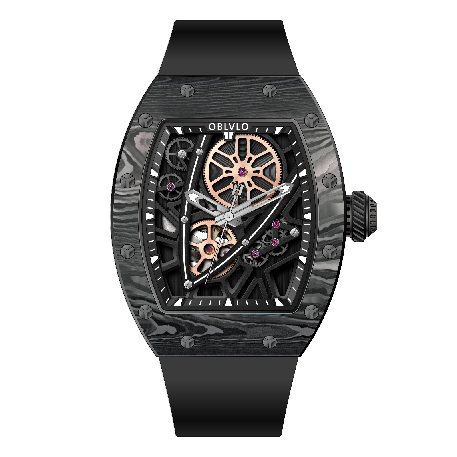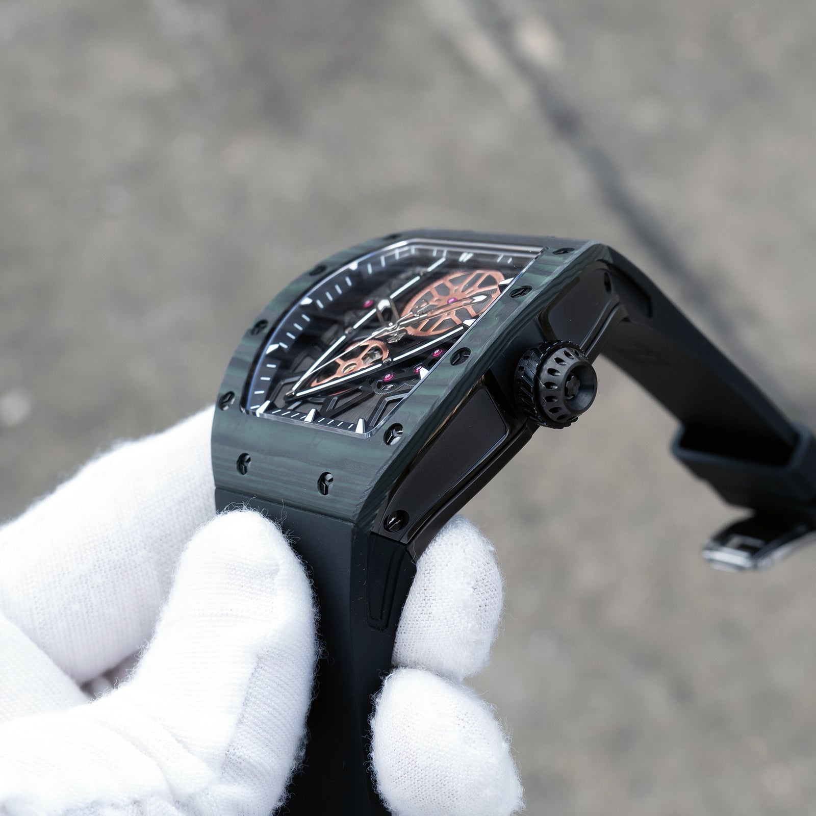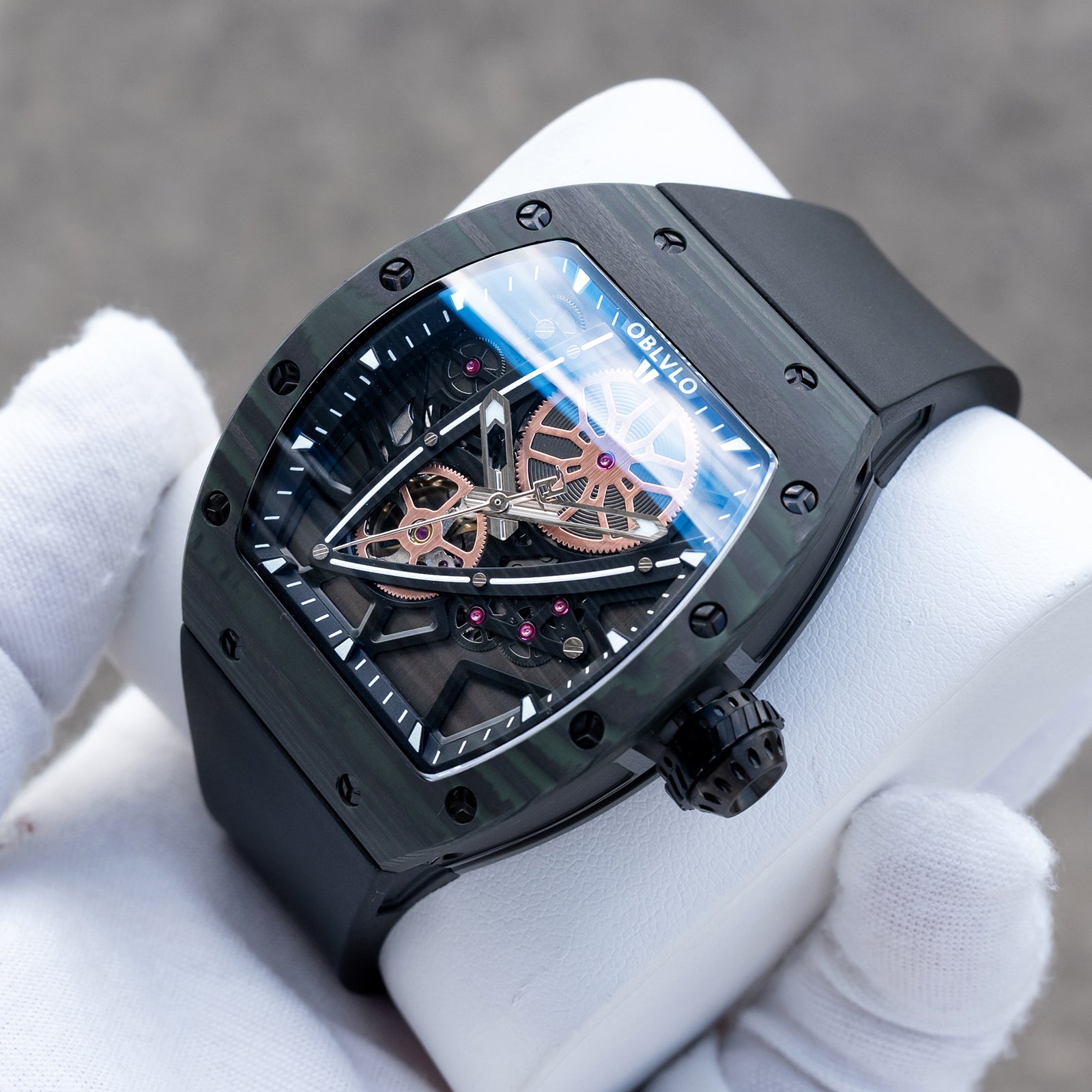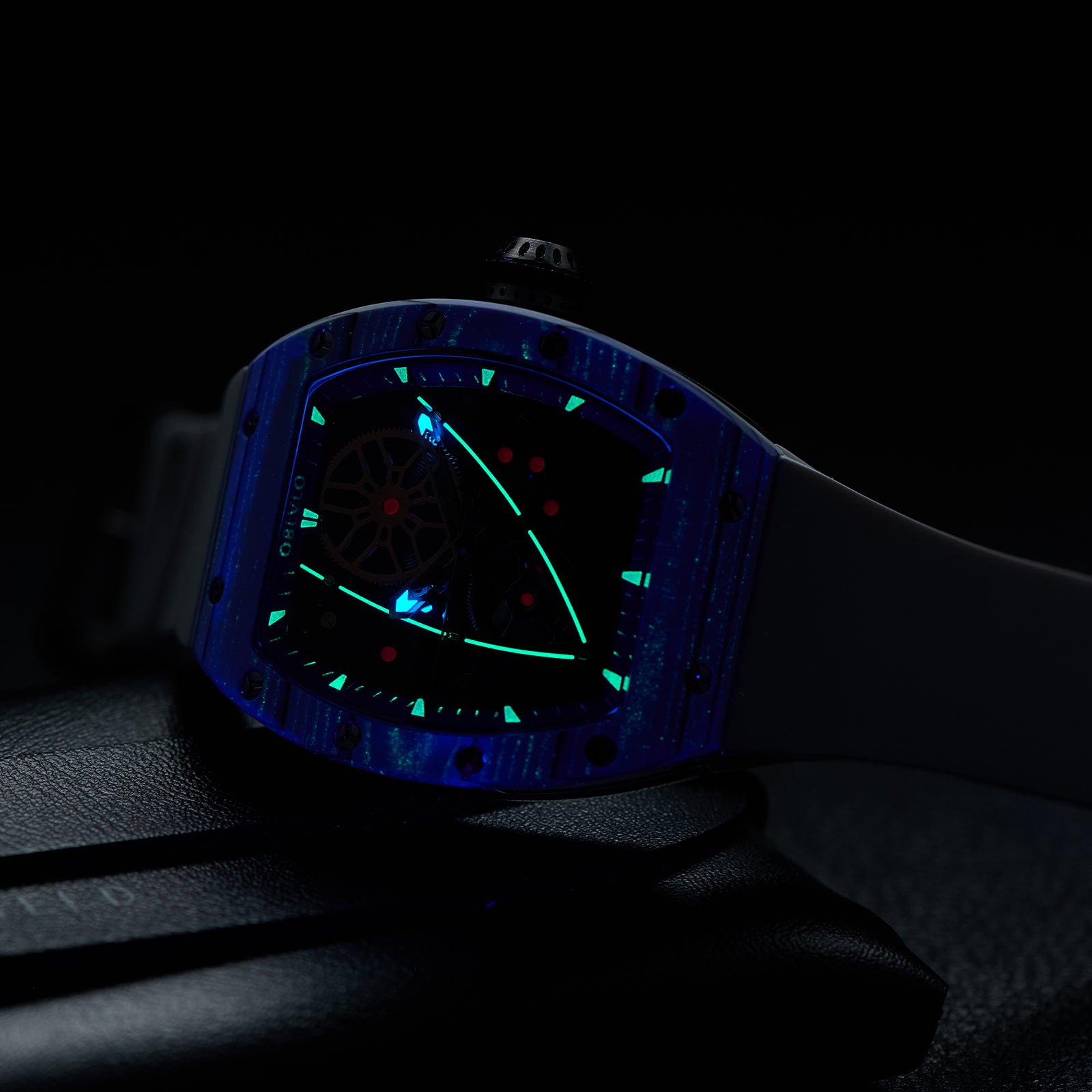Dial Design: Sophisticated skeleton dial design and super luminous, With its tonneau case echoing the curves of modern supercars and a skeleton dial revealing the heart of its engine, this timepiece is made for those who lead rather than follow.