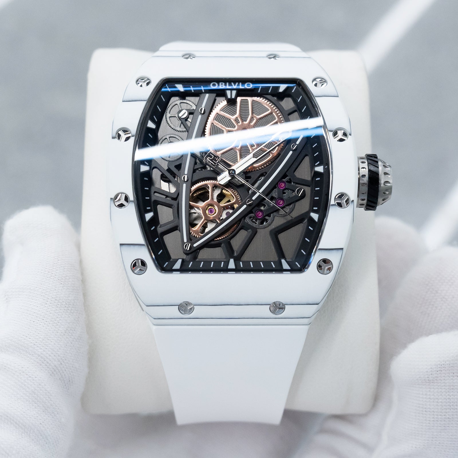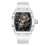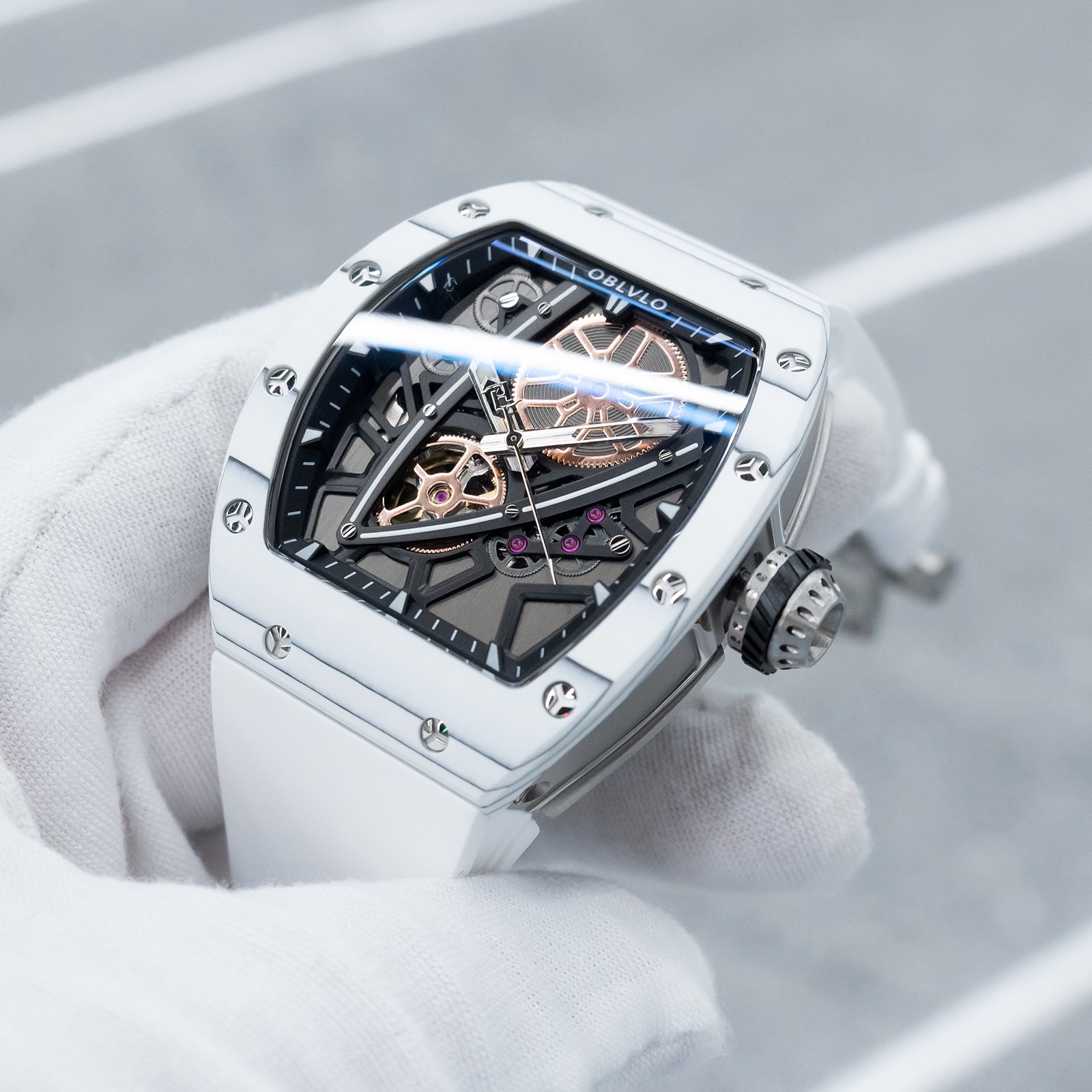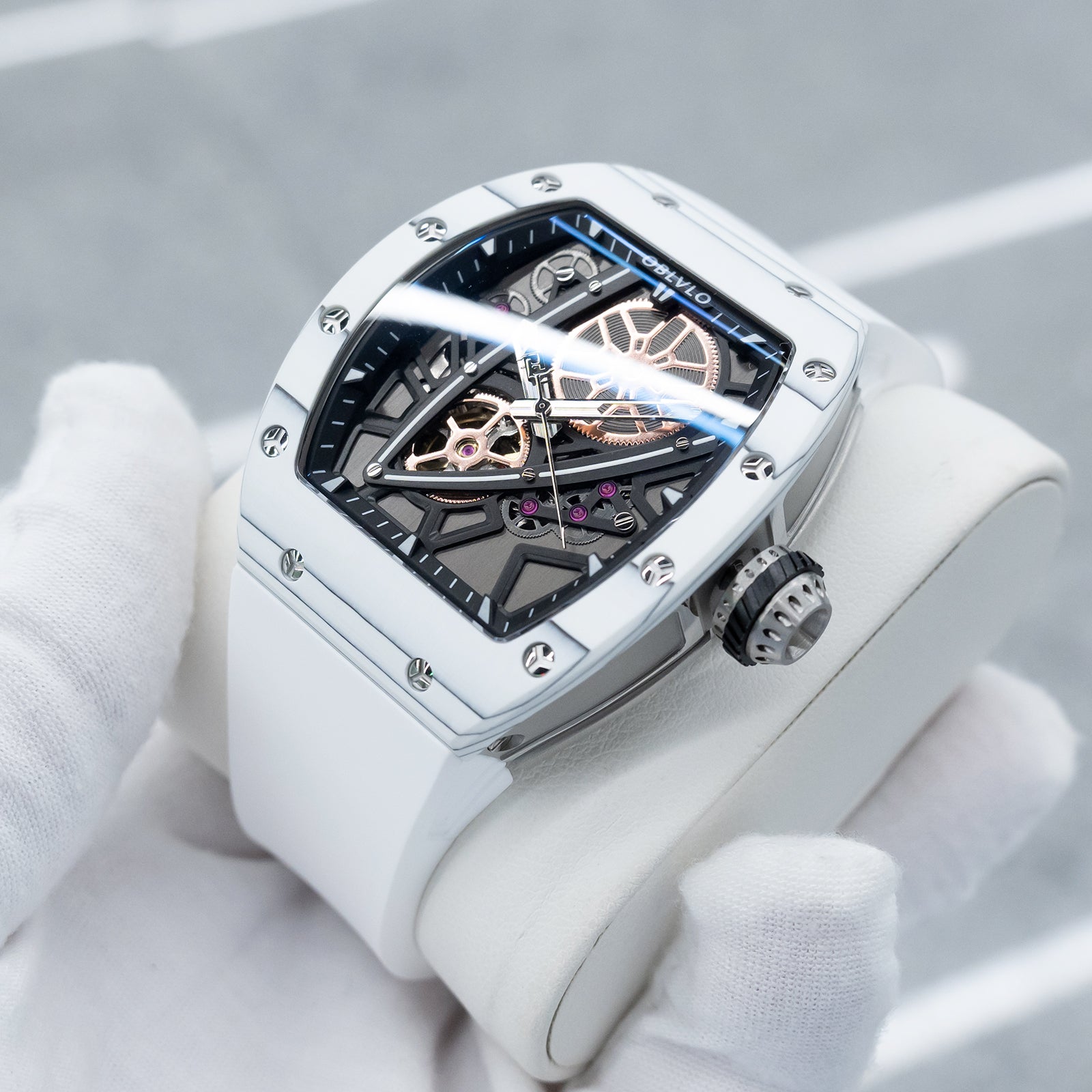 Dial Design: Sophisticated skeleton dial design and super luminous, With its tonneau case echoing the curves of modern supercars and a skeleton dial revealing the heart of its engine, this timepiece is made for those who lead rather than follow.