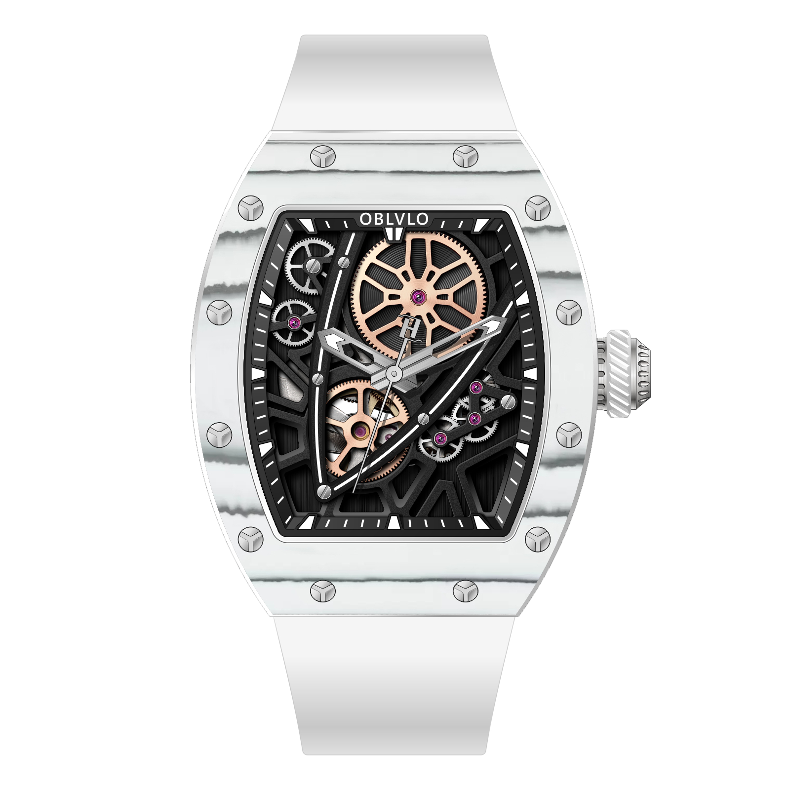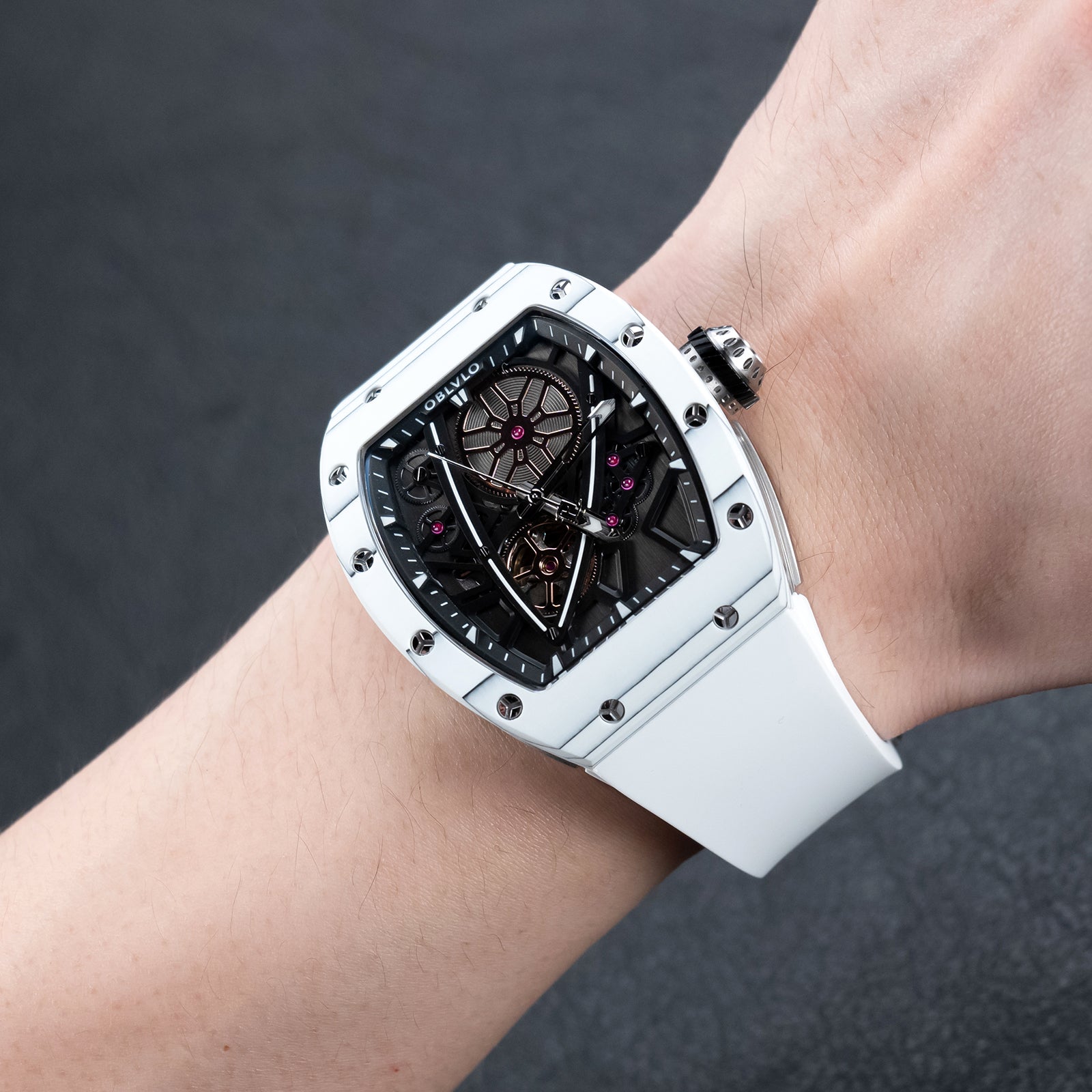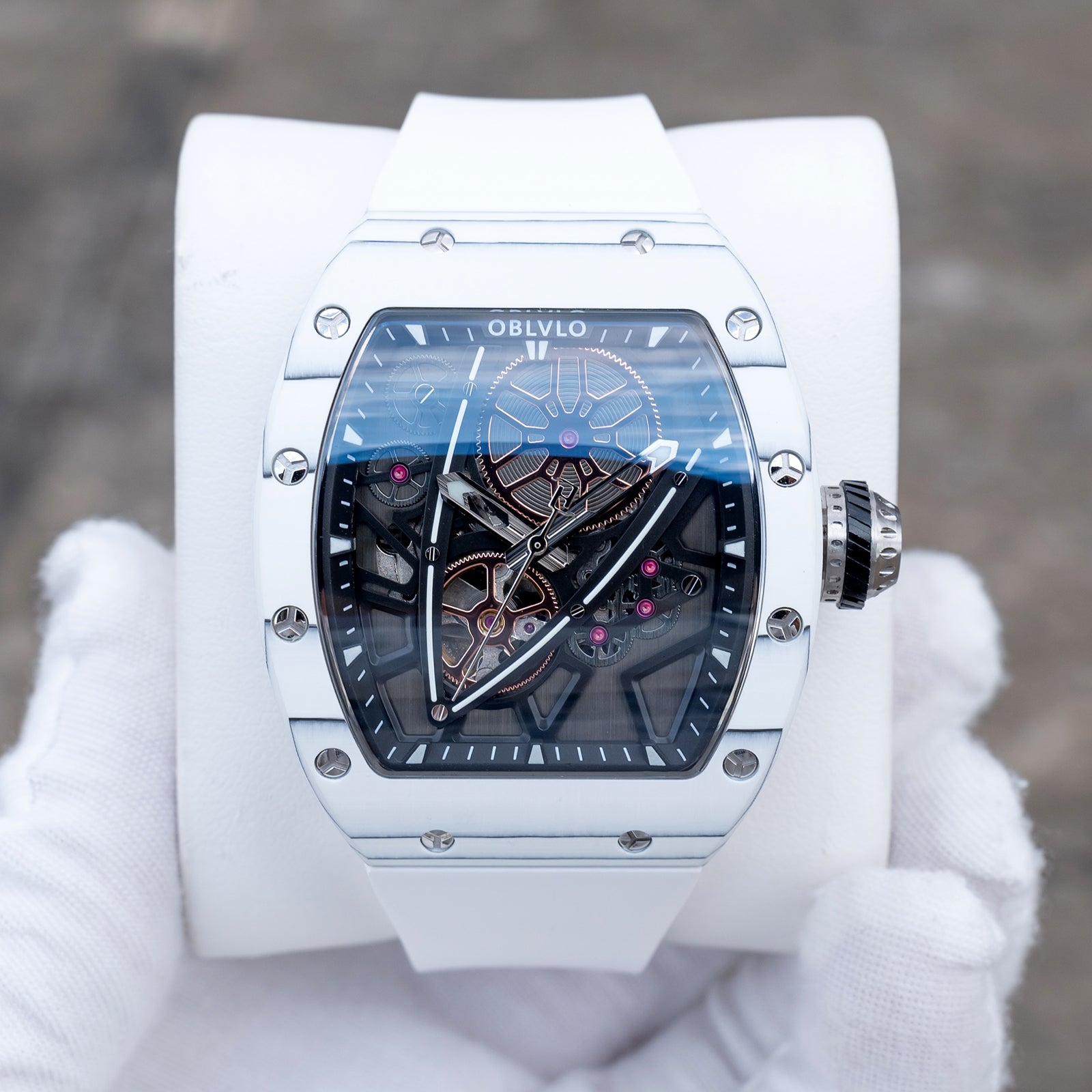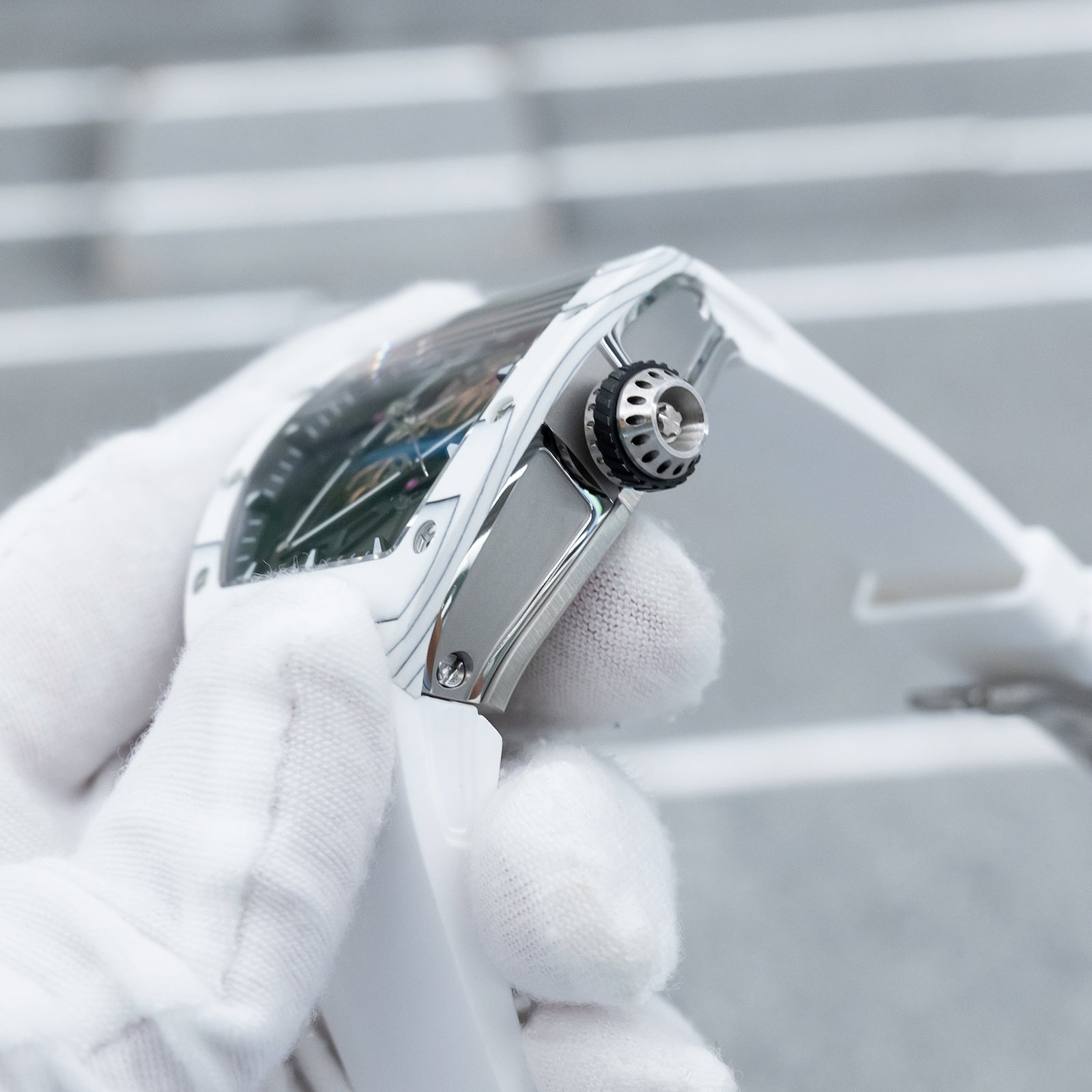 Dial Design: Sophisticated skeleton dial design and super luminous, With its tonneau case echoing the curves of modern supercars and a skeleton dial revealing the heart of its engine, this timepiece is made for those who lead rather than follow.