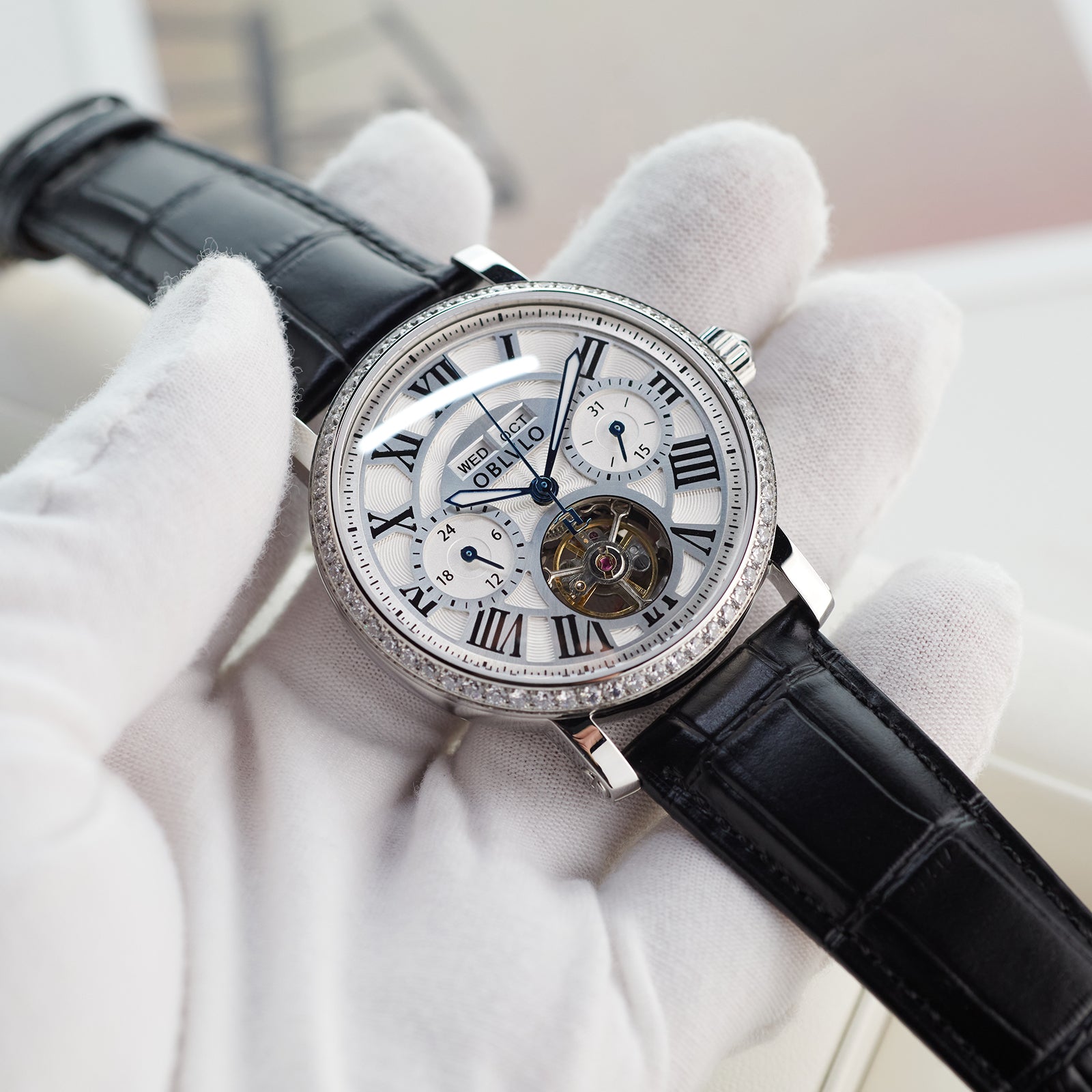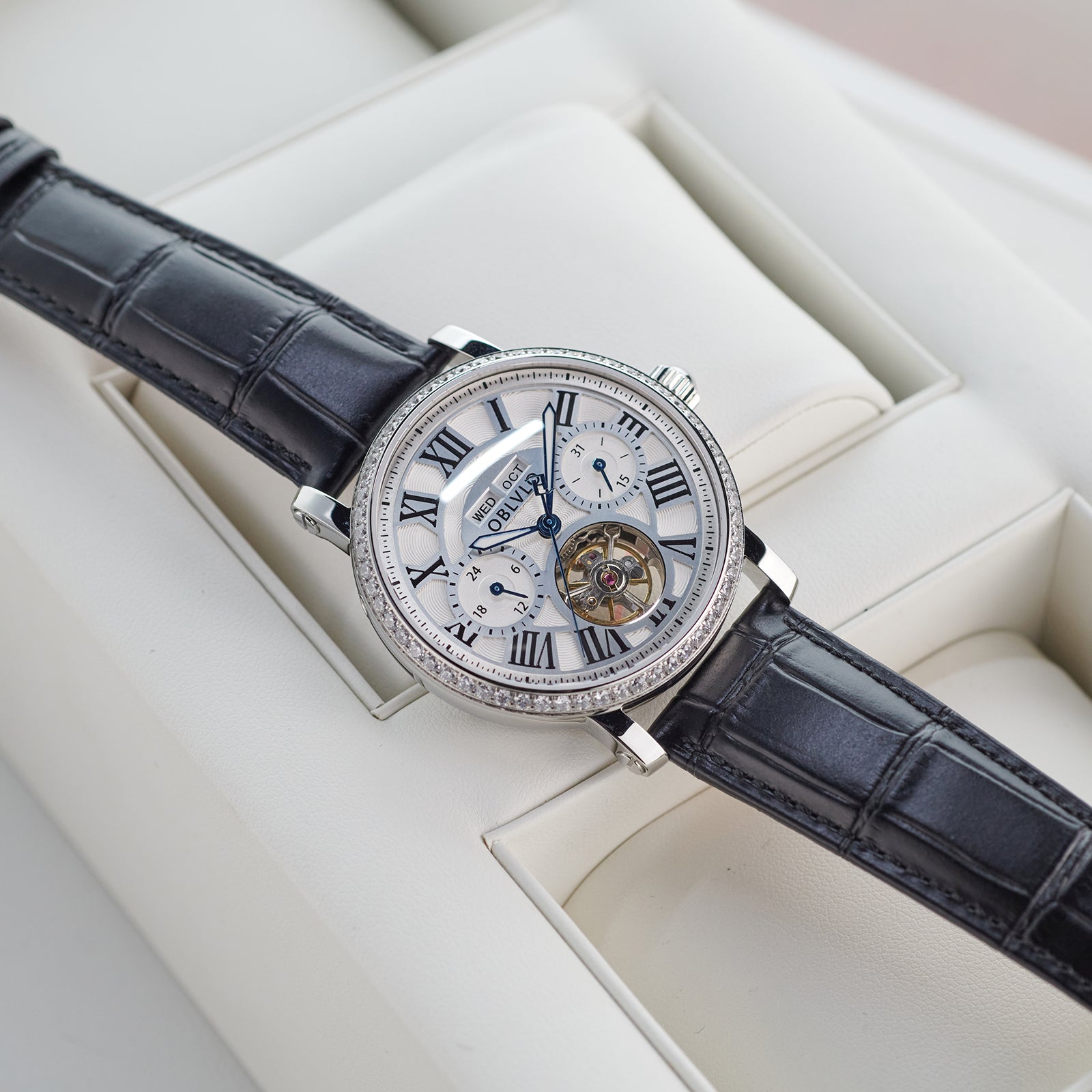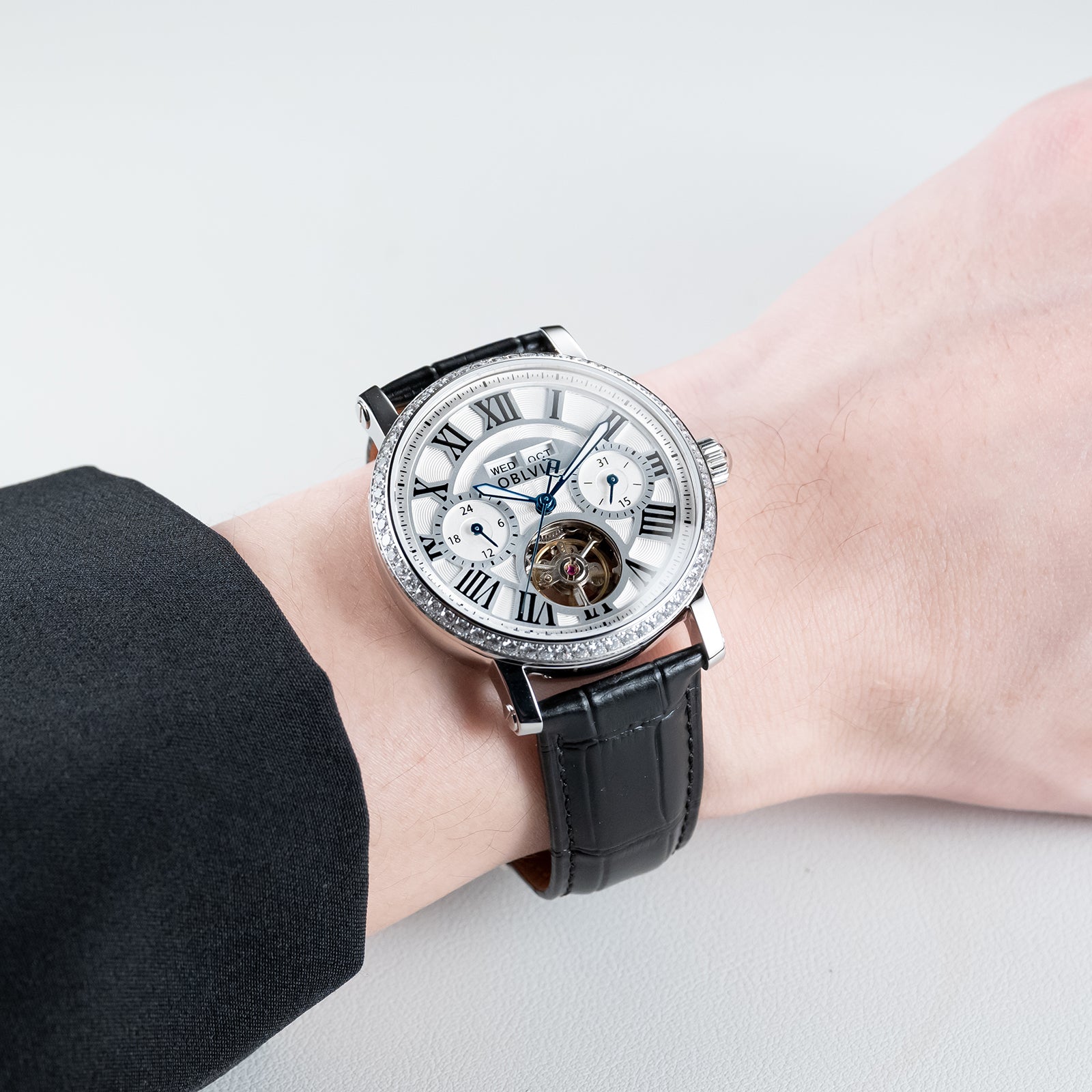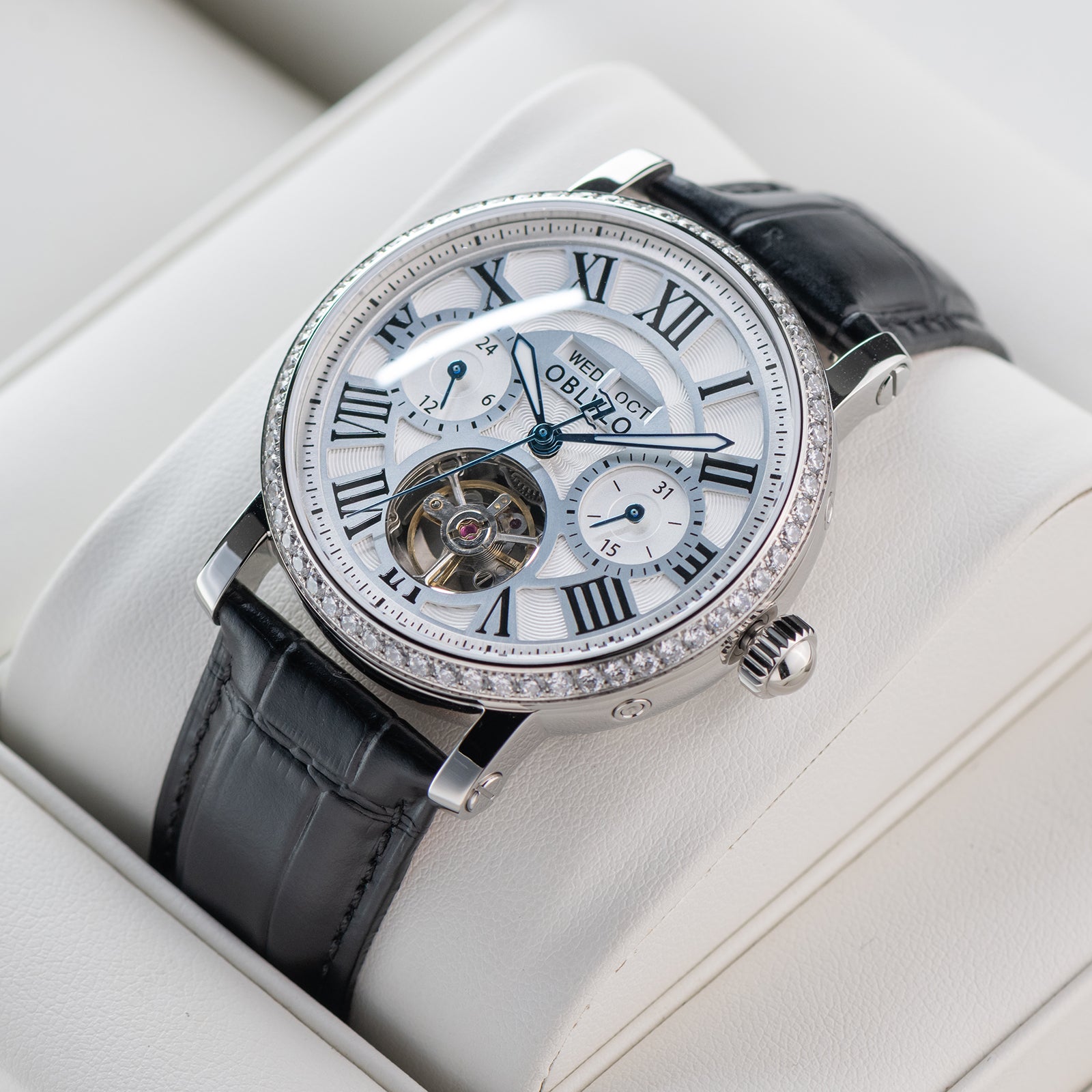 Dial Design: White Dial, Tourbillon style & Multi-Function designed functions of year/month/week/day to meet all customer needs, Adding texture to the multi-layered dial with roman markings Zirconia Bezel, designed to enhance style, Show off tast!