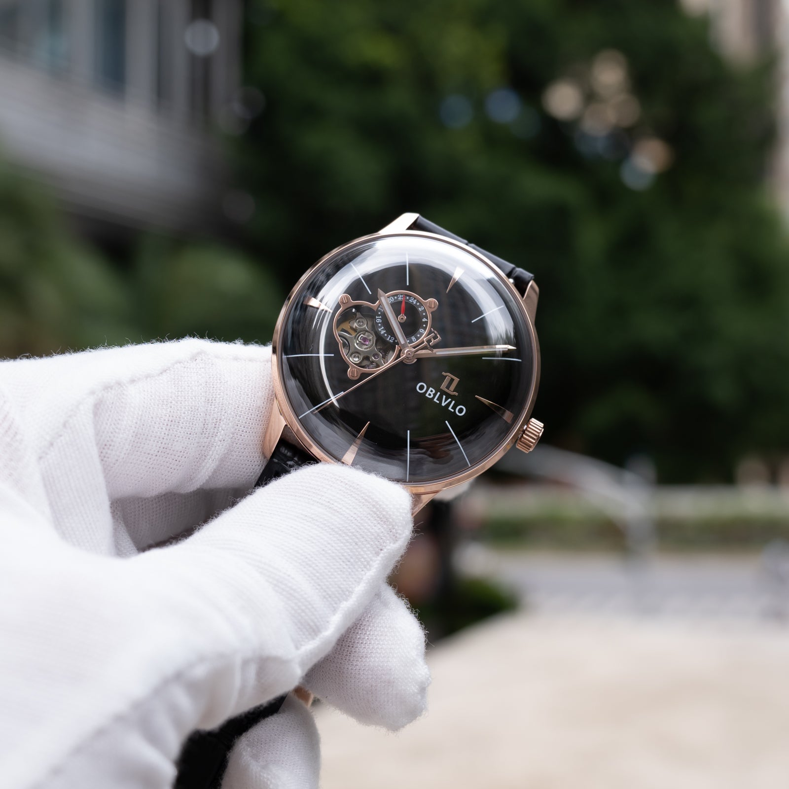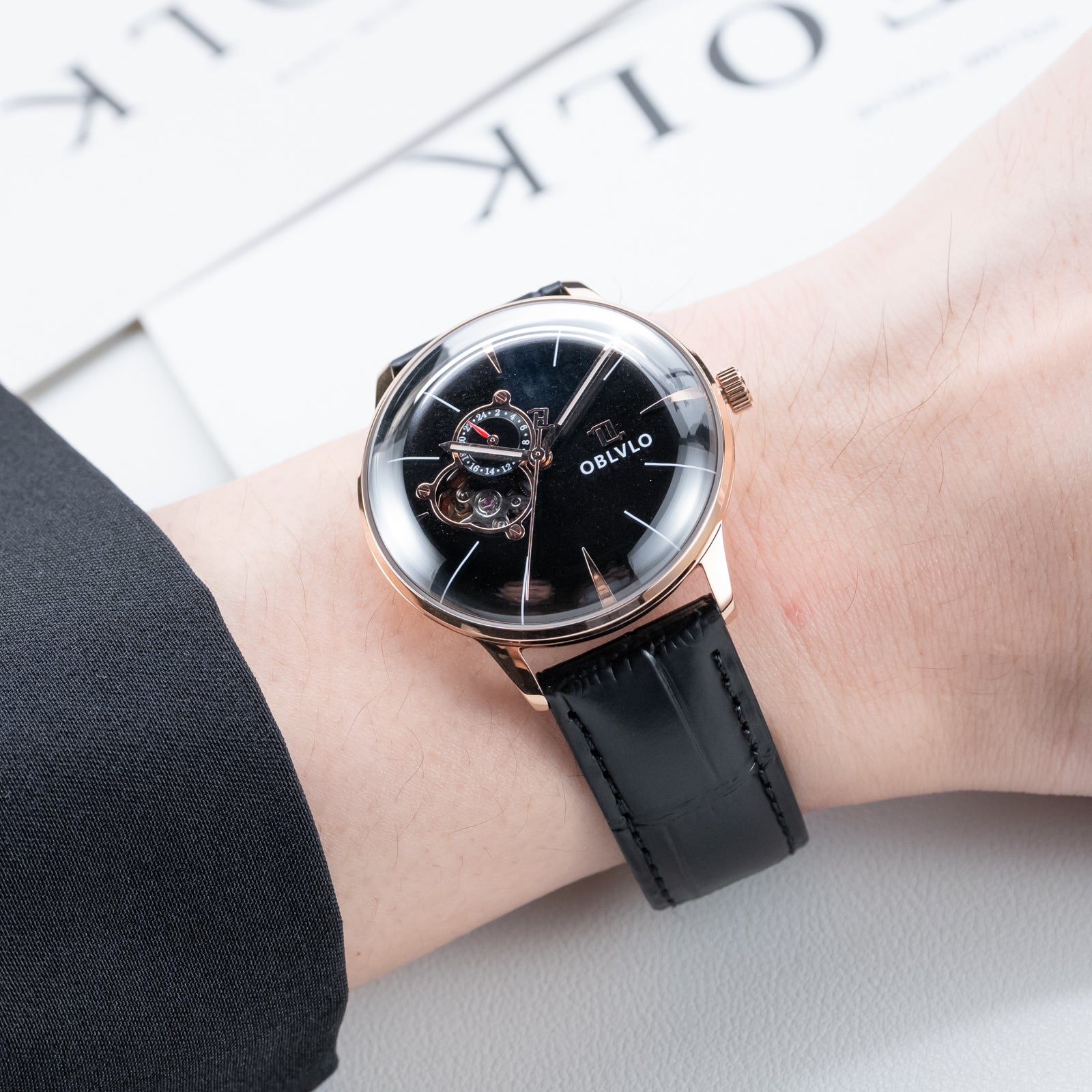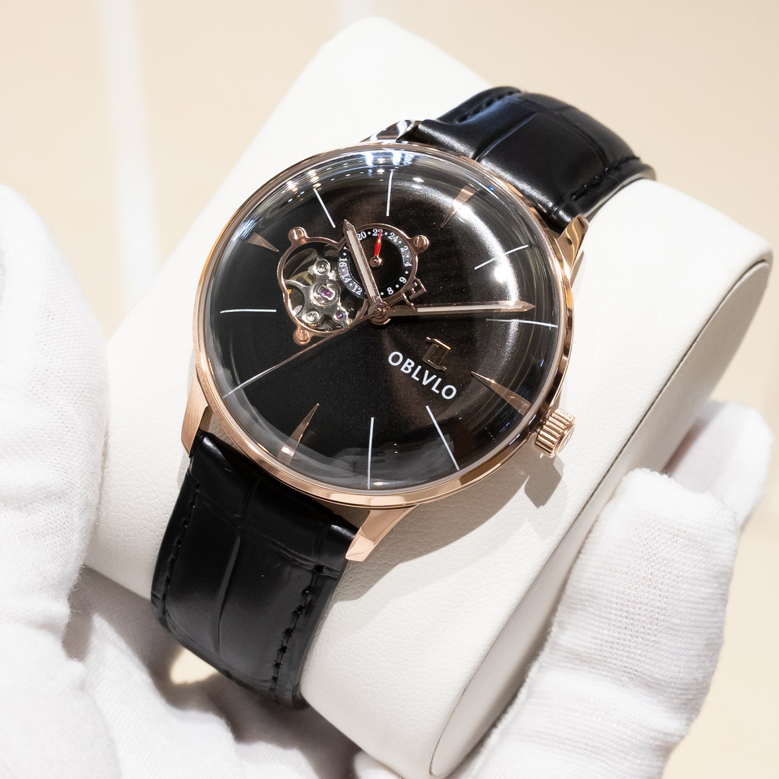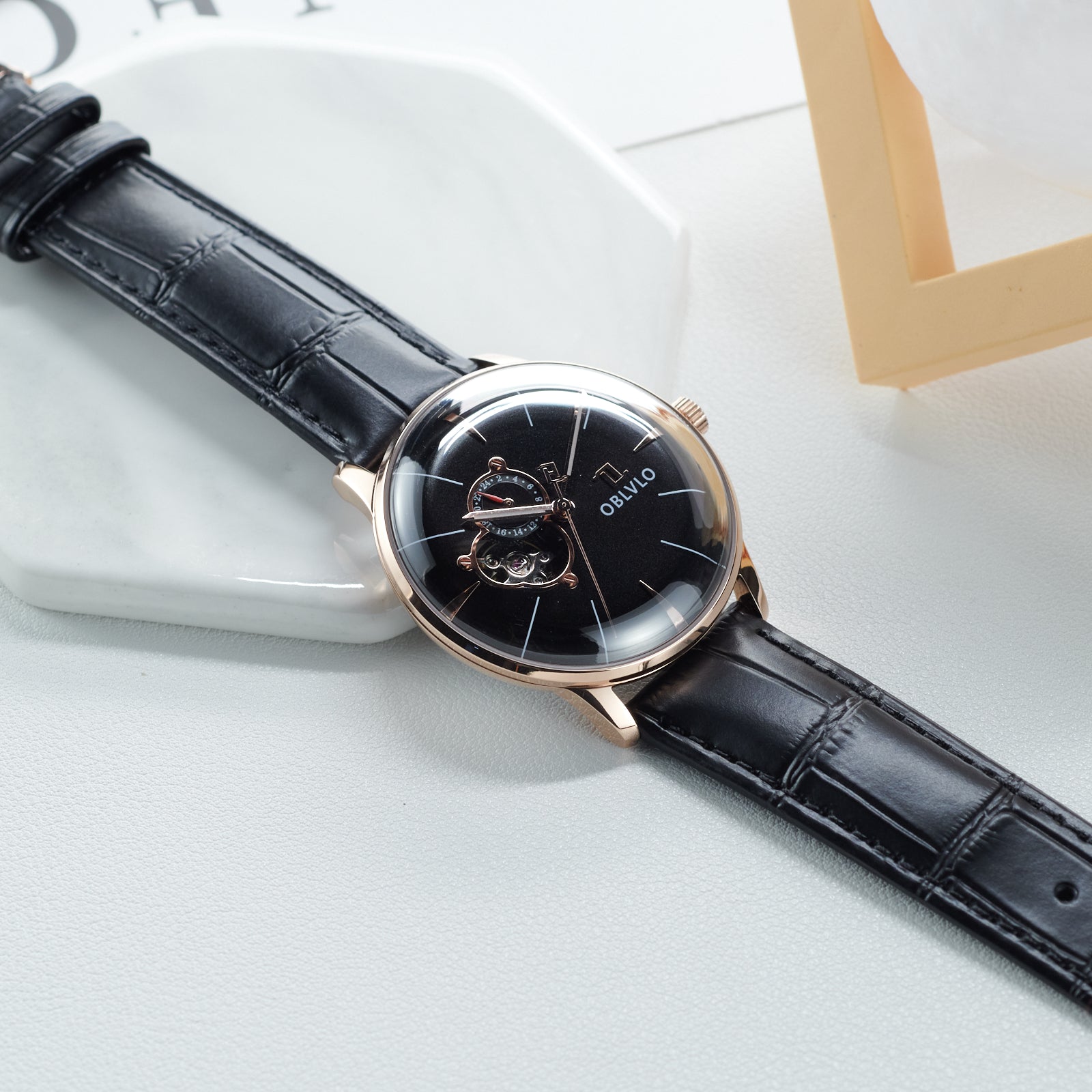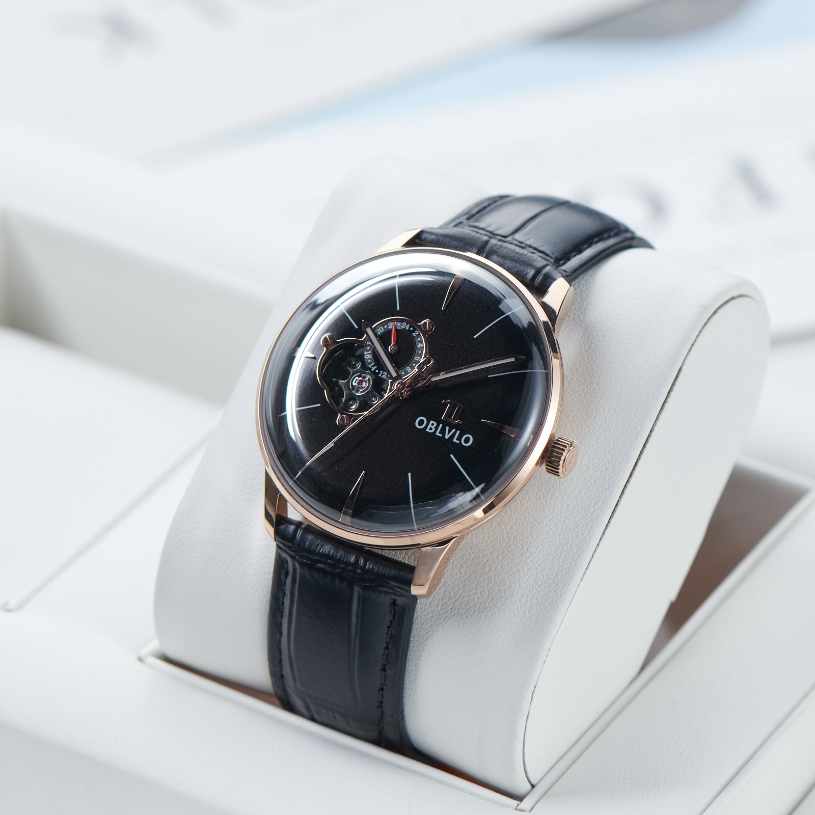Dial Design: Black Dial & Watch subdial is designed 24-hour with luminous rose gold hands display & partial skeleton dial.