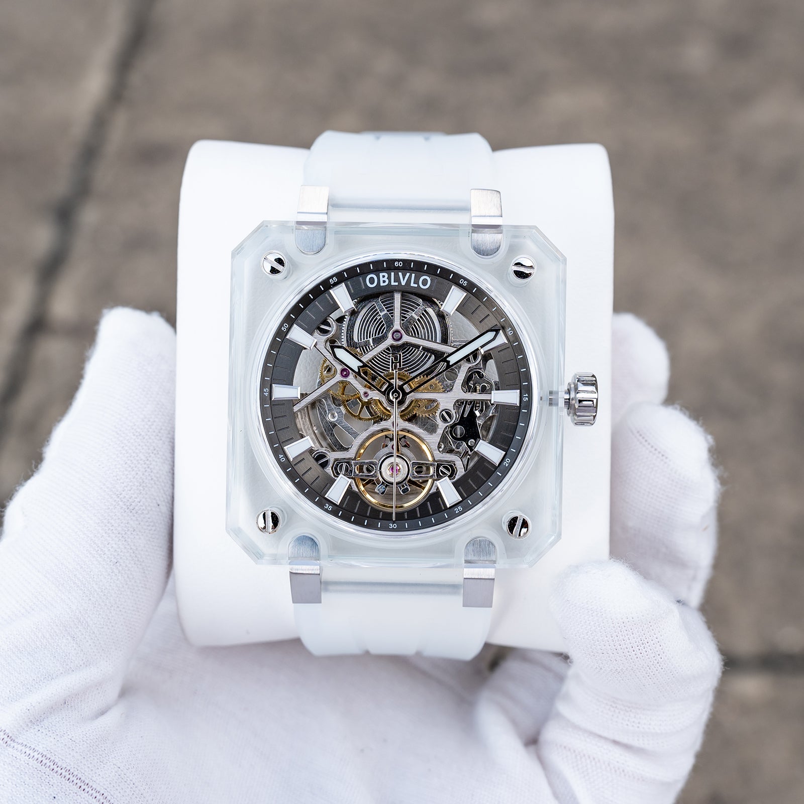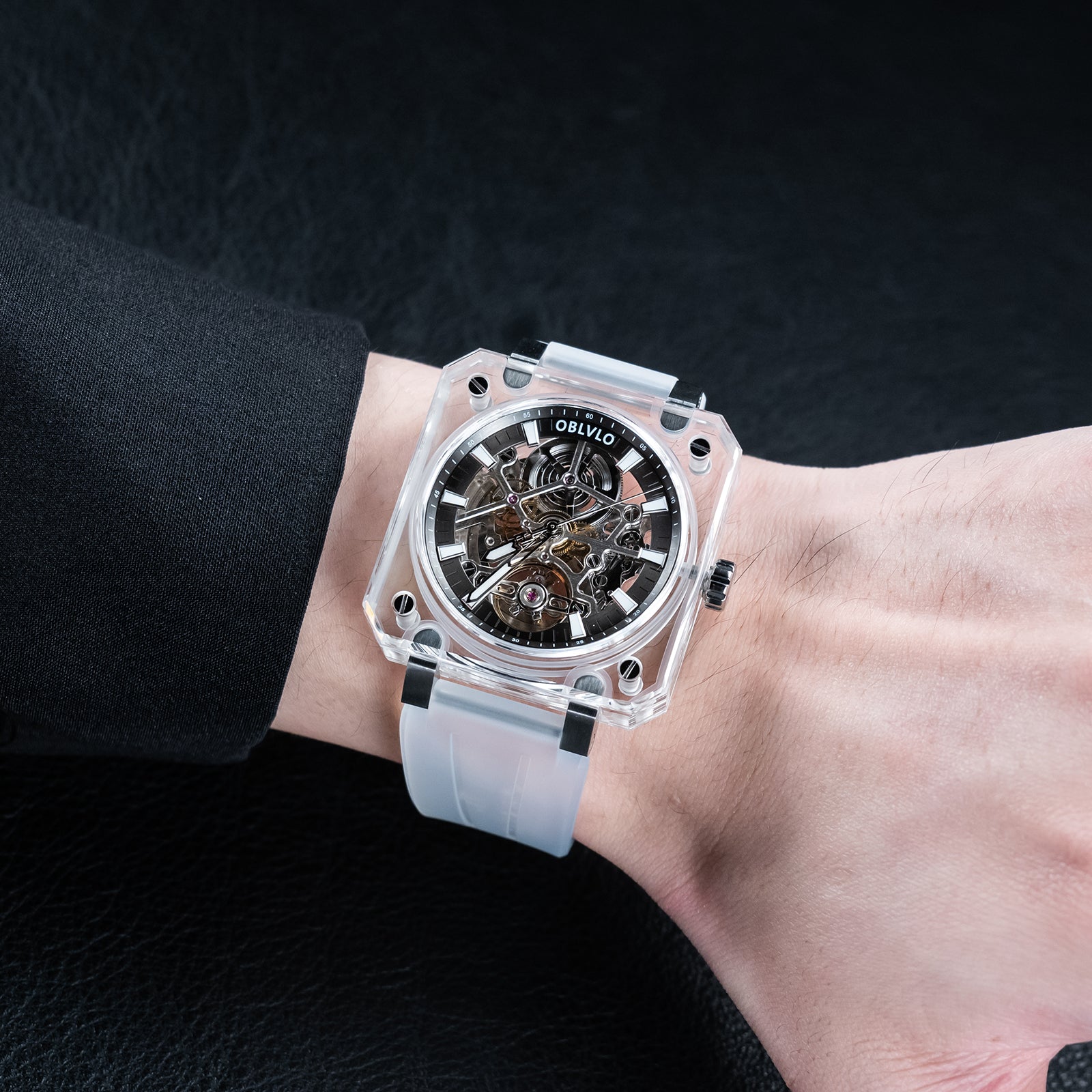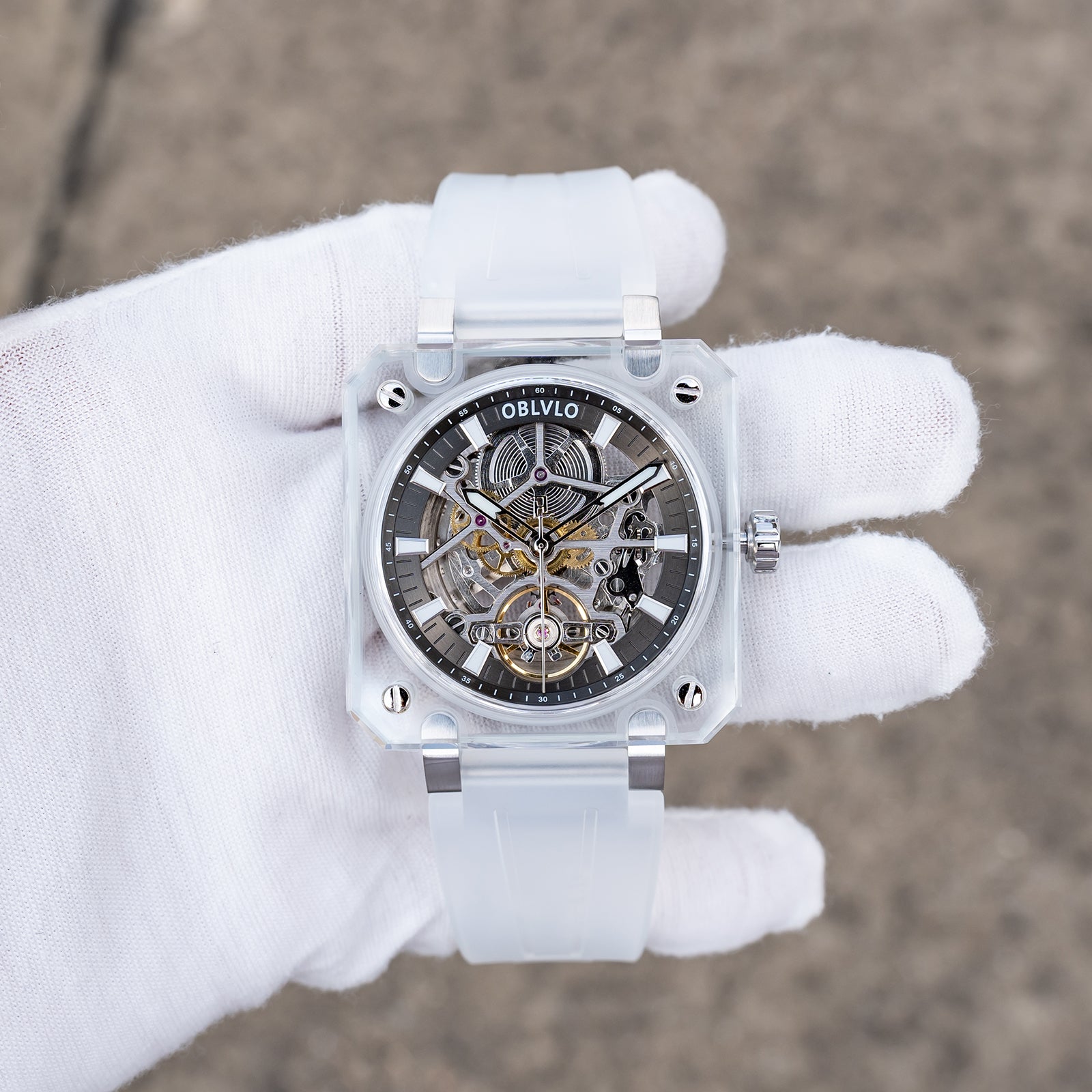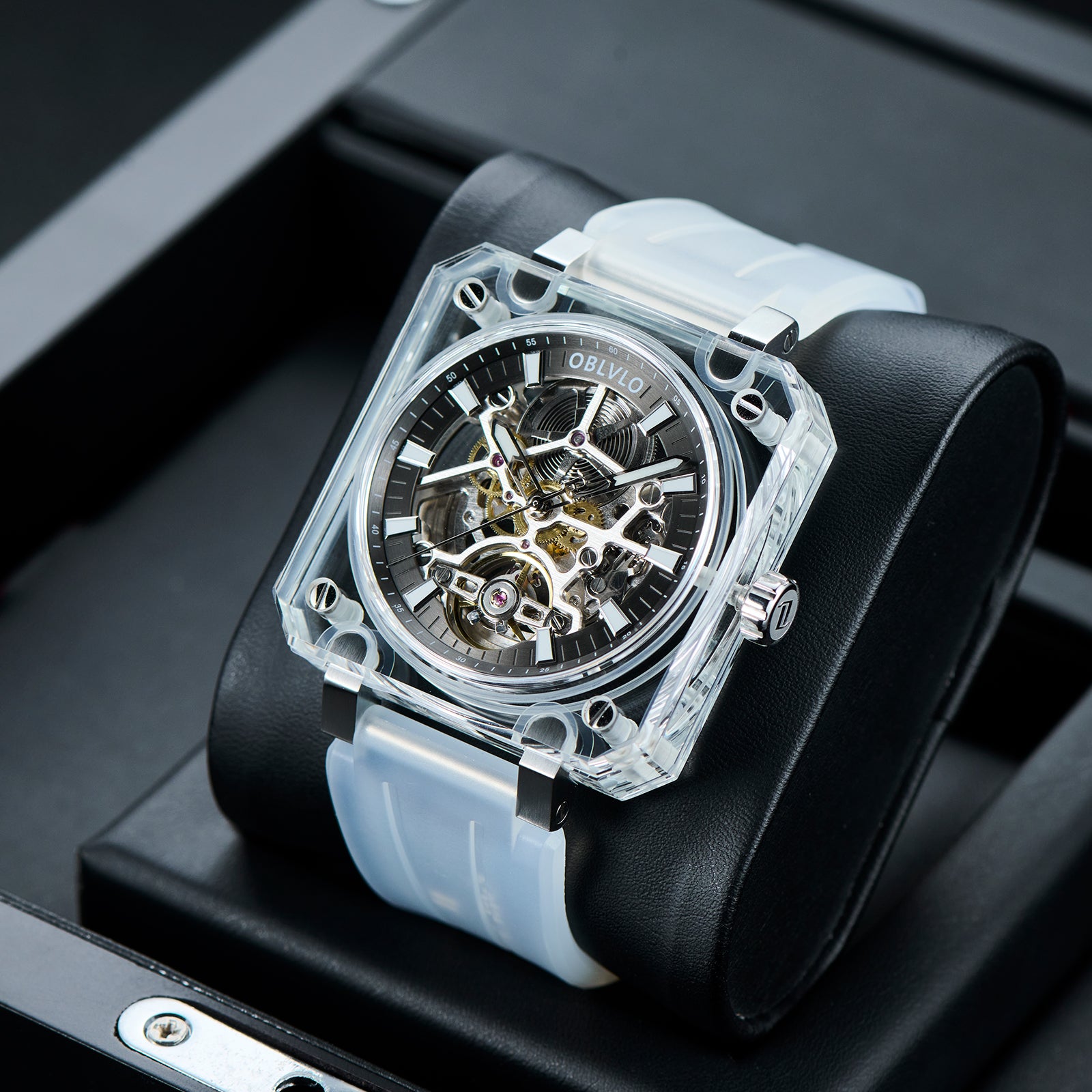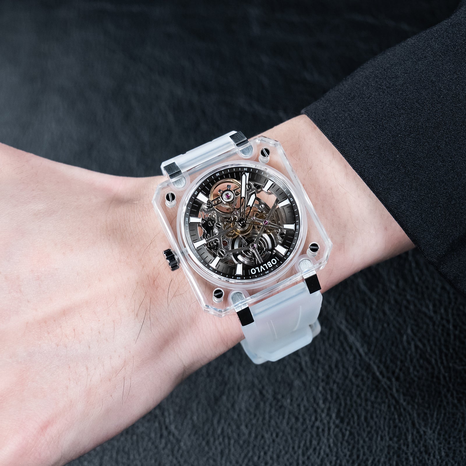 Dial Design: Black Dial & The square crystal case is paired with a hollow dial design, Fully transparent sapphire case offers a 360-degree view of the escapement, revealing the movement's breathtaking skeletonization.