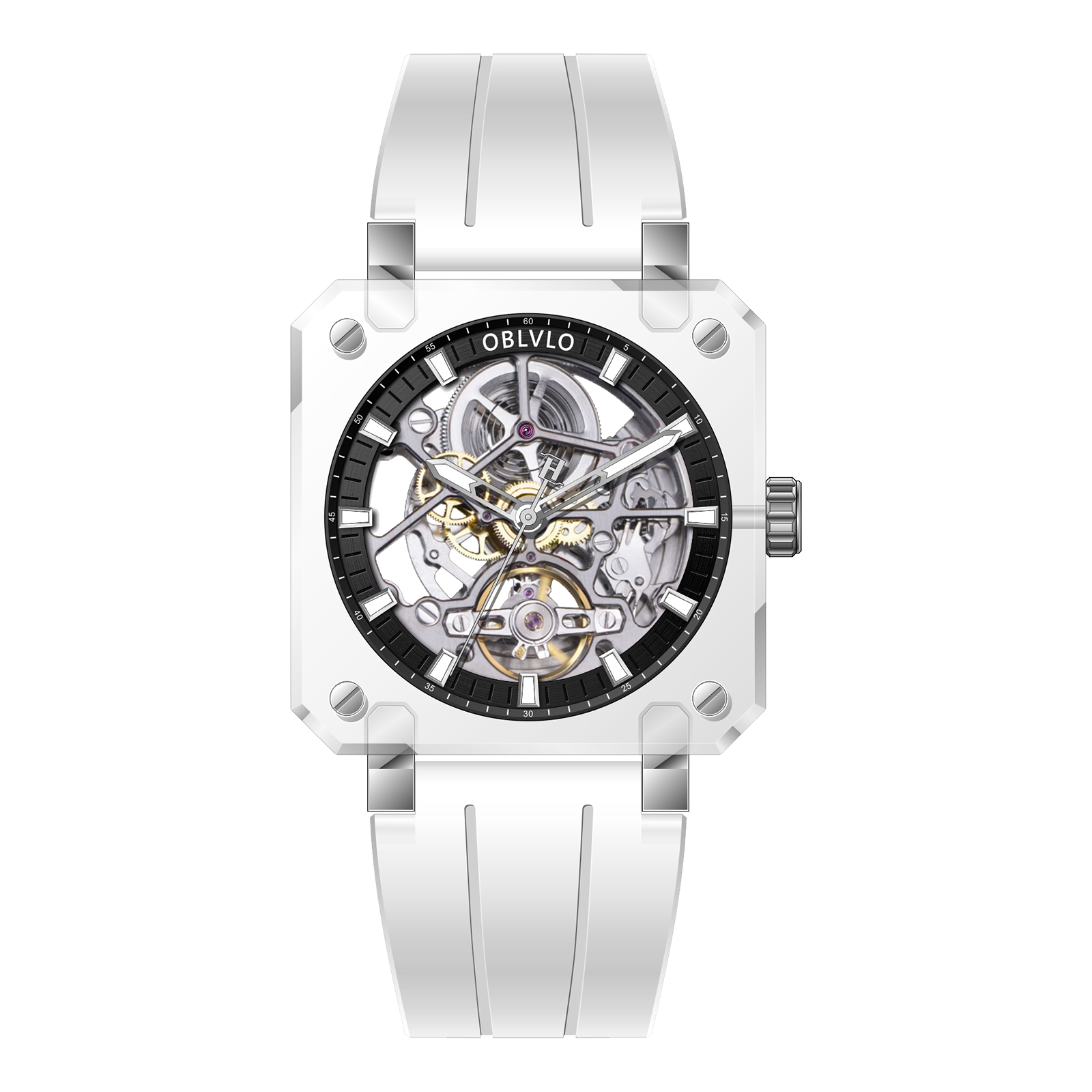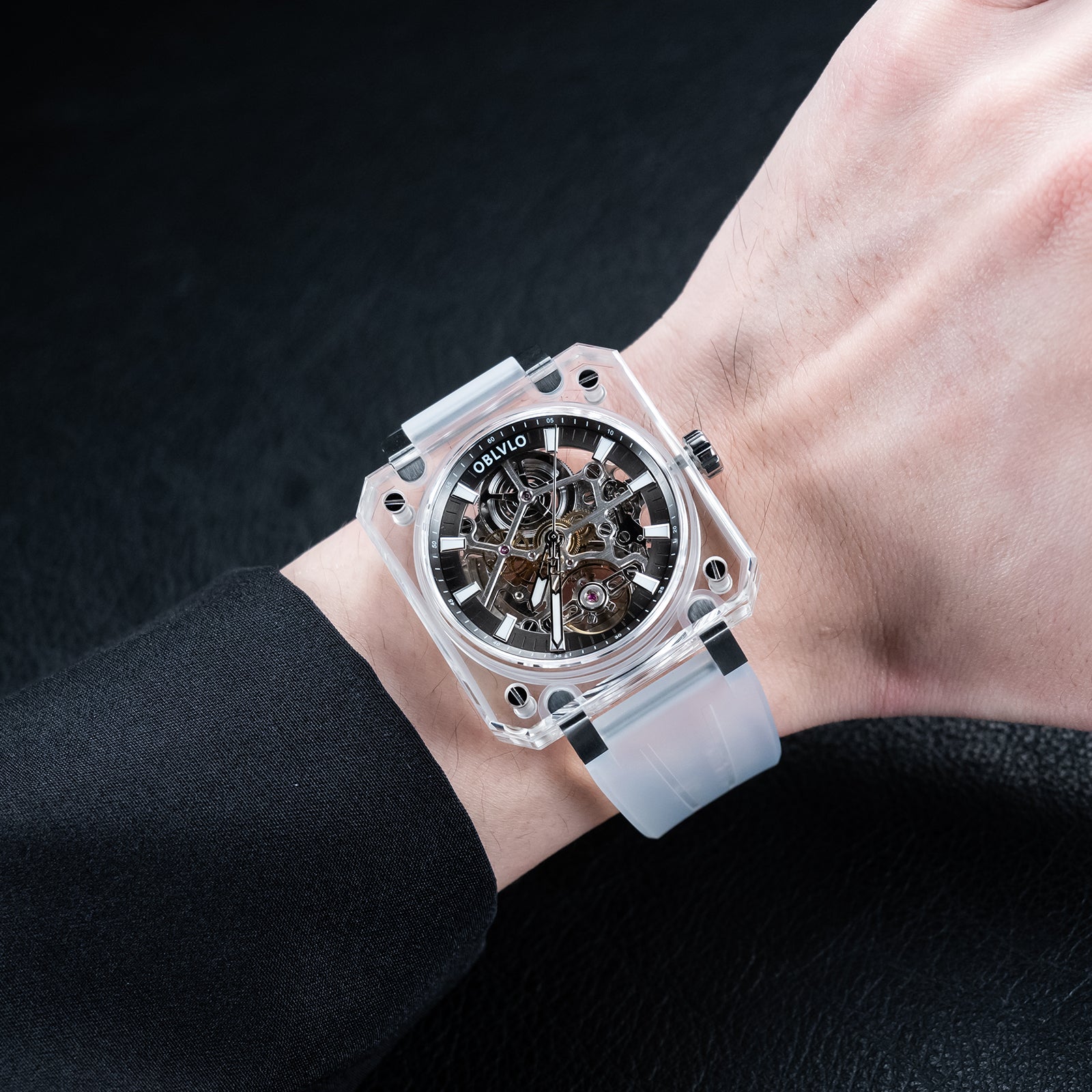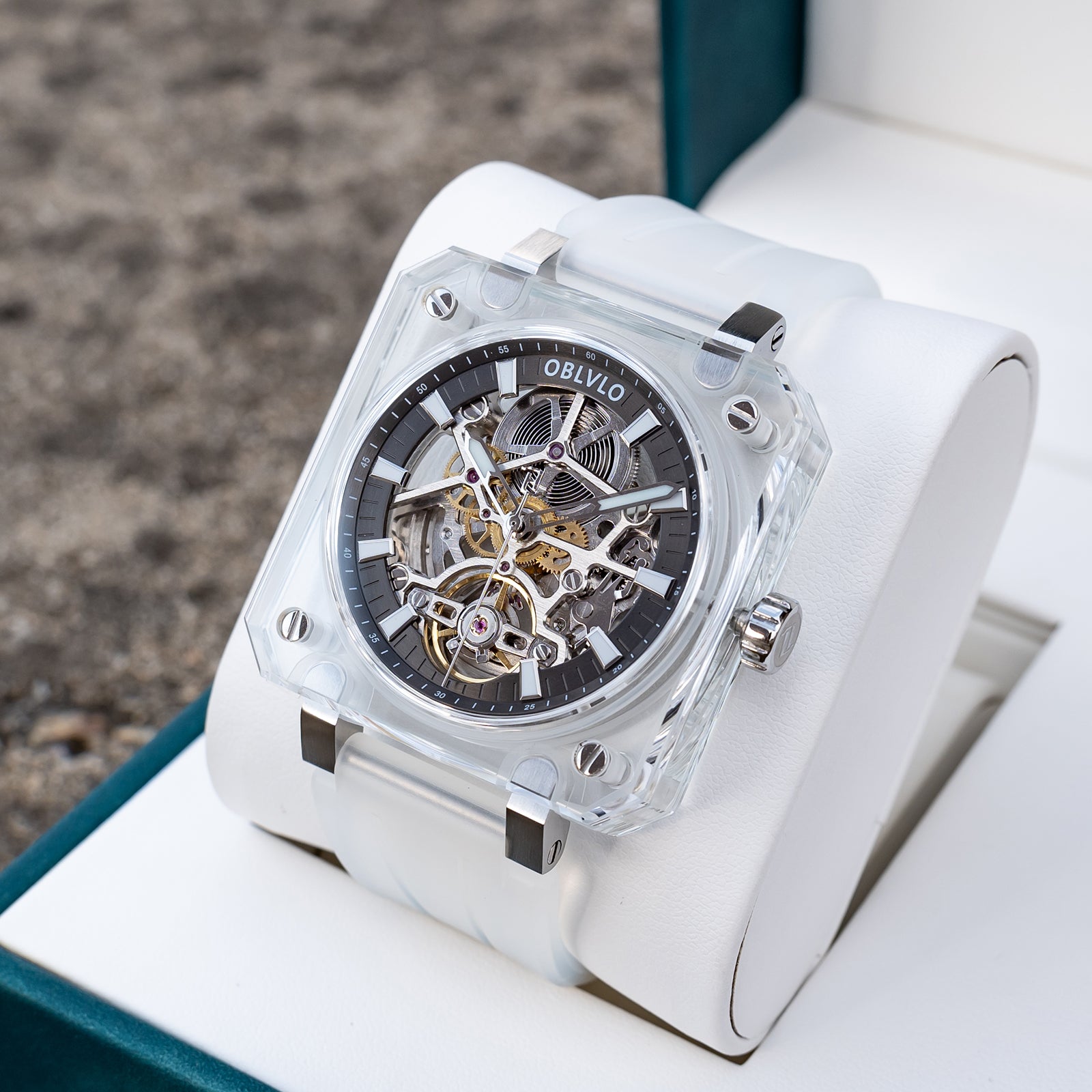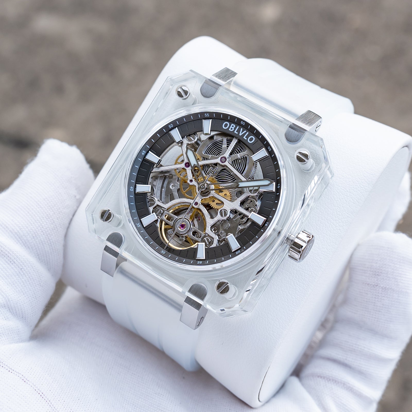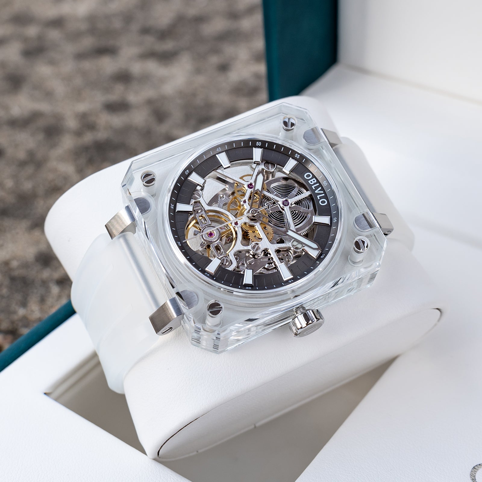 Dial Design: Black Dial & The square crystal case is paired with a hollow dial design, Fully transparent sapphire case offers a 360-degree view of the escapement, revealing the movement's breathtaking skeletonization.