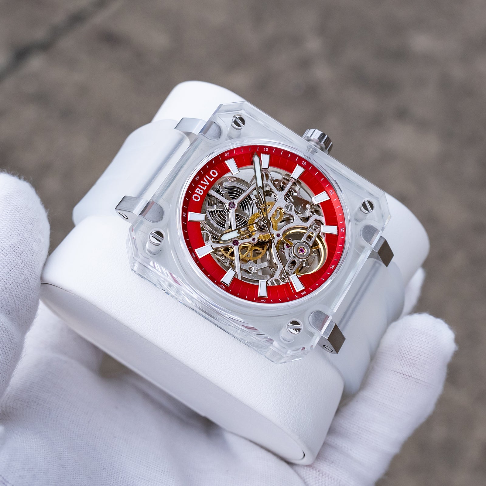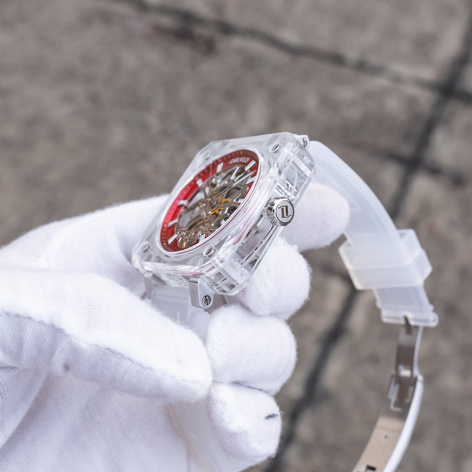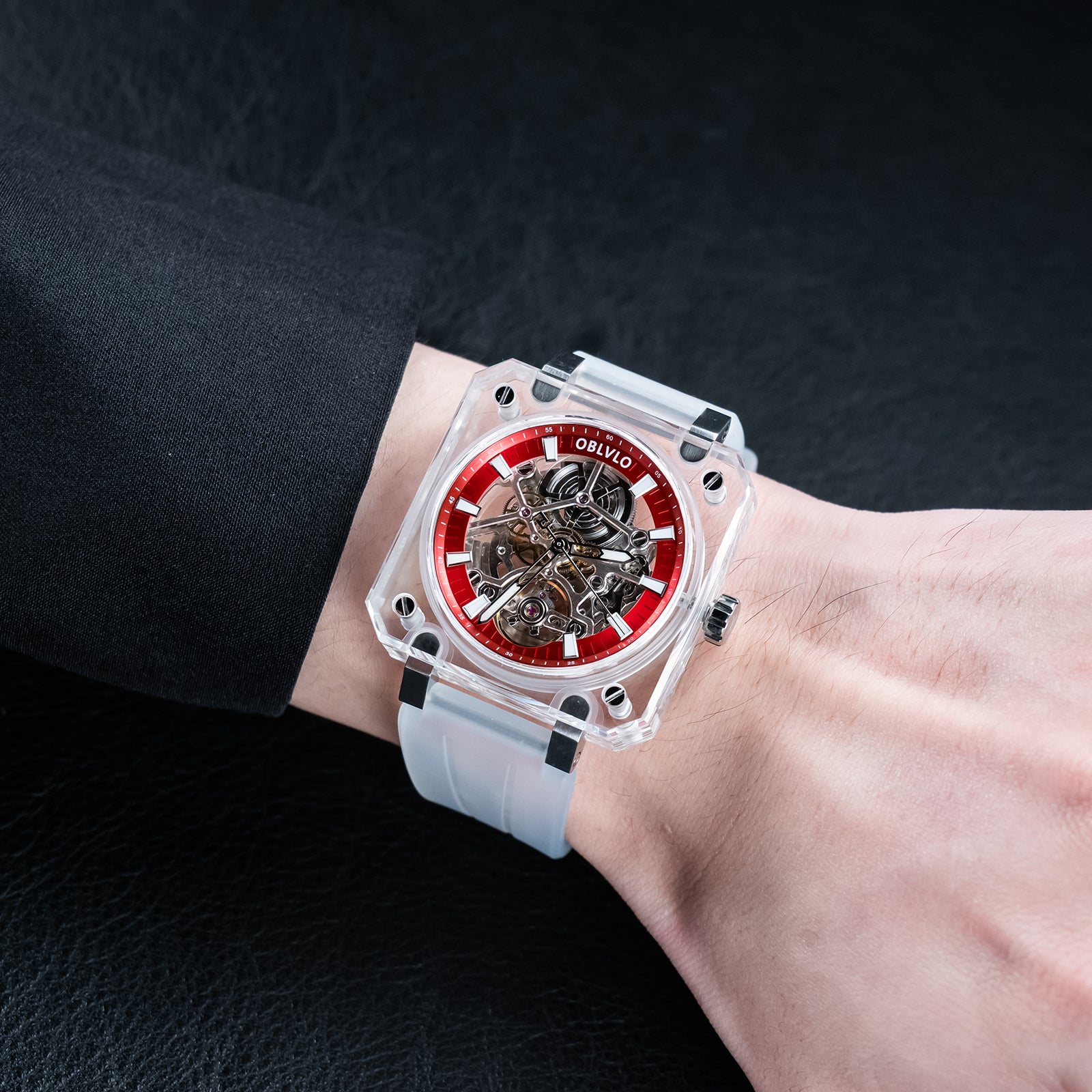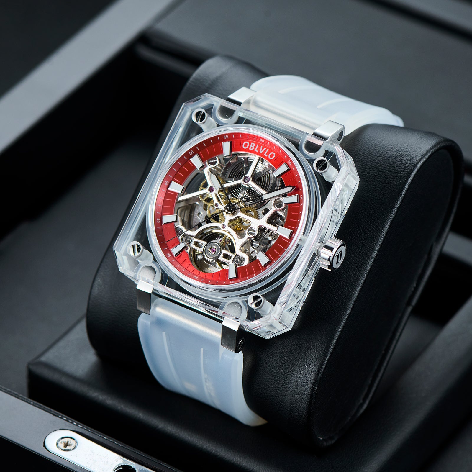 Dial Design: Red Dial & The square crystal case is paired with a hollow dial design, Fully transparent sapphire case offers a 360-degree view of the escapement, revealing the movement's breathtaking skeletonization.