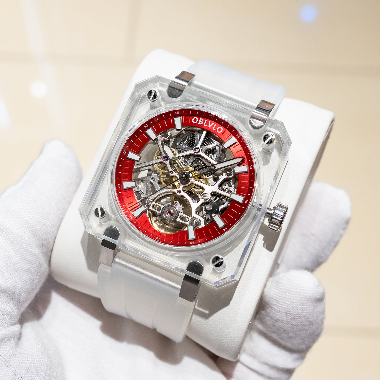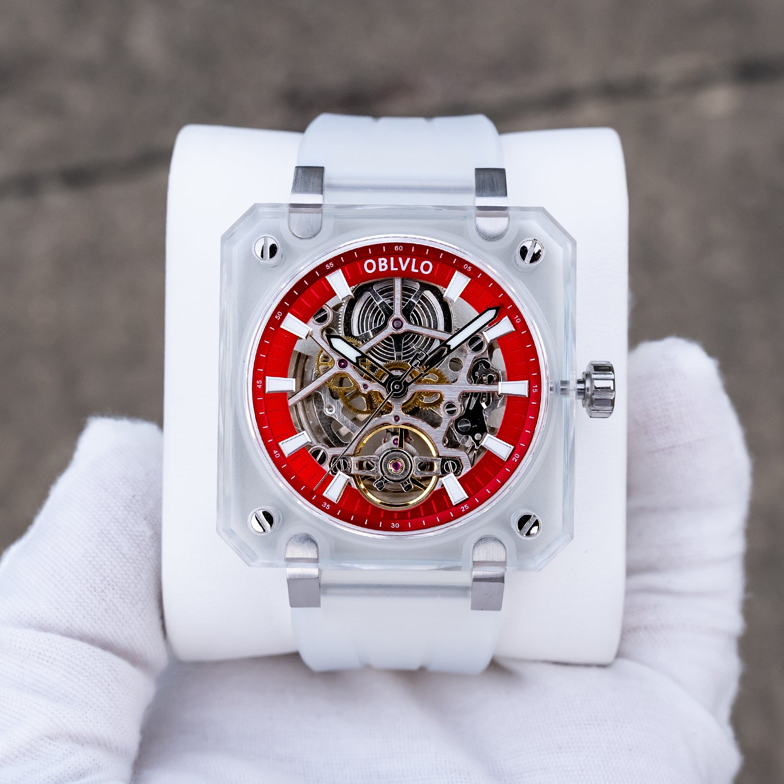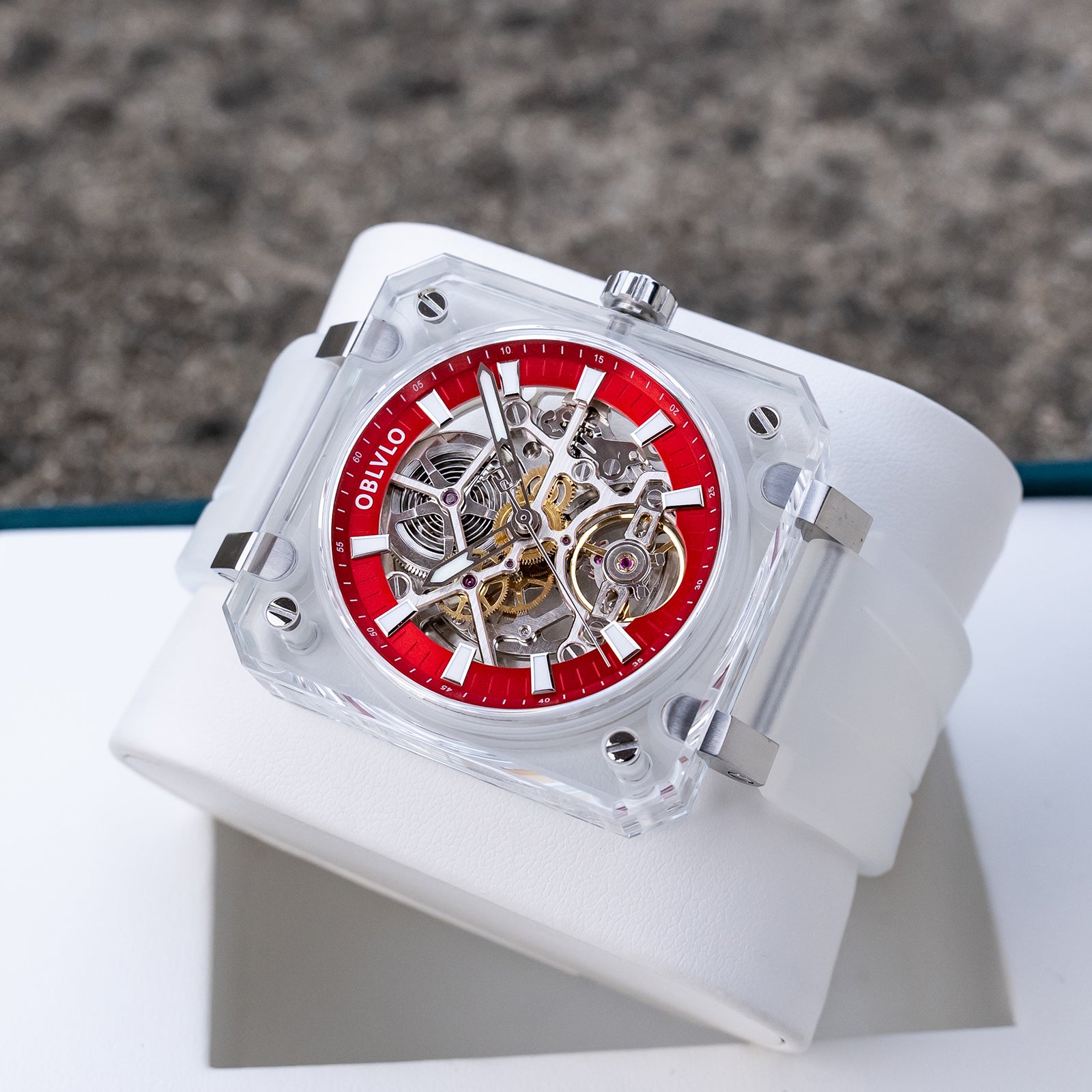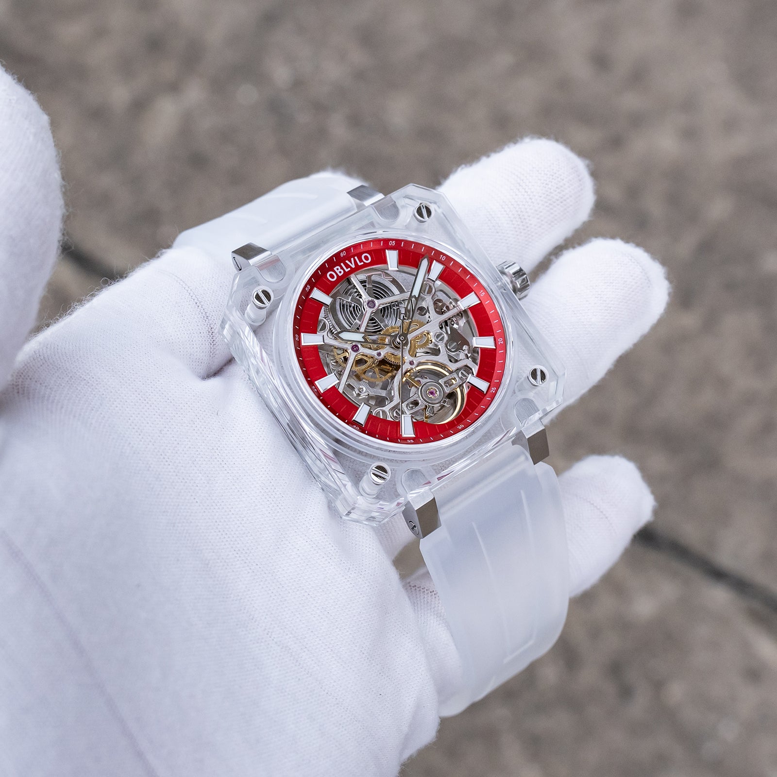 Dial Design: Red Dial & The square crystal case is paired with a hollow dial design, Fully transparent sapphire case offers a 360-degree view of the escapement, revealing the movement's breathtaking skeletonization.