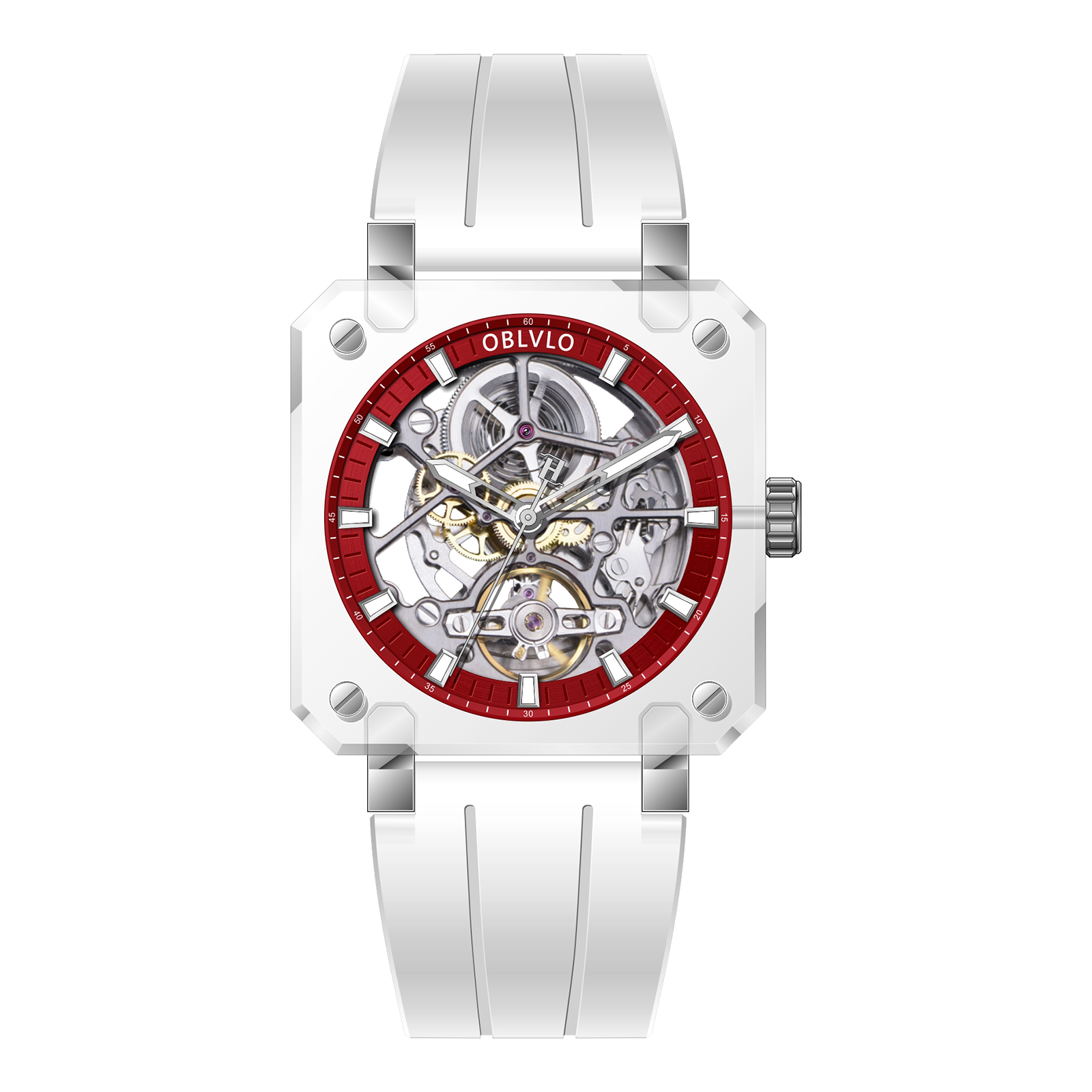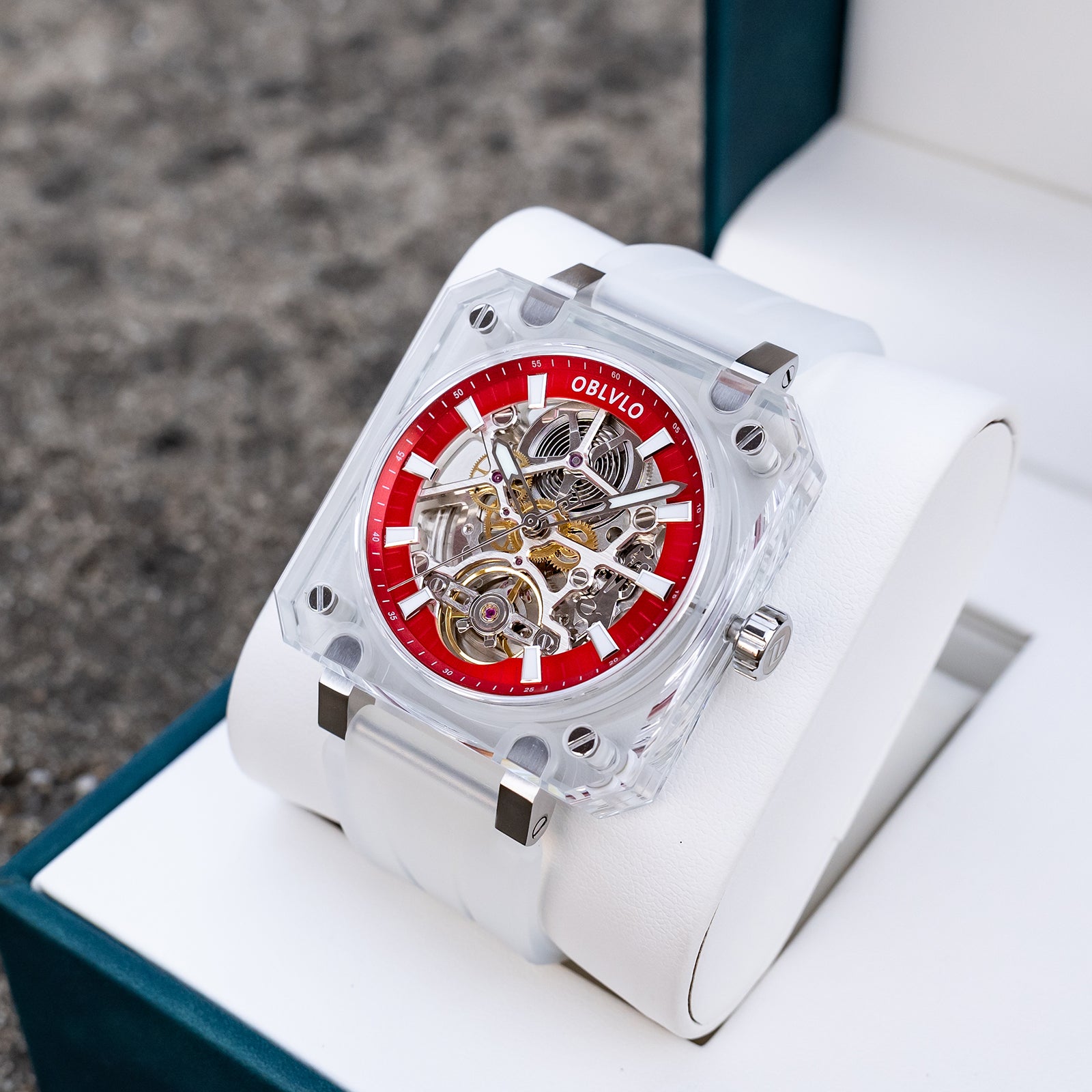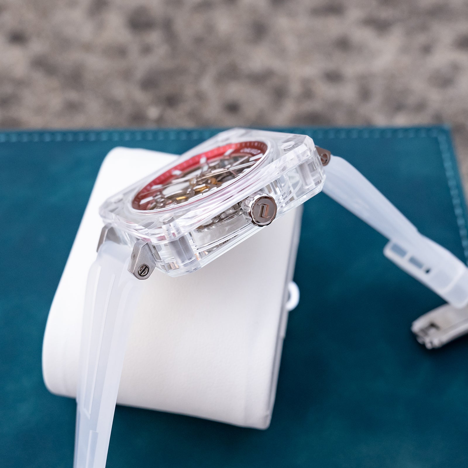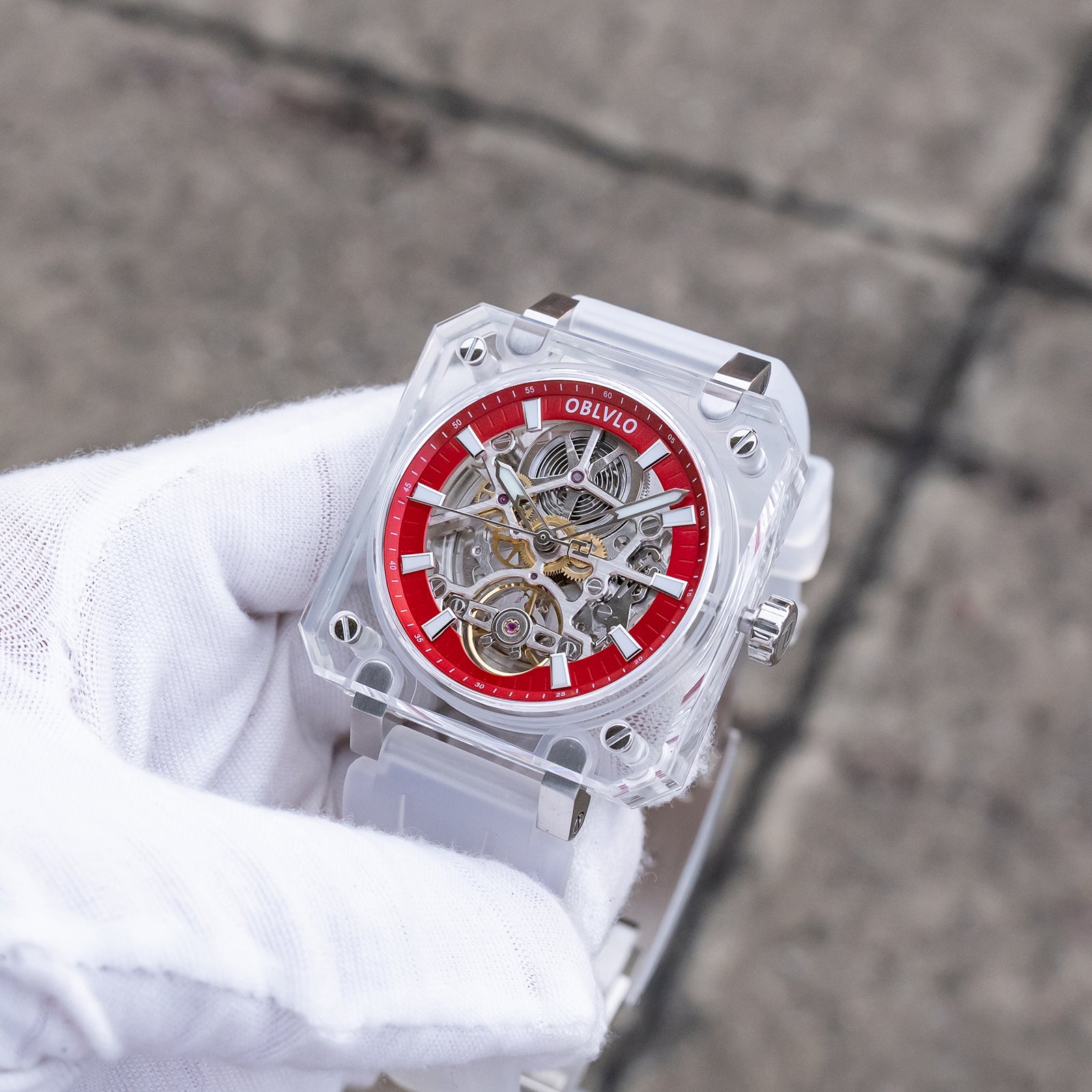 Dial Design: Red Dial & The square crystal case is paired with a hollow dial design, Fully transparent sapphire case offers a 360-degree view of the escapement, revealing the movement's breathtaking skeletonization.