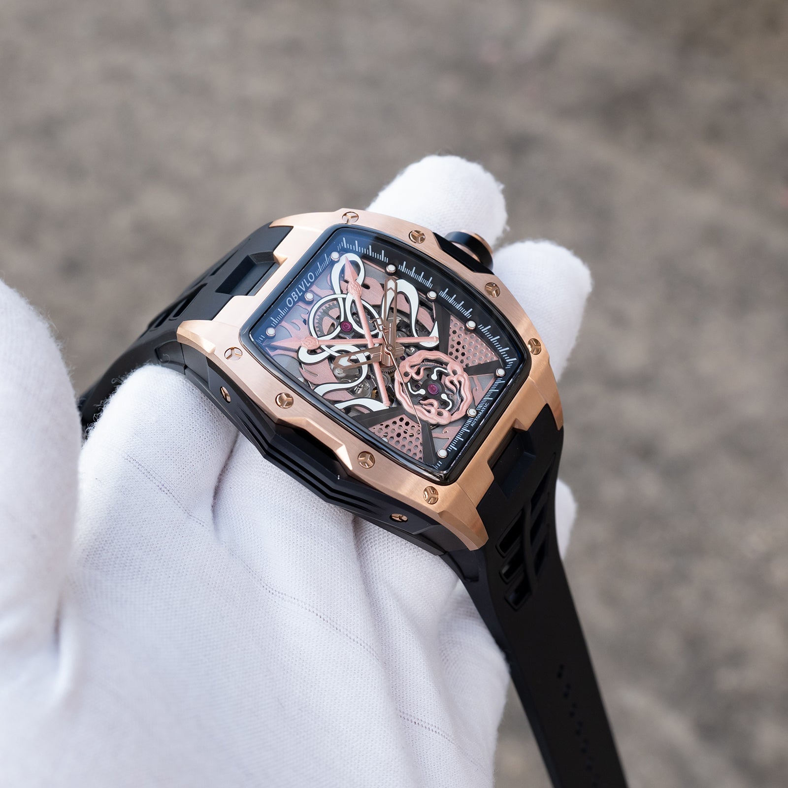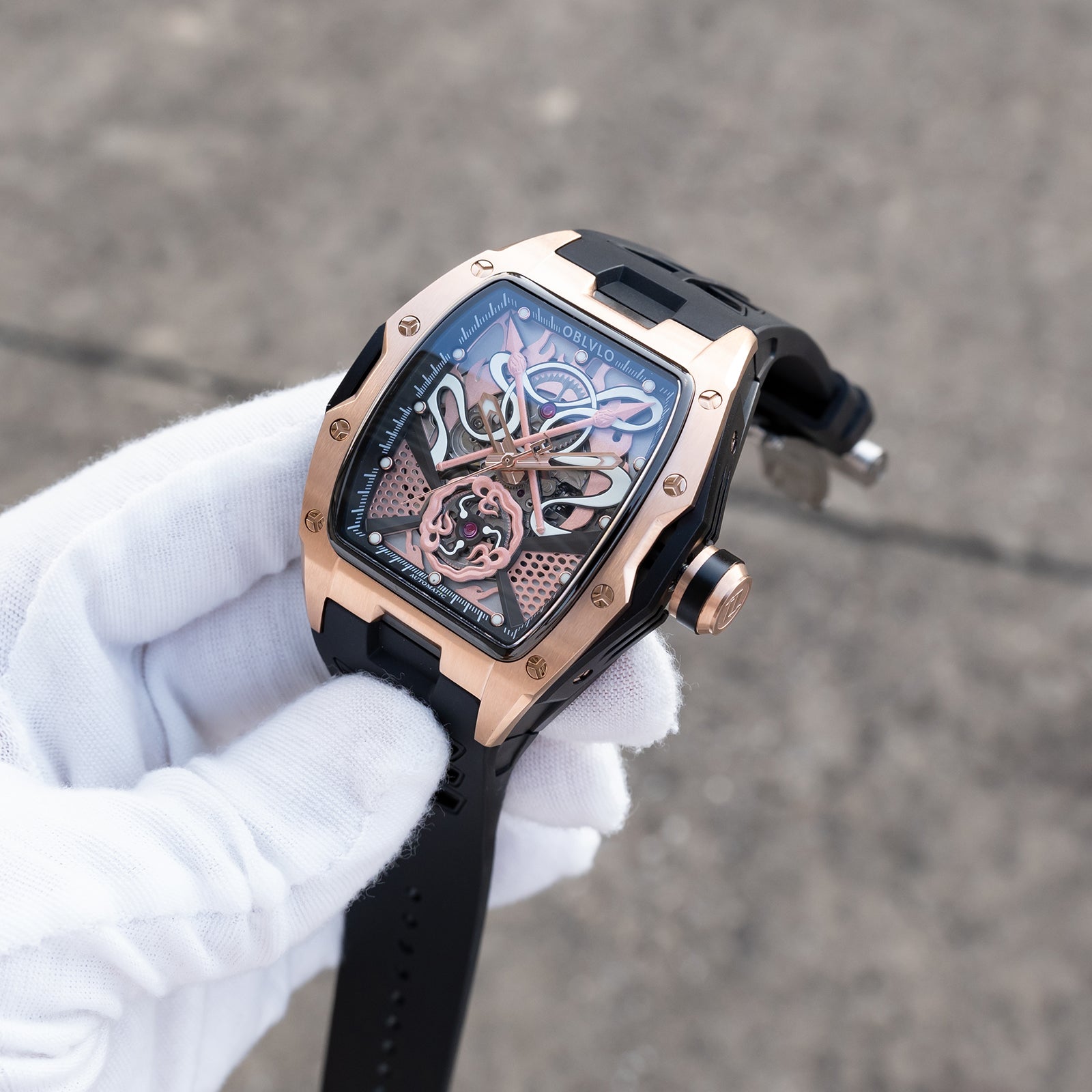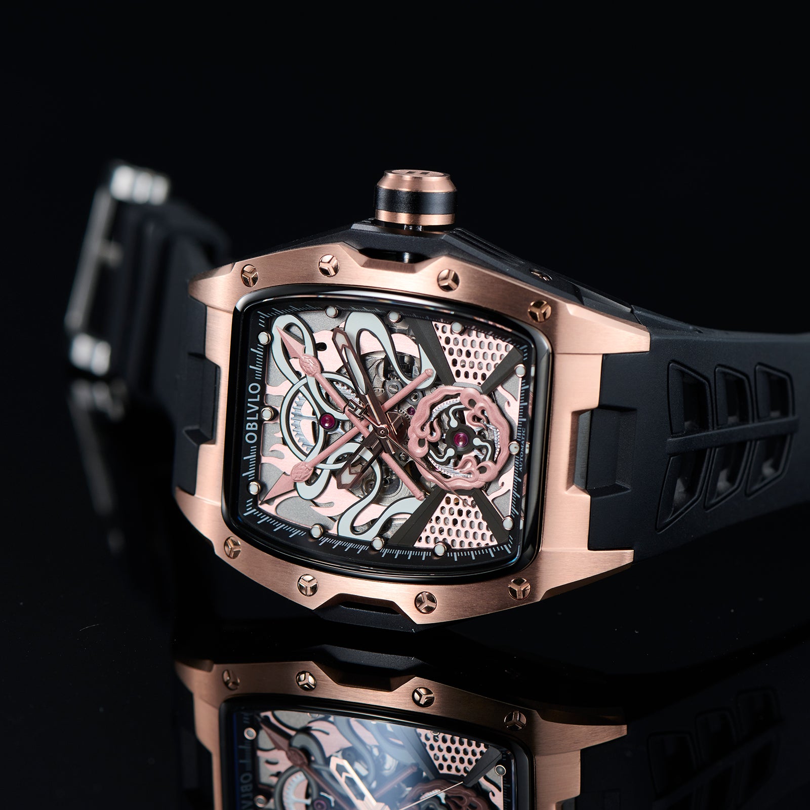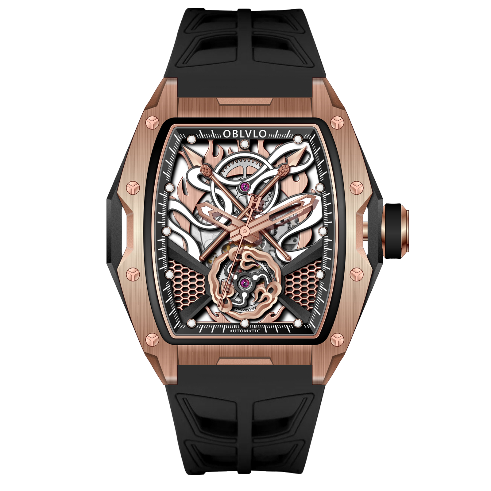 Dial Design: The design concept of the rose gold dial is derived from the Chinese myth "Nezha", which combines several treasures owned by the legend, including Qiankun Ring,Huntian Cloth,Fire-tip Spear,Wind and Fire Wheel! Sophisticated skeleton dial design showcasing intricate mechanical movement through a transparent face with honeycomb pattern details.