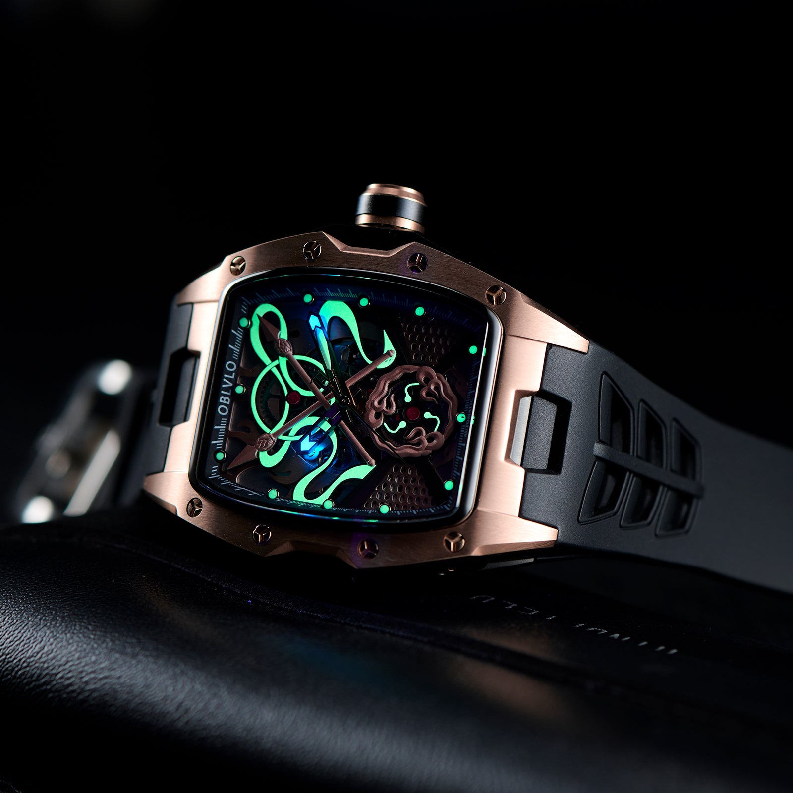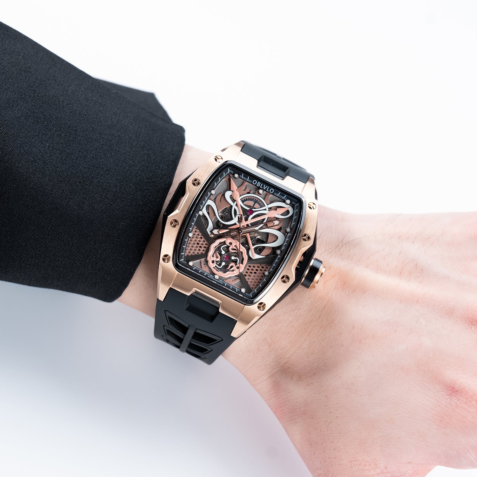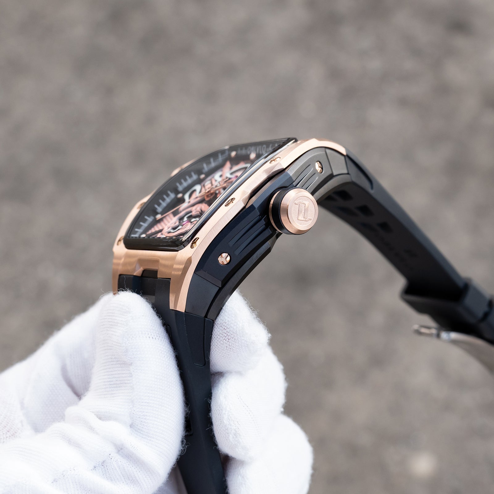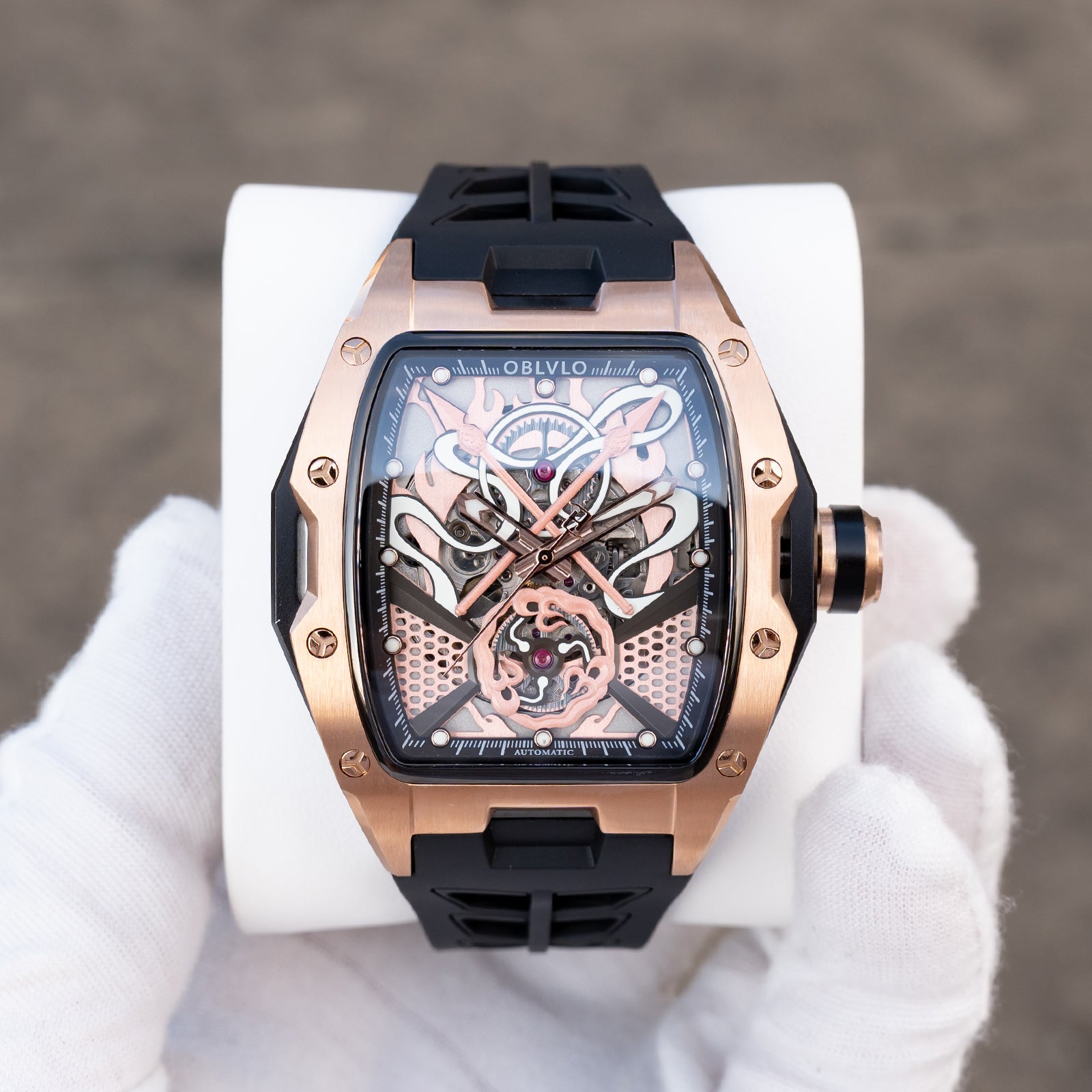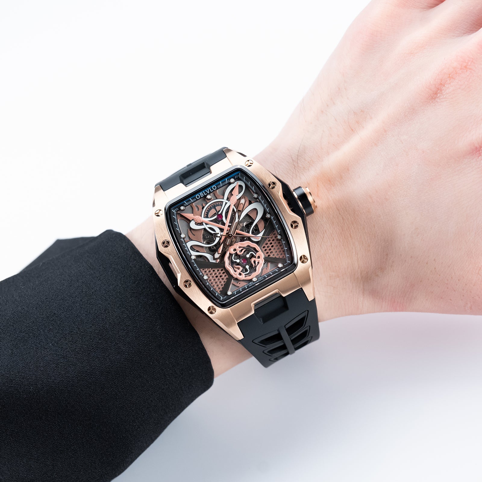 Dial Design: The design concept of the rose gold dial is derived from the Chinese myth "Nezha", which combines several treasures owned by the legend, including Qiankun Ring,Huntian Cloth,Fire-tip Spear,Wind and Fire Wheel! Sophisticated skeleton dial design showcasing intricate mechanical movement through a transparent face with honeycomb pattern details.