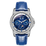 Dial Design: Blue Dial & Watch face is designed with year, month, date, day, 6 hours day/night/24 hours instruction & moonphase style, luminous hands display. White/Blue Color Zirconia and Diamond inlay collocation multifunctional dial, highlight charm, shine extraordinary brilliance.