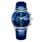 Enhancing the elegance of the watch is the glass face made of scratch-resistant sapphire crystal, providing a clear view of the intricate dial and ensuring long-lasting durability. The strap of the watch is crafted from luxurious Blue Italian Calfskin, adding a touch of refinement and comfort to the overall design.