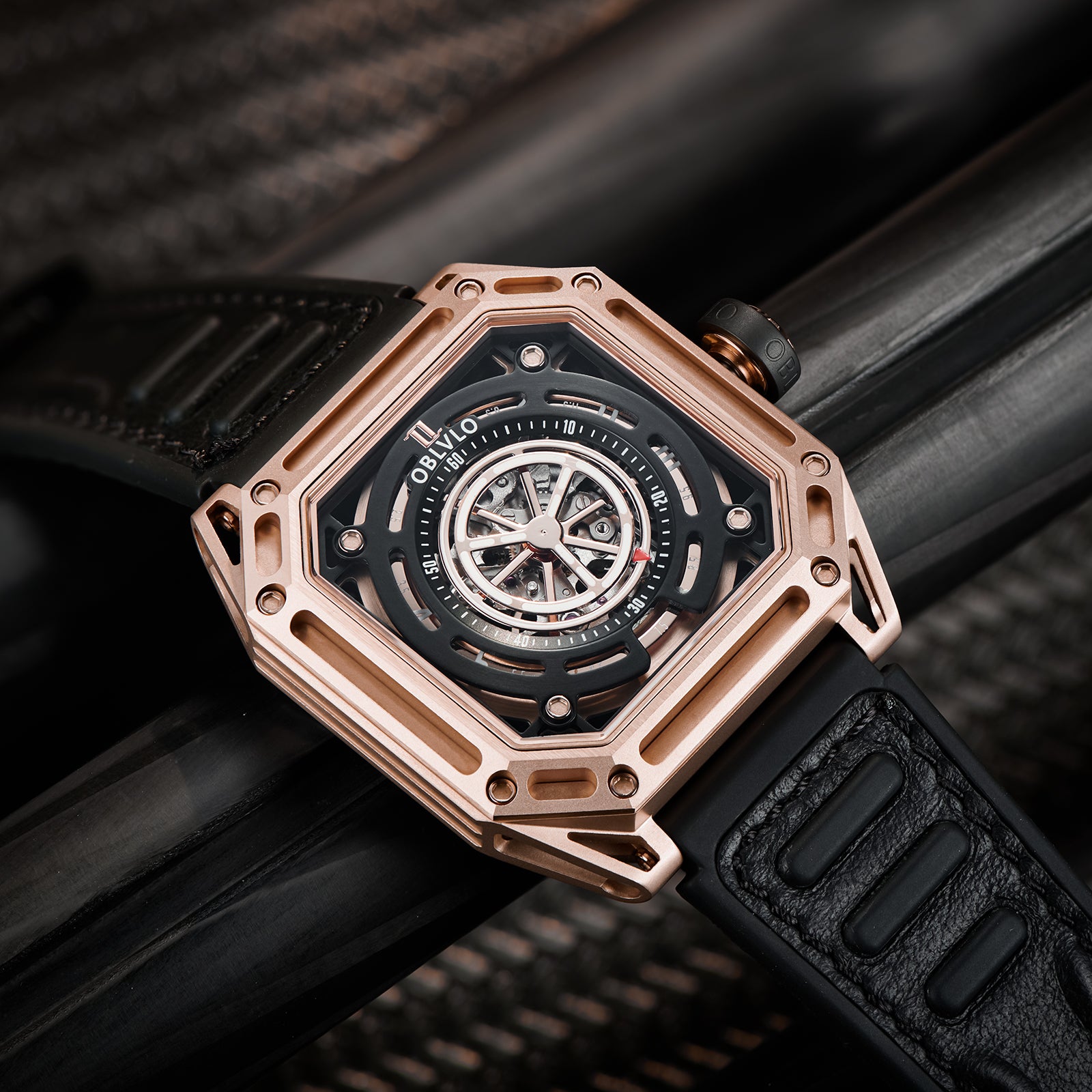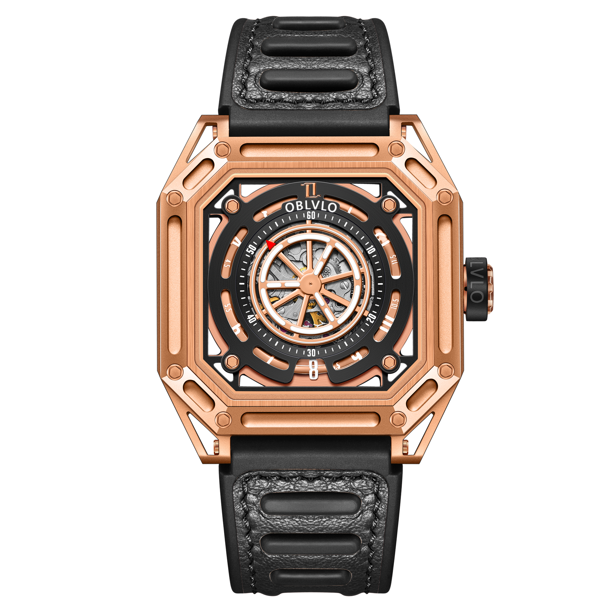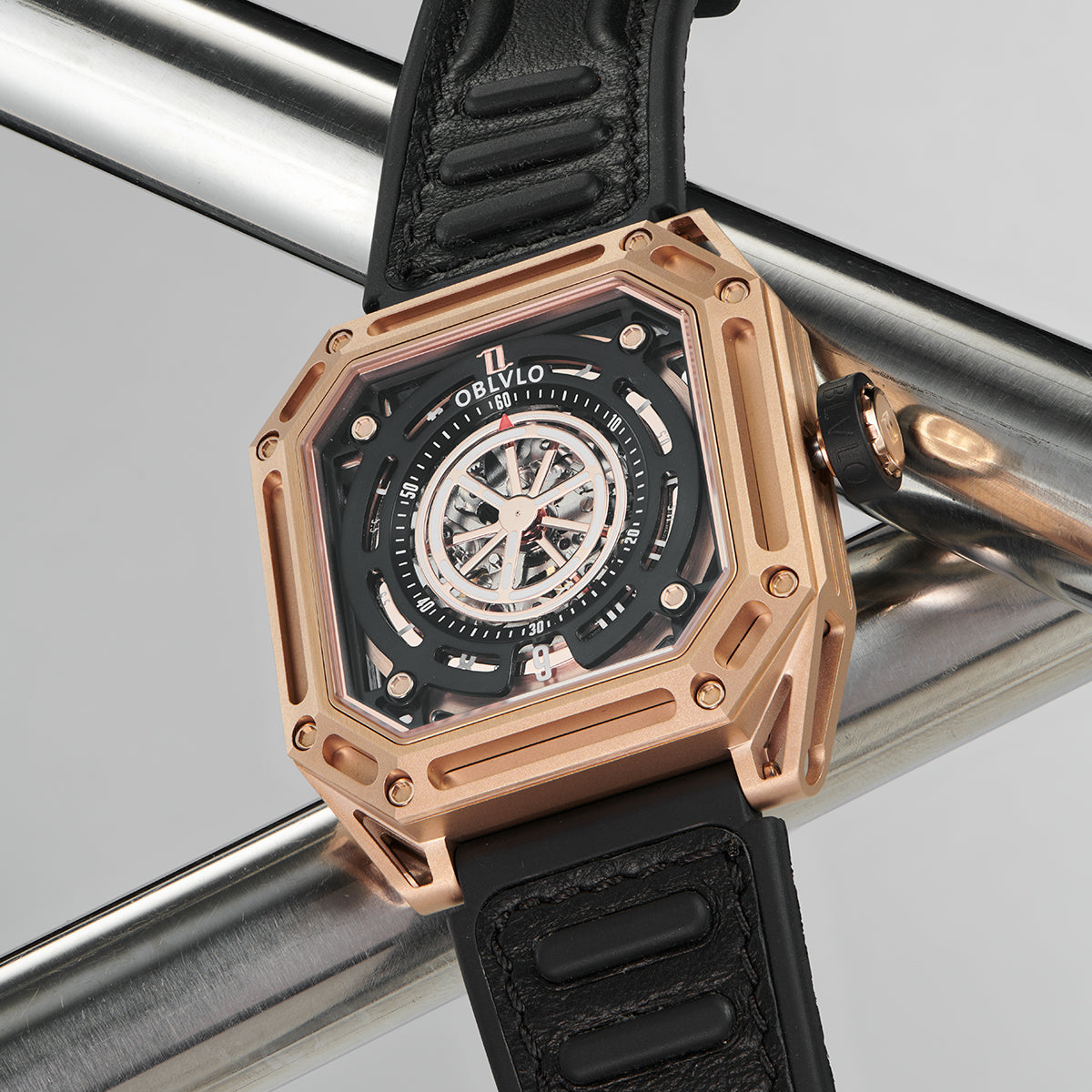 The OBLVLO AK-S Series made with 316 Stainless Steel & Bezel Plated With Rose Gold Case.What sets these skeleton sport military watches apart is their perfect blend of style and practicality. They are designed with strong materials that can handle whatever challenges you may face during your outdoor adventures. Whether you're climbing mountains, hiking through rugged terrains, or engaging in any other physically demanding activities, these watches will be able to keep up with you every step of the way.