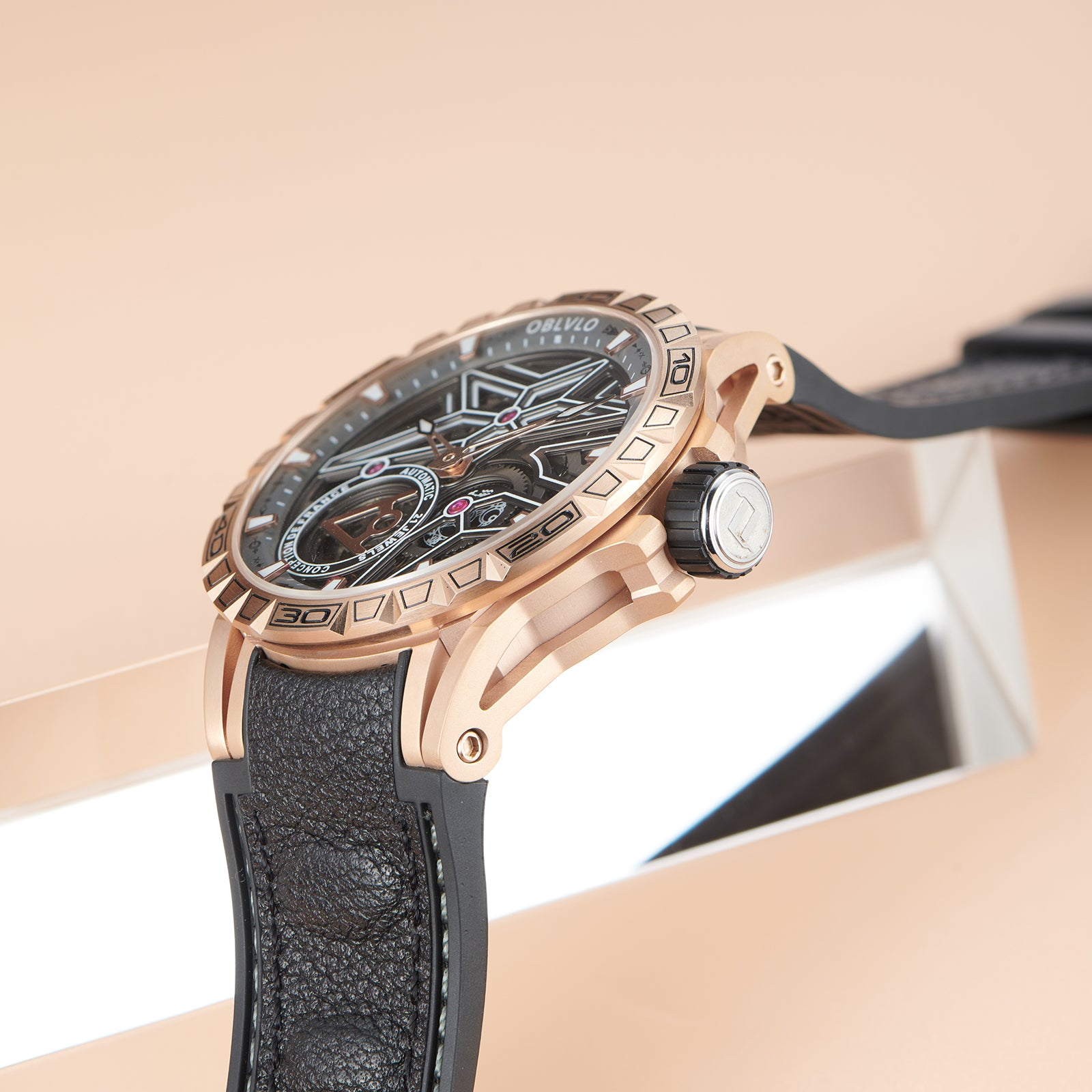 The Rose Gold OBLVLO LMQ showcases a meticulously crafted round cas made from durable 316 stainless steel, plated elegantly with rose gold. This exquisite finish not only lends a touch of sophistication but also ensures resilience against daily wear. Measuring 42mm in diameter and 12.5mm in thickness, it strikes the perfect balance between boldness and wearability, making it suitable for a variety of occasions—formal or casual.