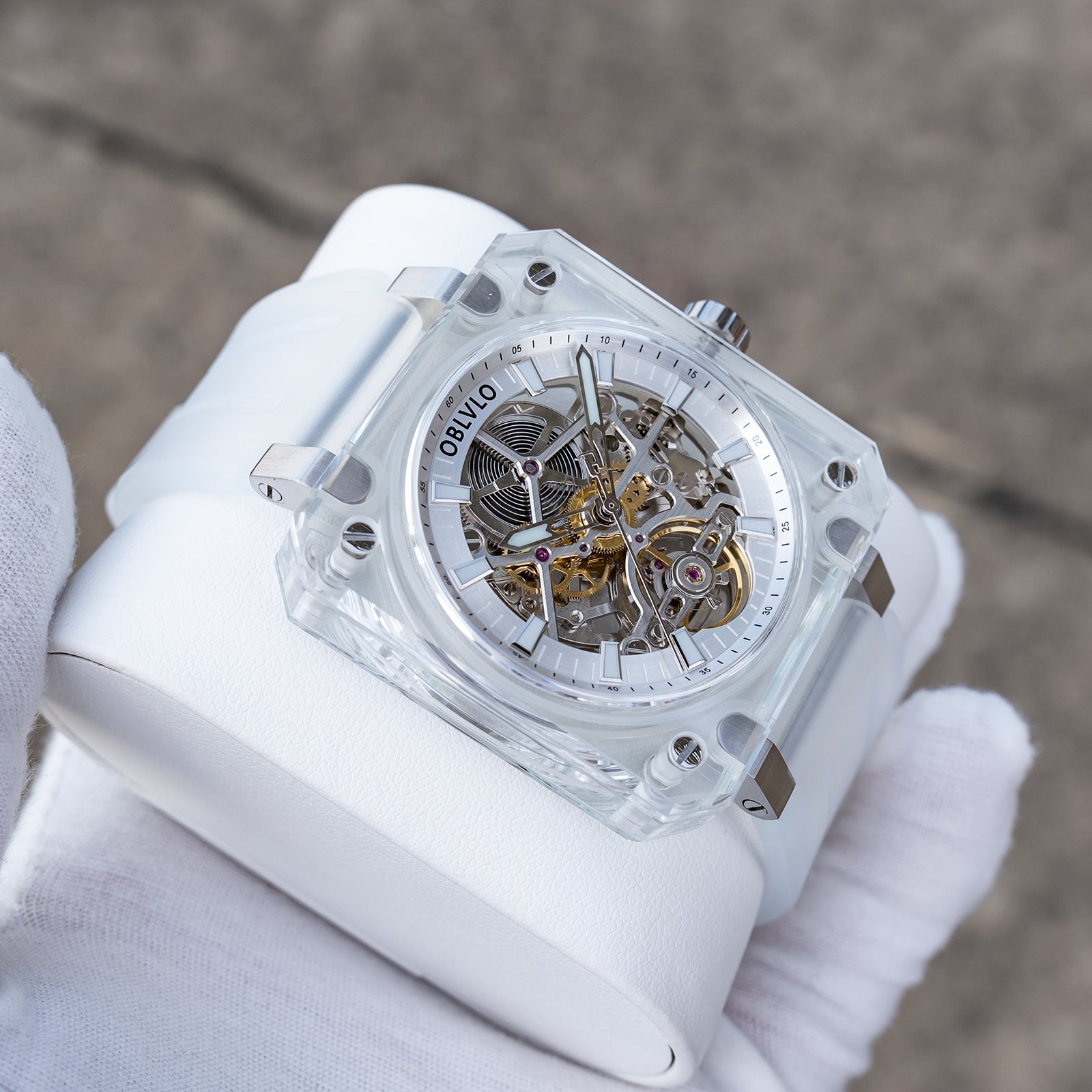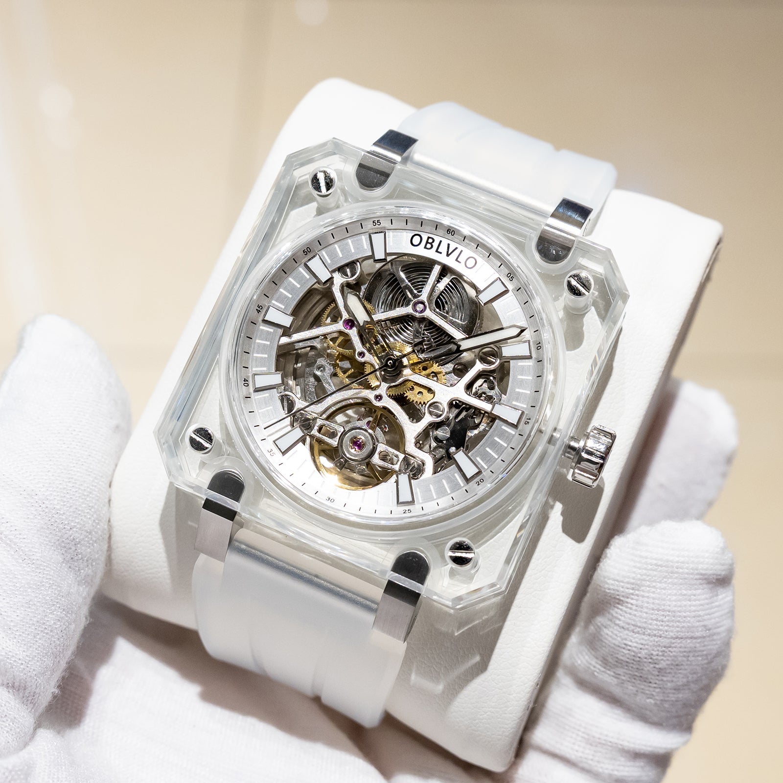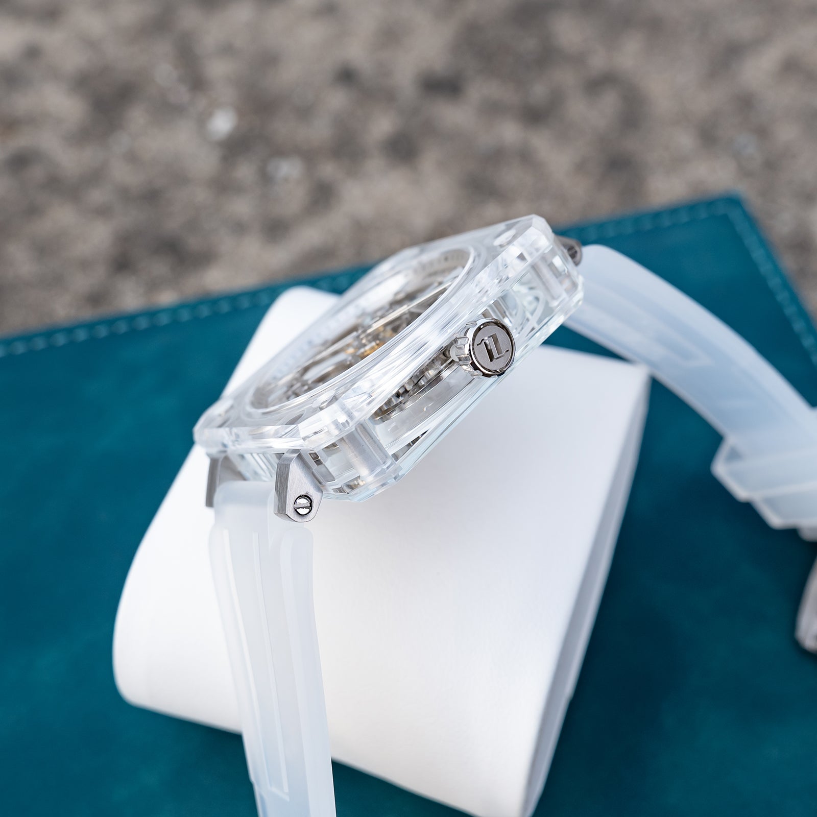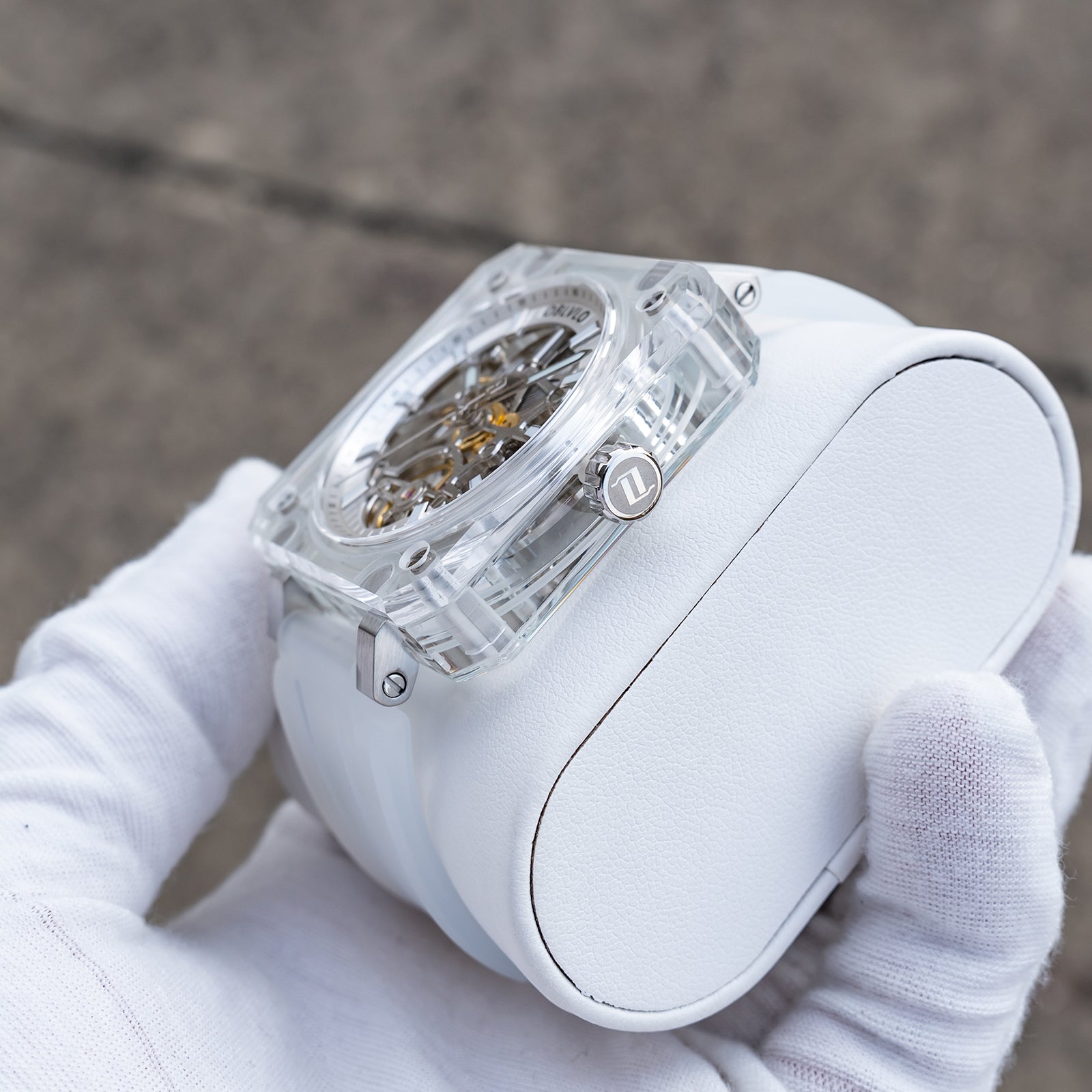 Dial Design: Silver Dial & The square crystal case is paired with a hollow dial design, Fully transparent sapphire case offers a 360-degree view of the escapement, revealing the movement's breathtaking skeletonization.