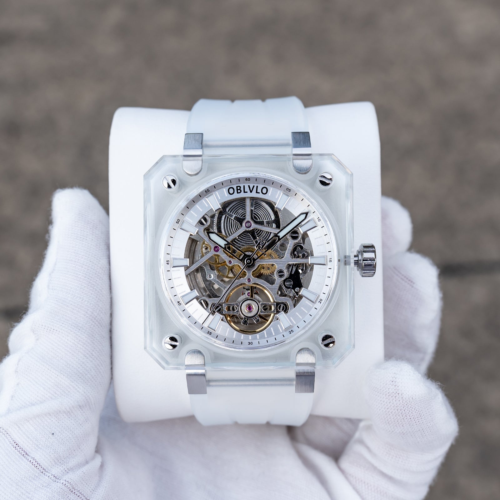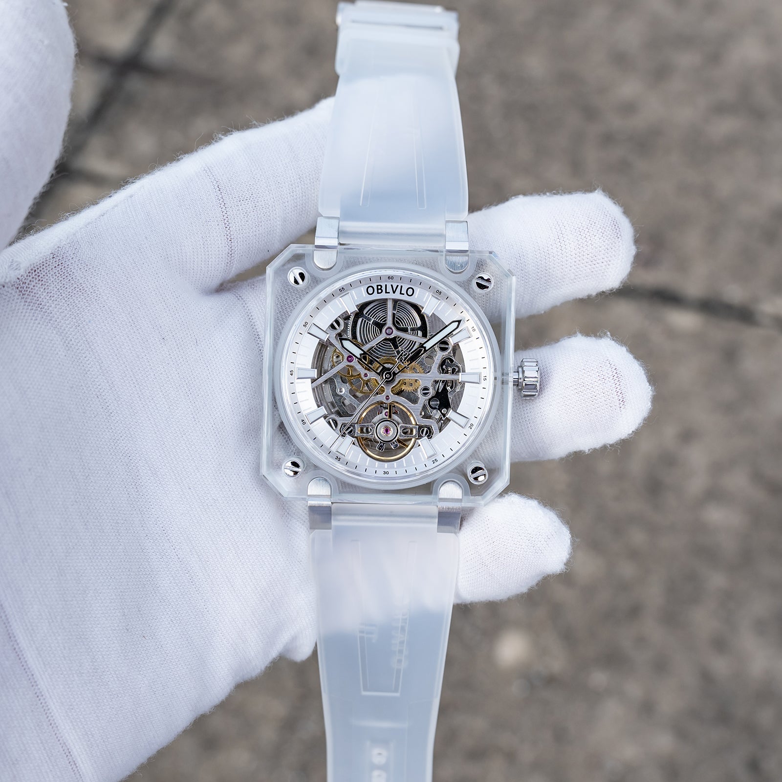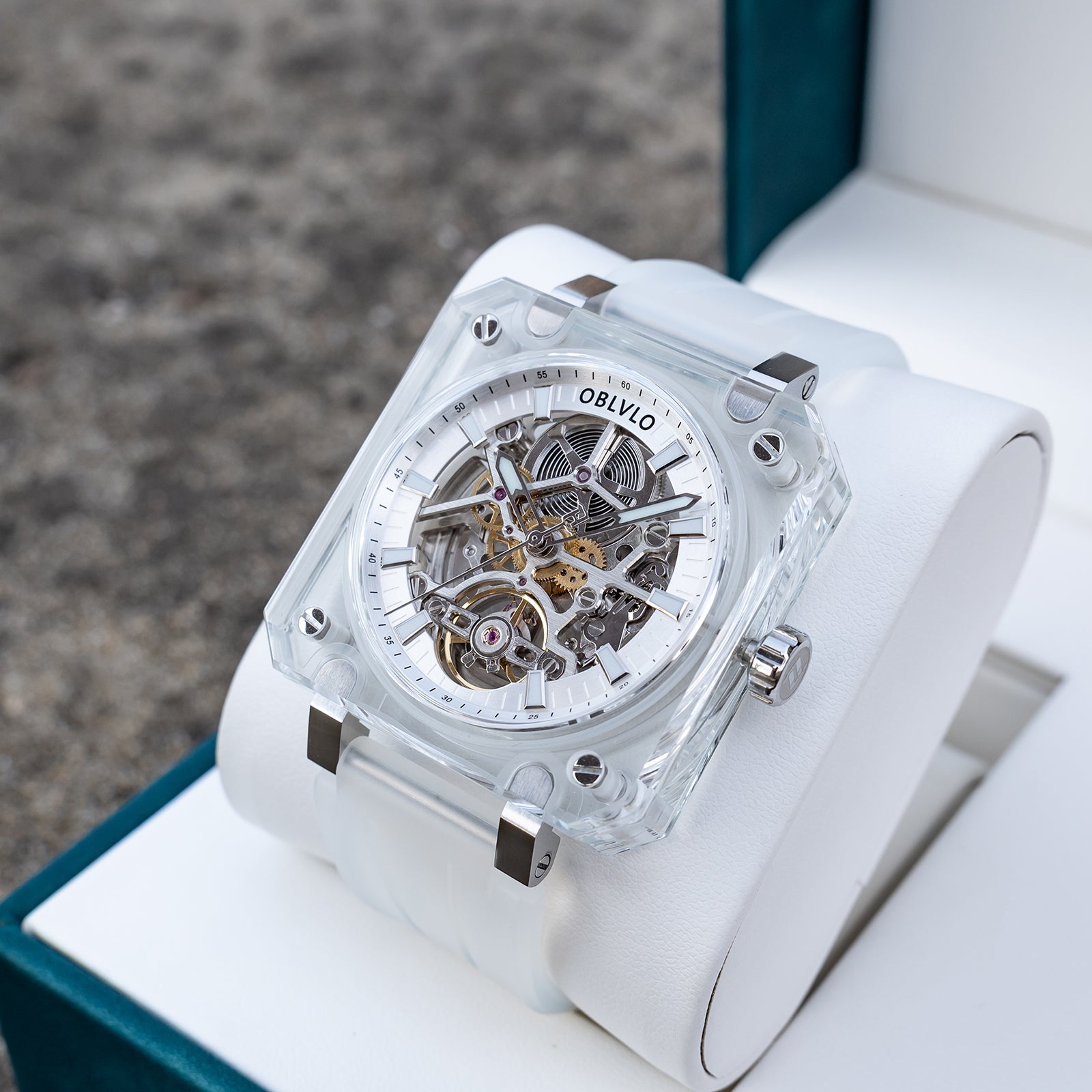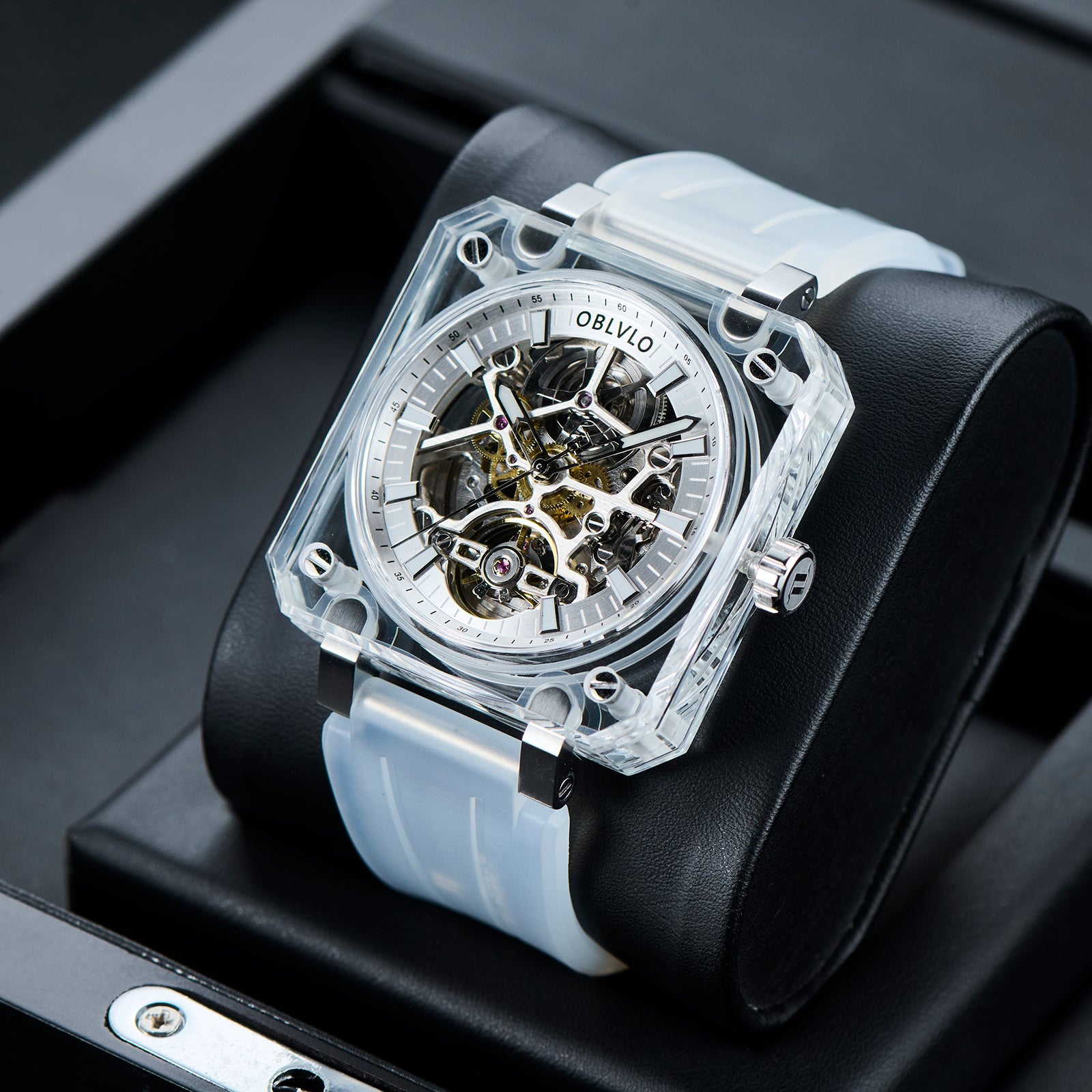 Dial Design: Silver Dial & The square crystal case is paired with a hollow dial design, Fully transparent sapphire case offers a 360-degree view of the escapement, revealing the movement's breathtaking skeletonization.